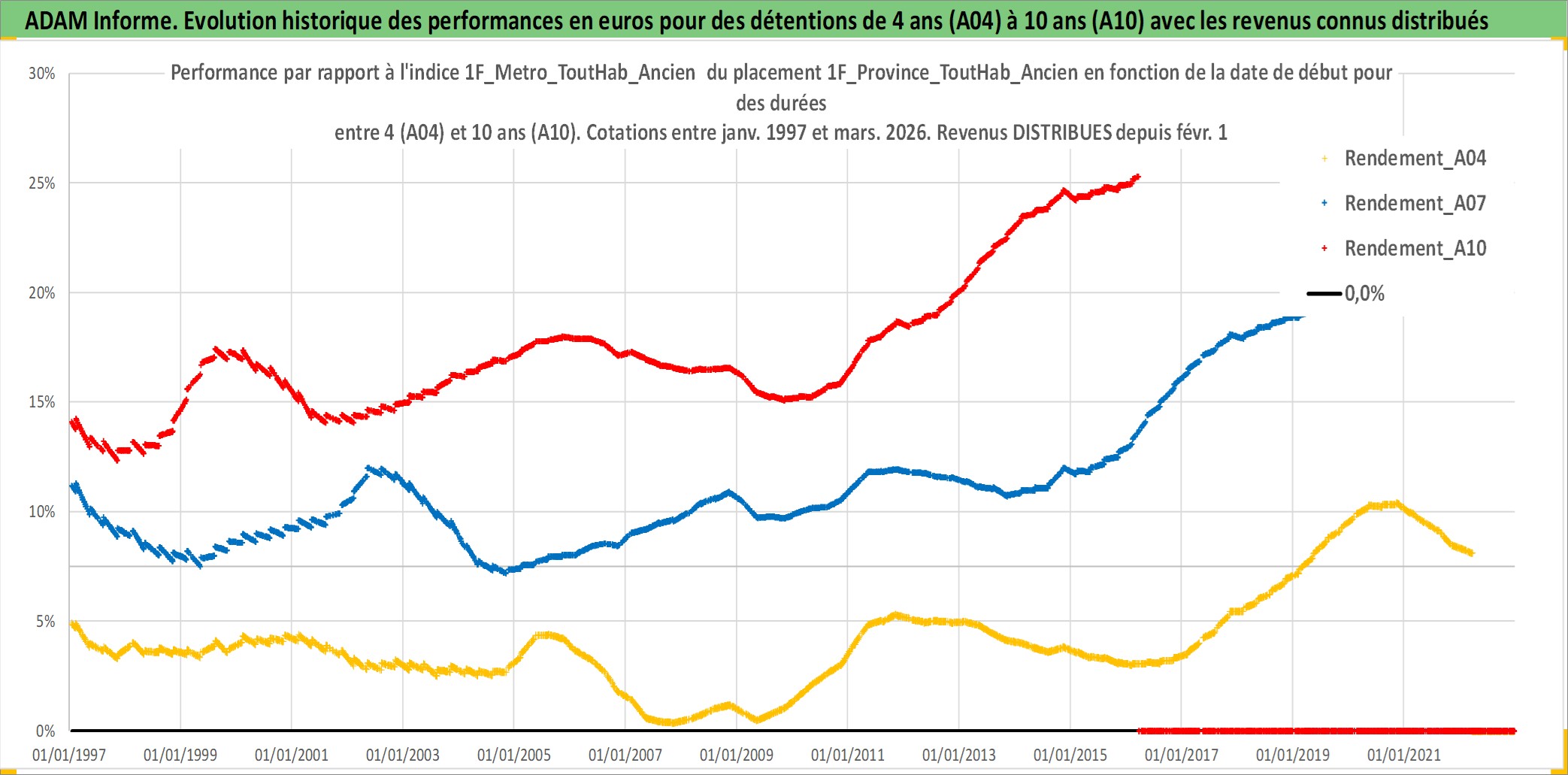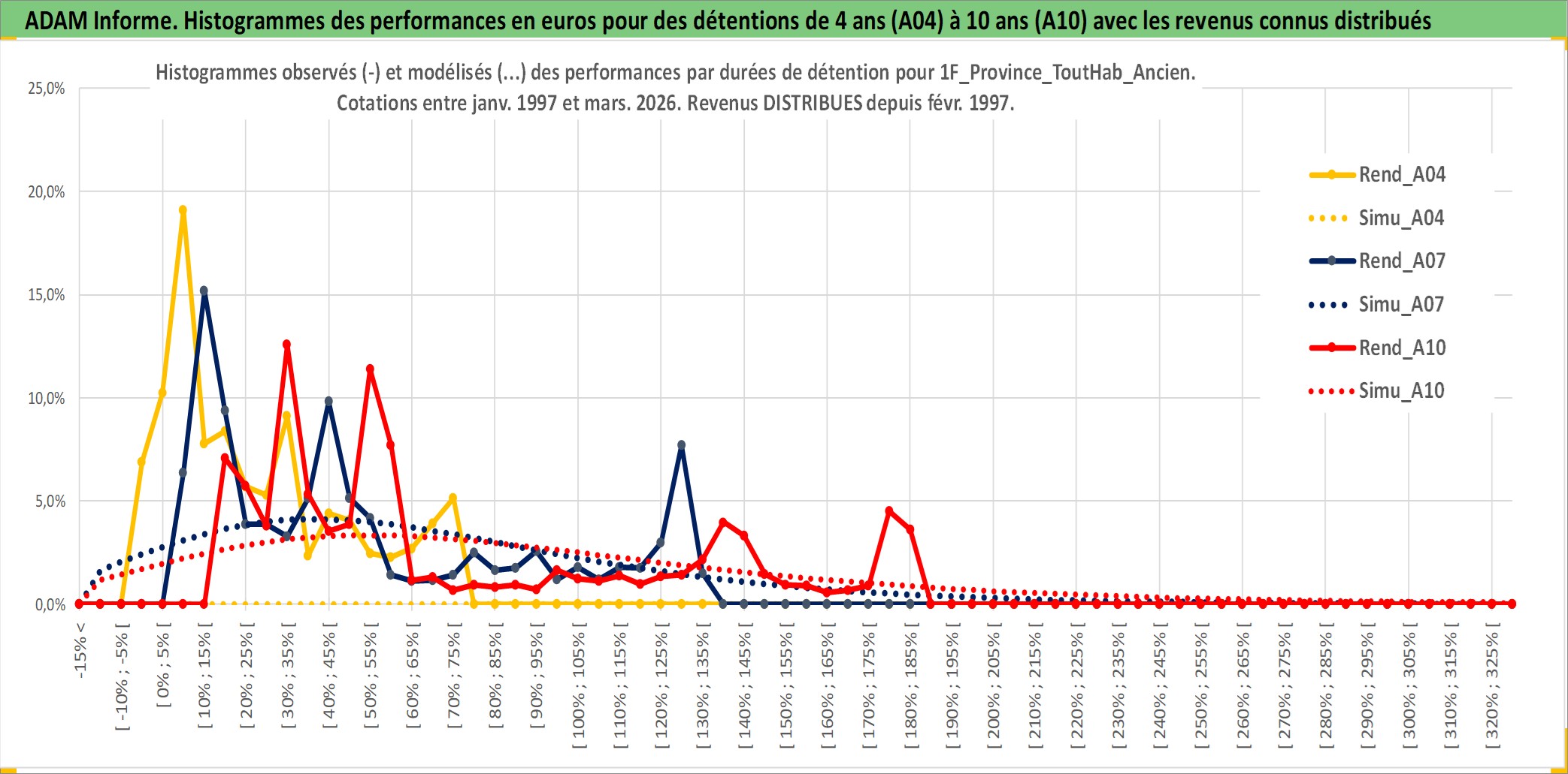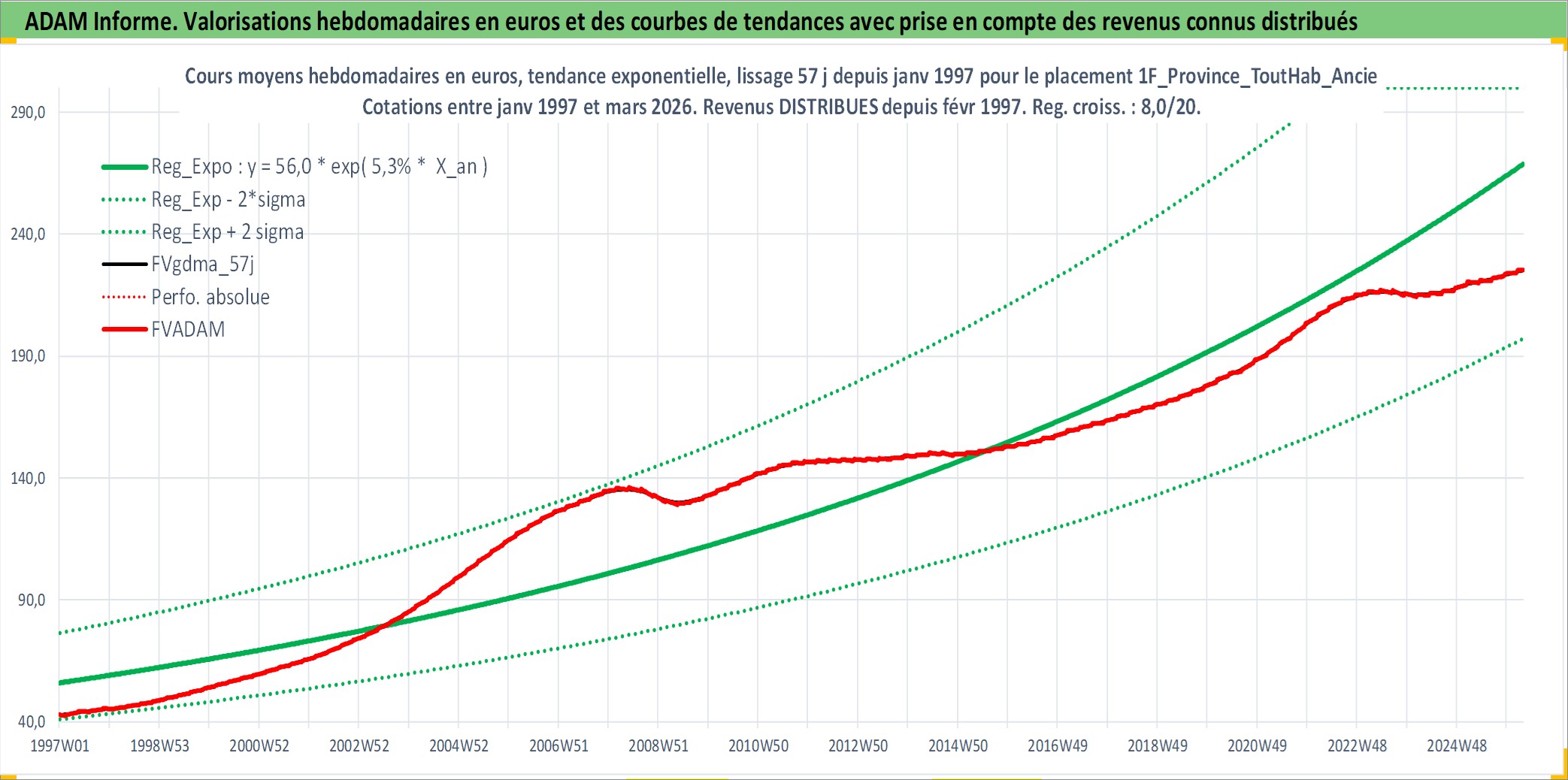 Site dédié aux investisseursPage dédiée sur site financeAnalyse des valorisations hebdomadaires de l'actif 1F_Province_ToutHab_Ancien. Cet actif est cote en EUR. Les valorisations couvrent les semaines 1997W01 a 2026W13. Les loyers de cet actif immobilier sont pris egaux a 3,33% annuels de la valeur venale du logement.