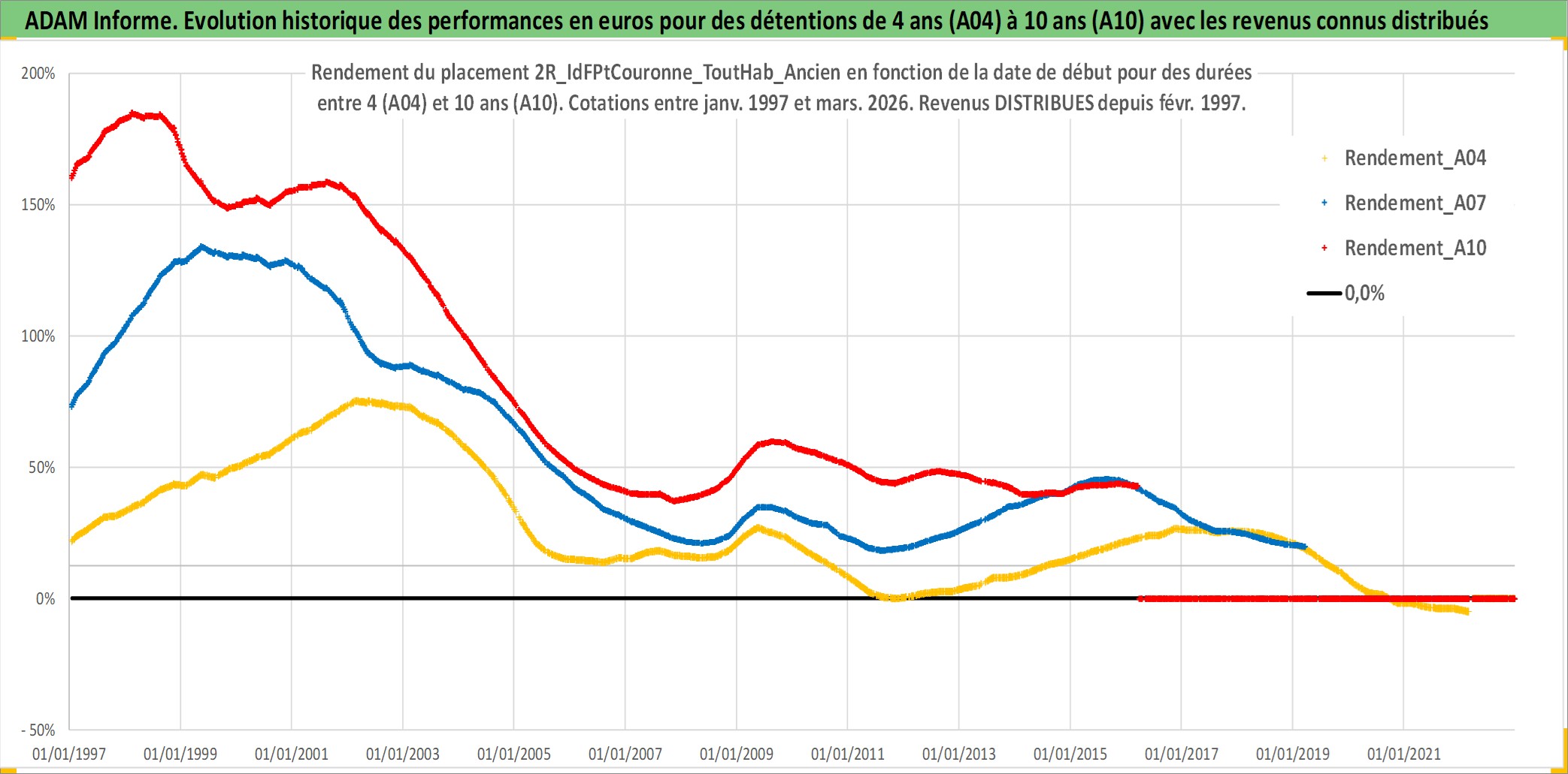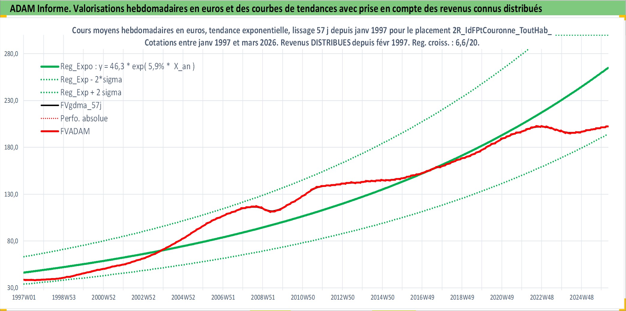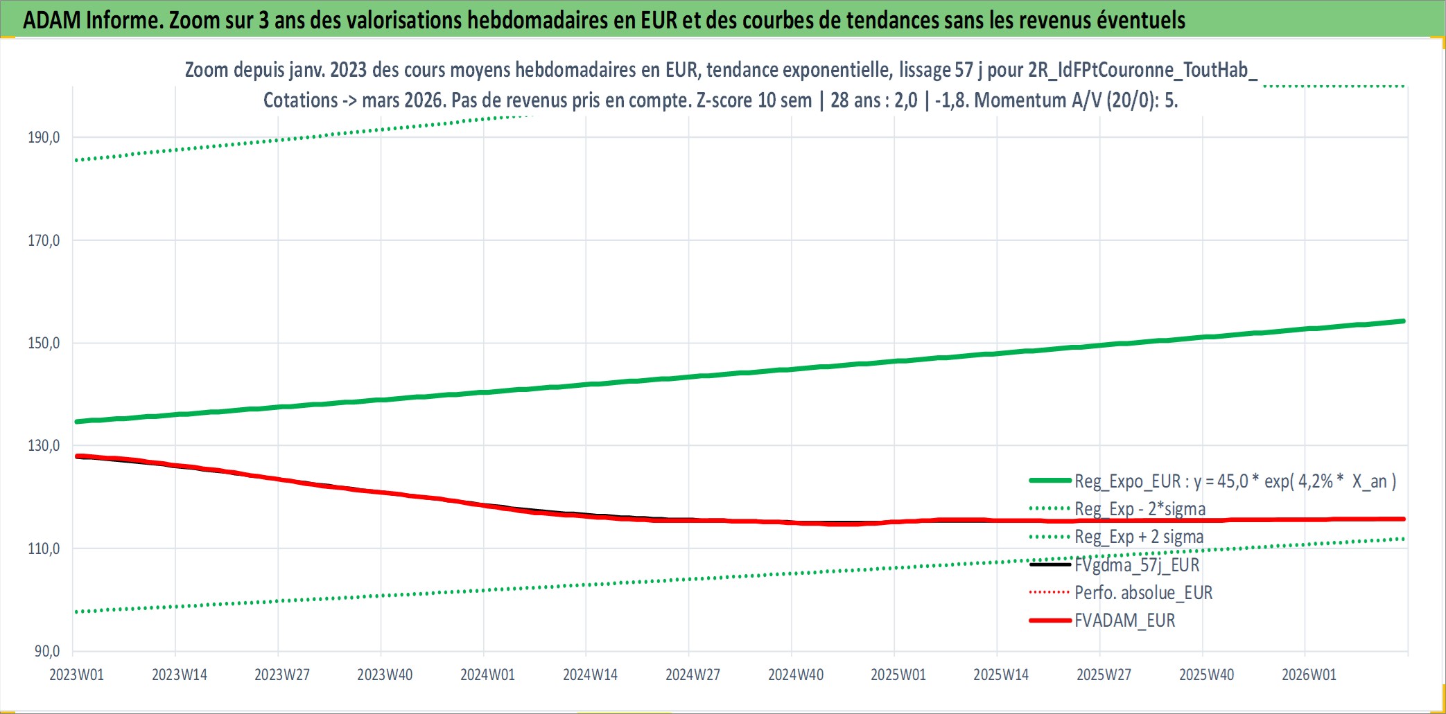 Site dédié aux investisseursPage dédiée sur site financeAnalyse des valorisations hebdomadaires de l'actif 2R_IdFPtCouronne_ToutHab_Ancien. Cet actif est cote en EUR. Les valorisations couvrent les semaines 1997W01 a 2026W13. Les loyers de cet actif immobilier sont pris egaux a 3,33% annuels de la valeur venale du logement.