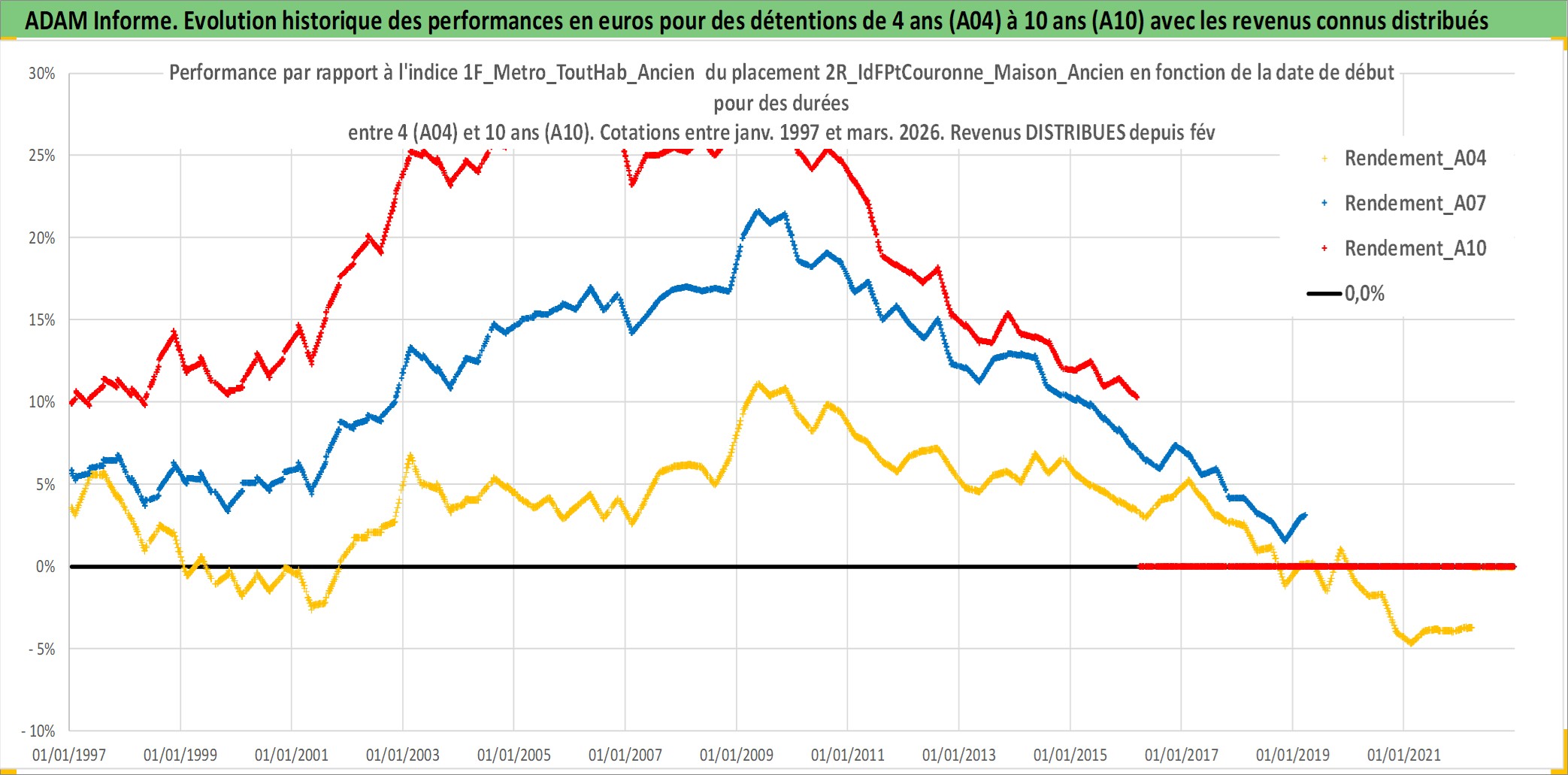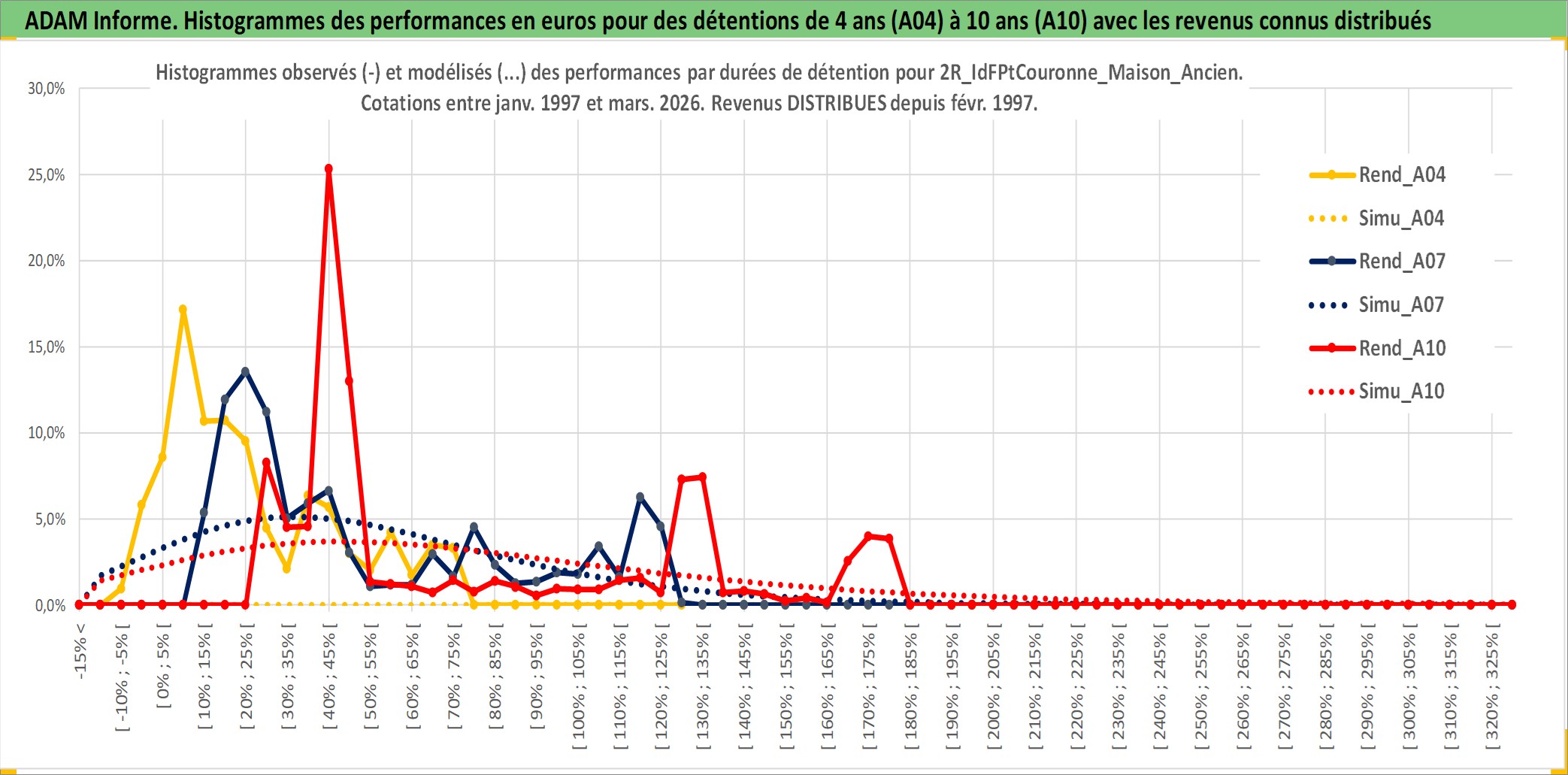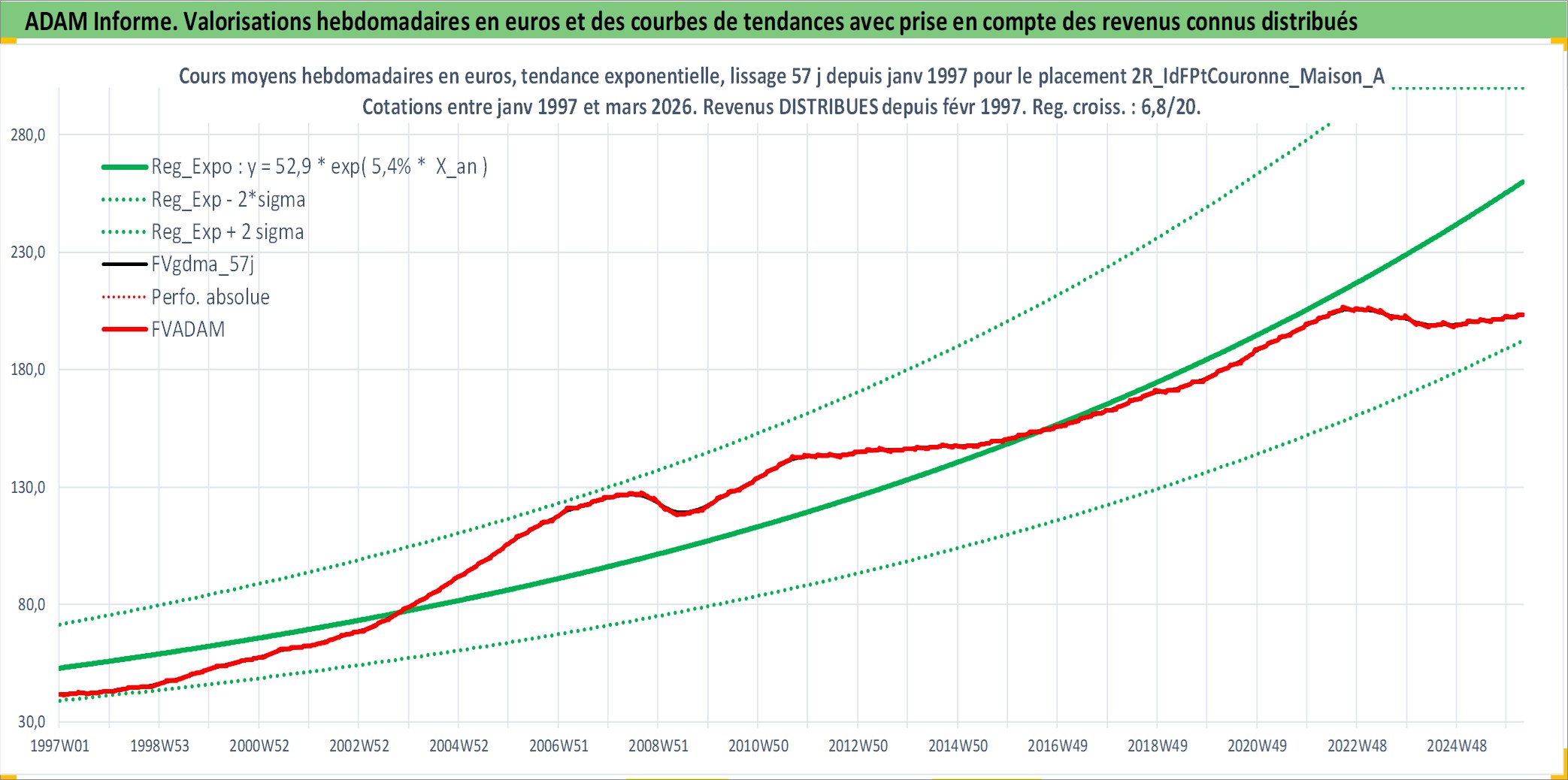 Site dédié aux investisseursPage dédiée sur site financeAnalyse des valorisations hebdomadaires de l'actif 2R_IdFPtCouronne_Maison_Ancien. Cet actif est cote en EUR. Les valorisations couvrent les semaines 1997W01 a 2026W13. Les loyers de cet actif immobilier sont pris egaux a 3,33% annuels de la valeur venale du logement.