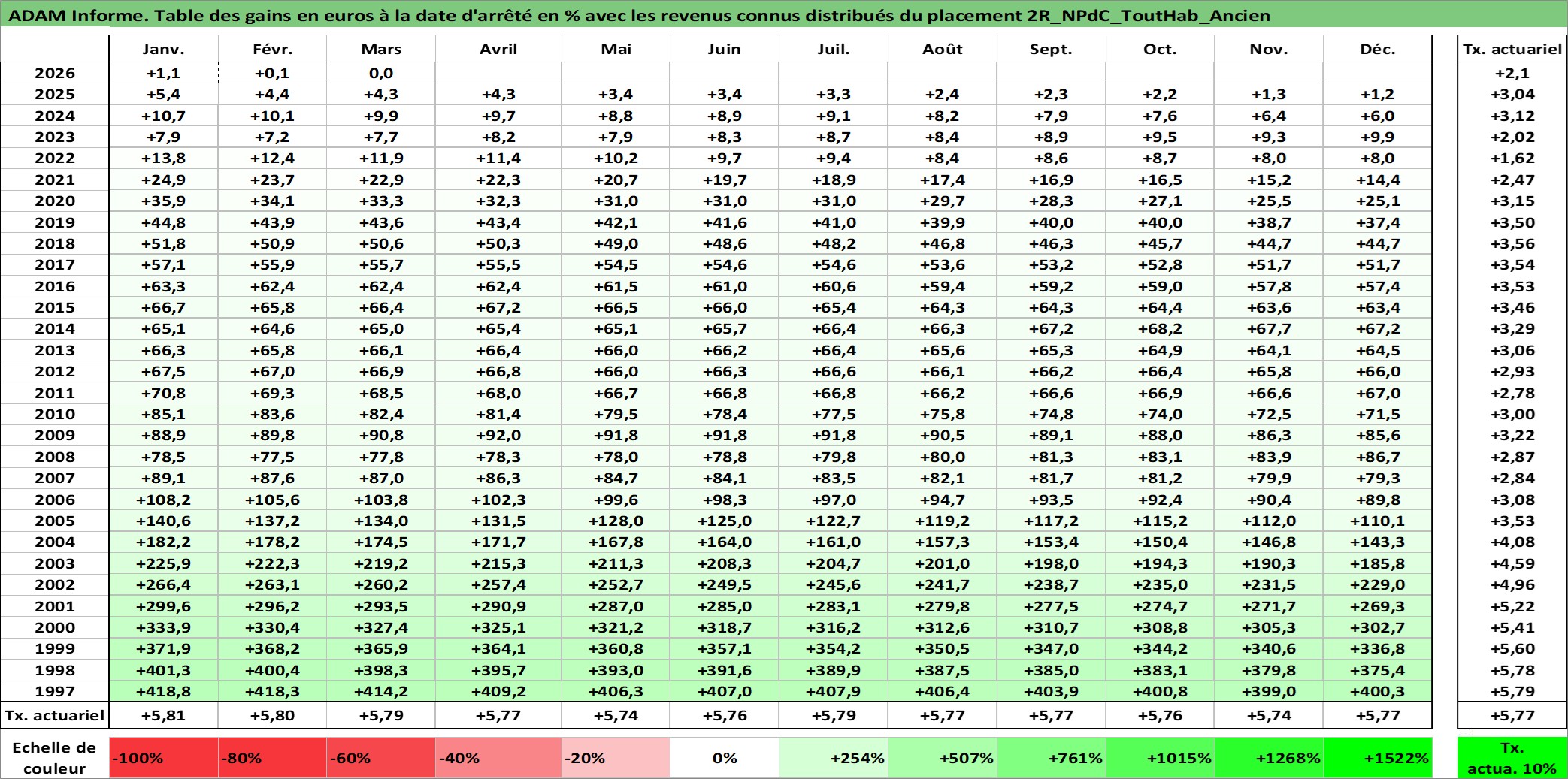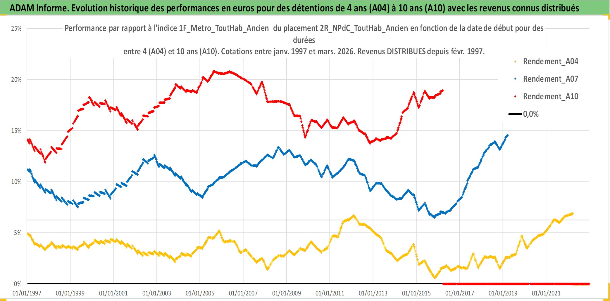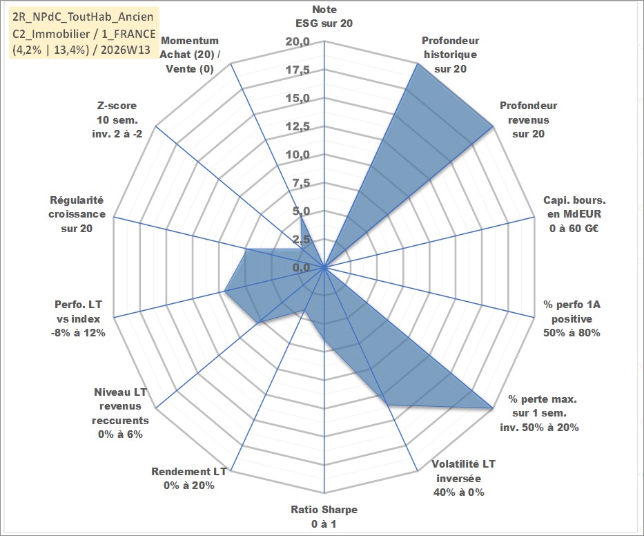 Site dédié aux investisseursPage dédiée sur site financeAnalyse des valorisations hebdomadaires de l'actif 2R_NPdC_ToutHab_Ancien. Cet actif est cote en EUR. Les valorisations couvrent les semaines 1997W01 a 2026W13. Les loyers de cet actif immobilier sont pris egaux a 3,33% annuels de la valeur venale du logement.