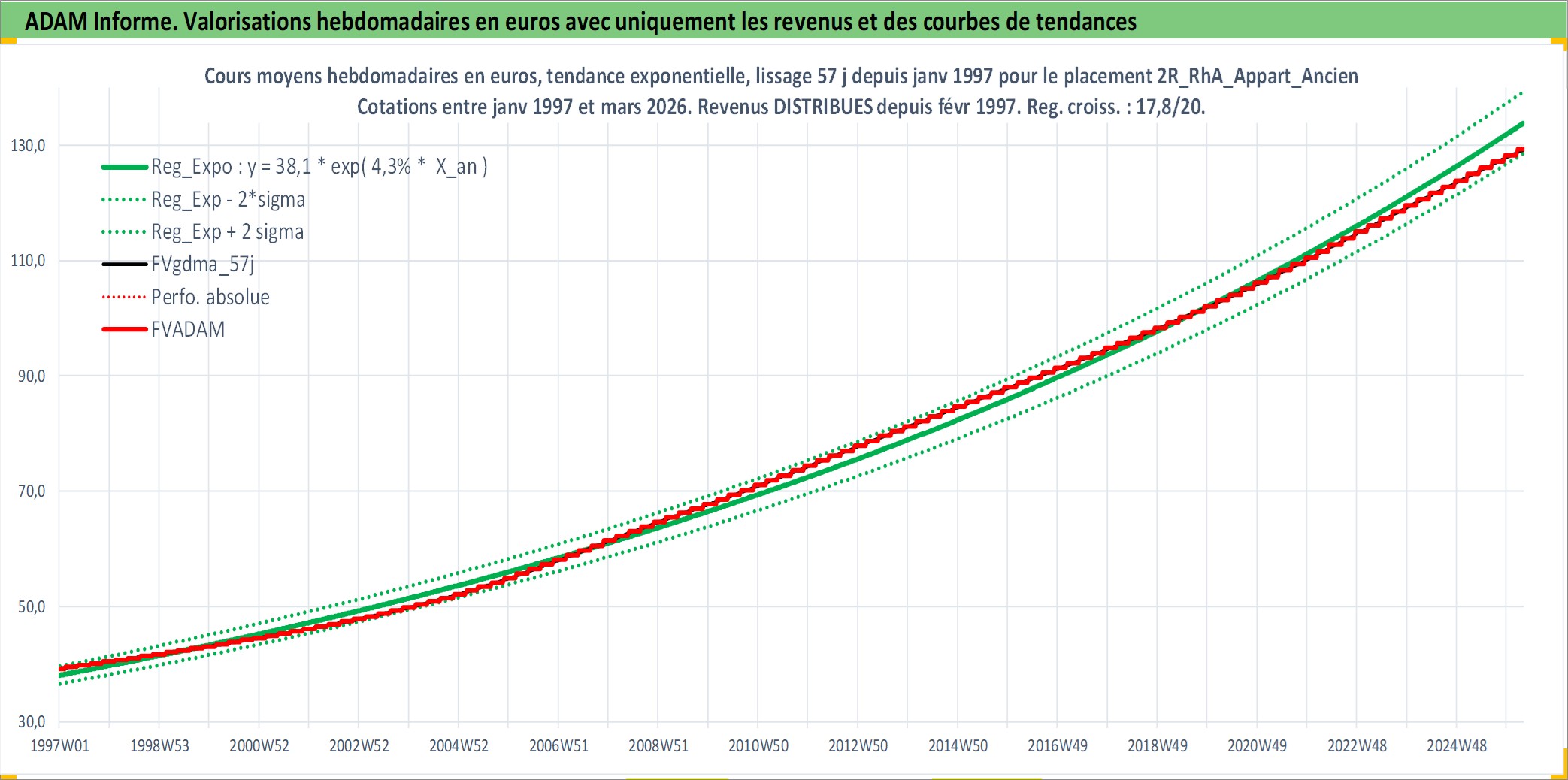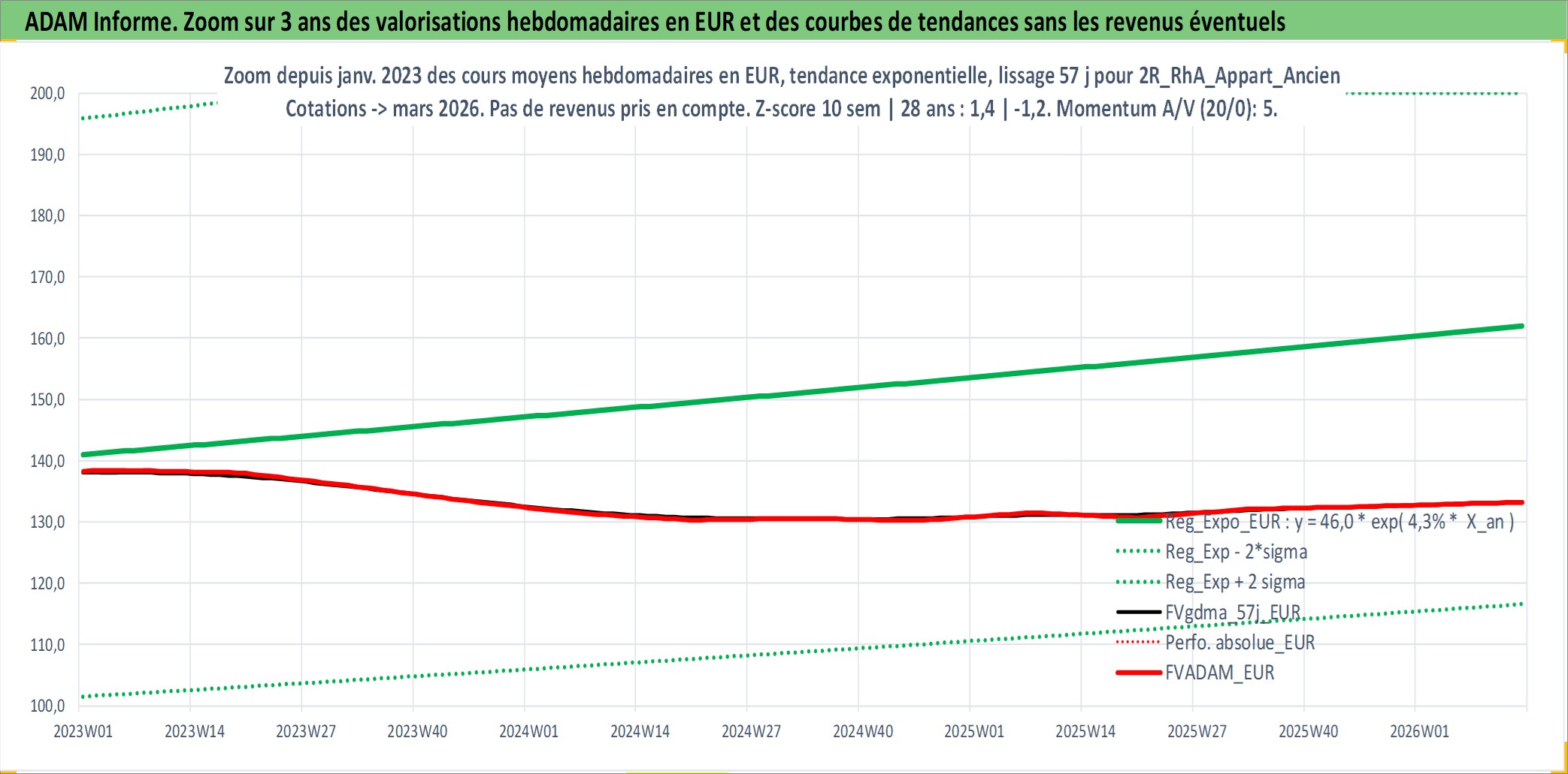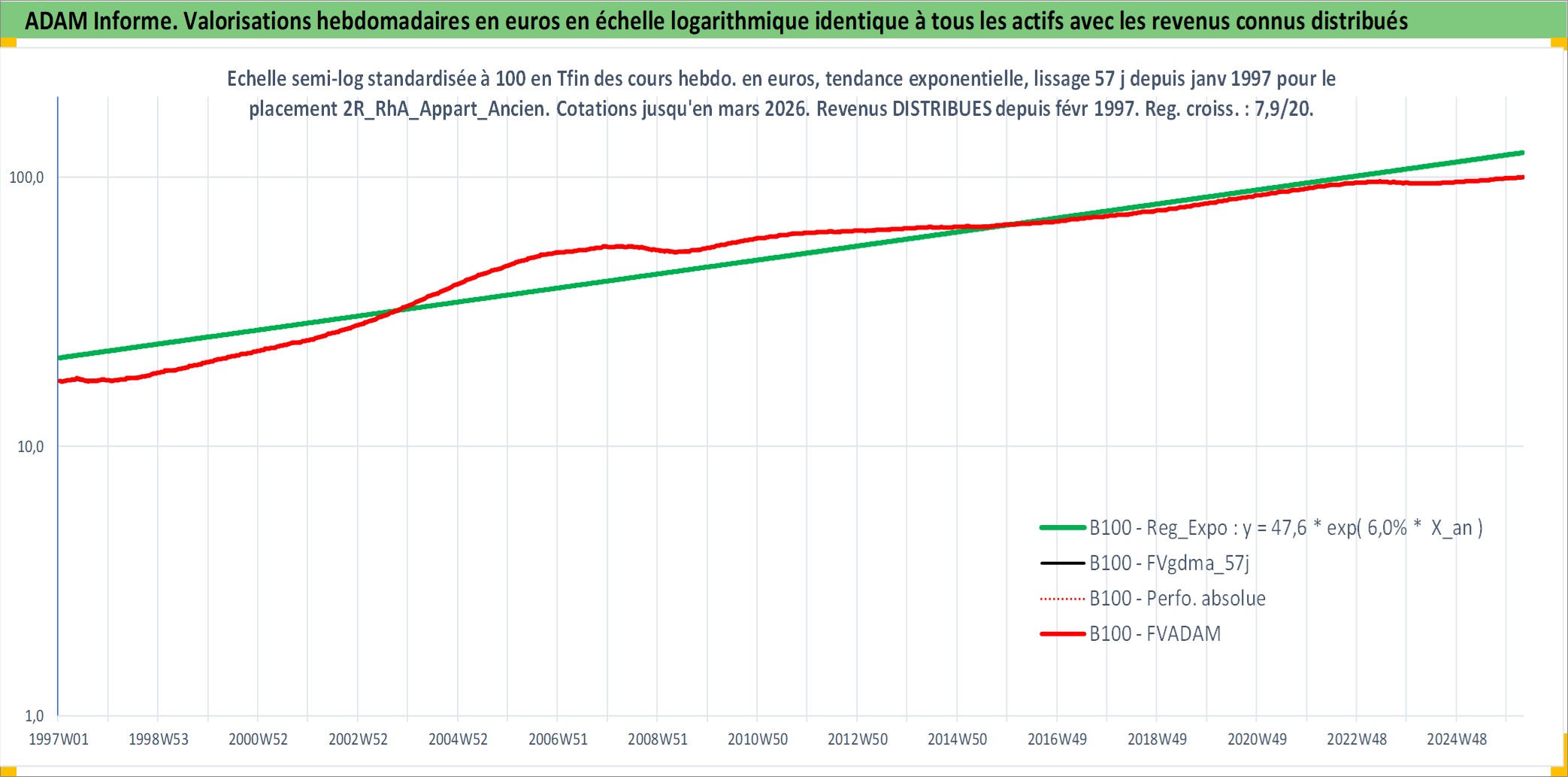 Site dédié aux investisseursPage dédiée sur site financeAnalyse des valorisations hebdomadaires de l'actif 2R_RhA_Appart_Ancien. Cet actif est cote en EUR. Les valorisations couvrent les semaines 1997W01 a 2026W13. Les loyers de cet actif immobilier sont pris egaux a 3,33% annuels de la valeur venale du logement.