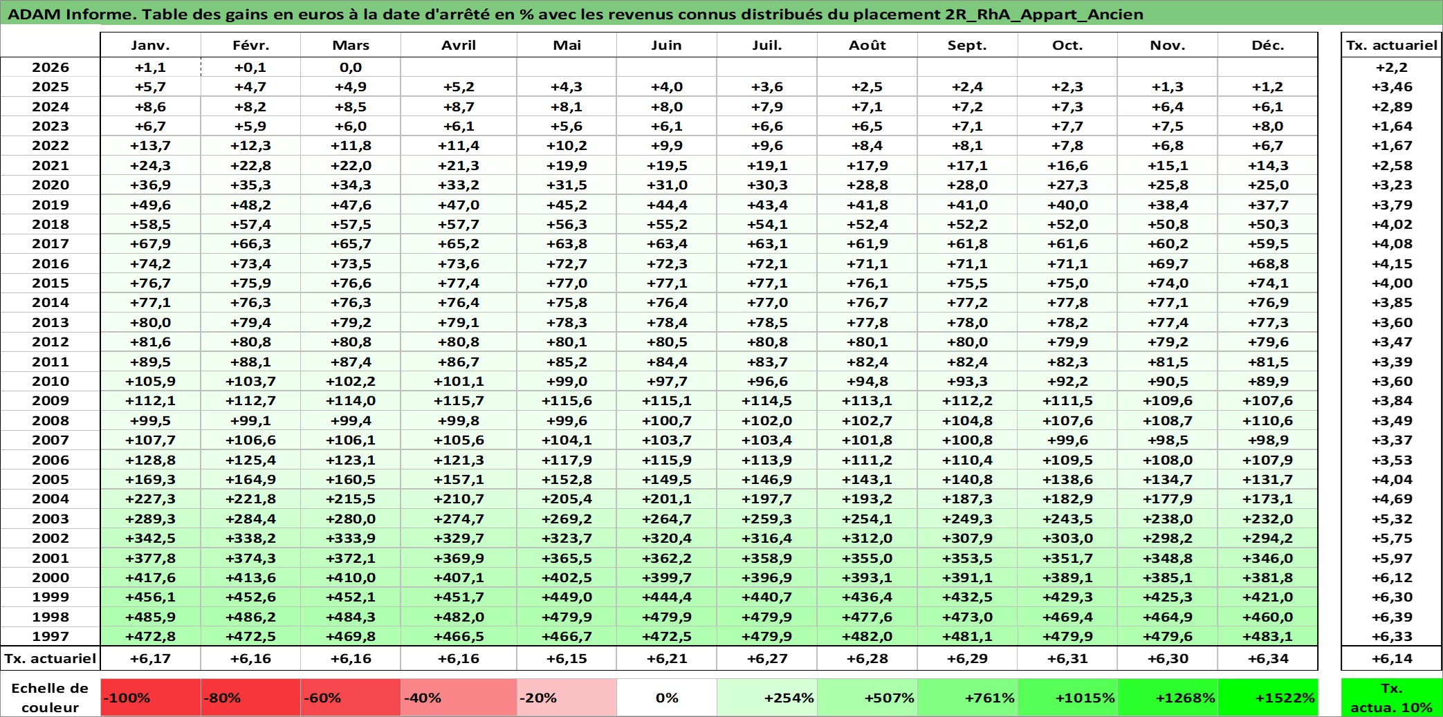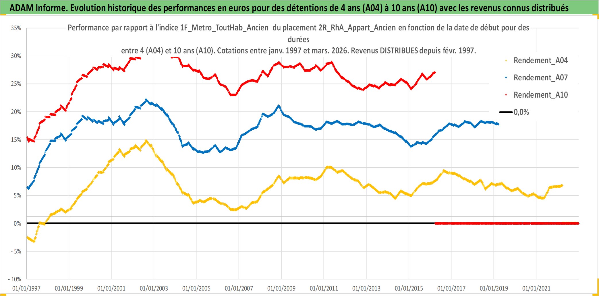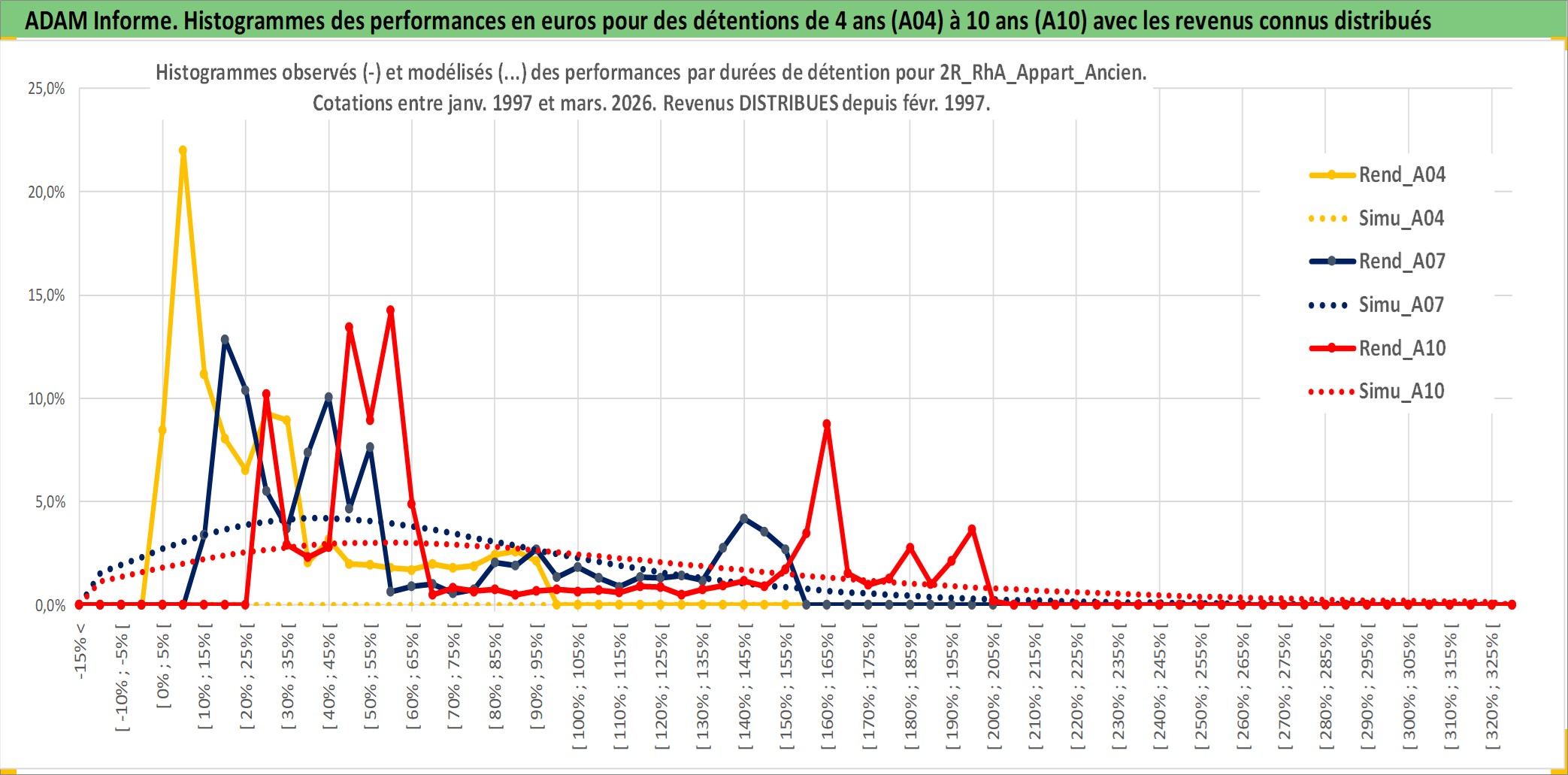 Site dédié aux investisseursPage dédiée sur site financeAnalyse des valorisations hebdomadaires de l'actif 2R_RhA_Appart_Ancien. Cet actif est cote en EUR. Les valorisations couvrent les semaines 1997W01 a 2026W13. Les loyers de cet actif immobilier sont pris egaux a 3,33% annuels de la valeur venale du logement.
