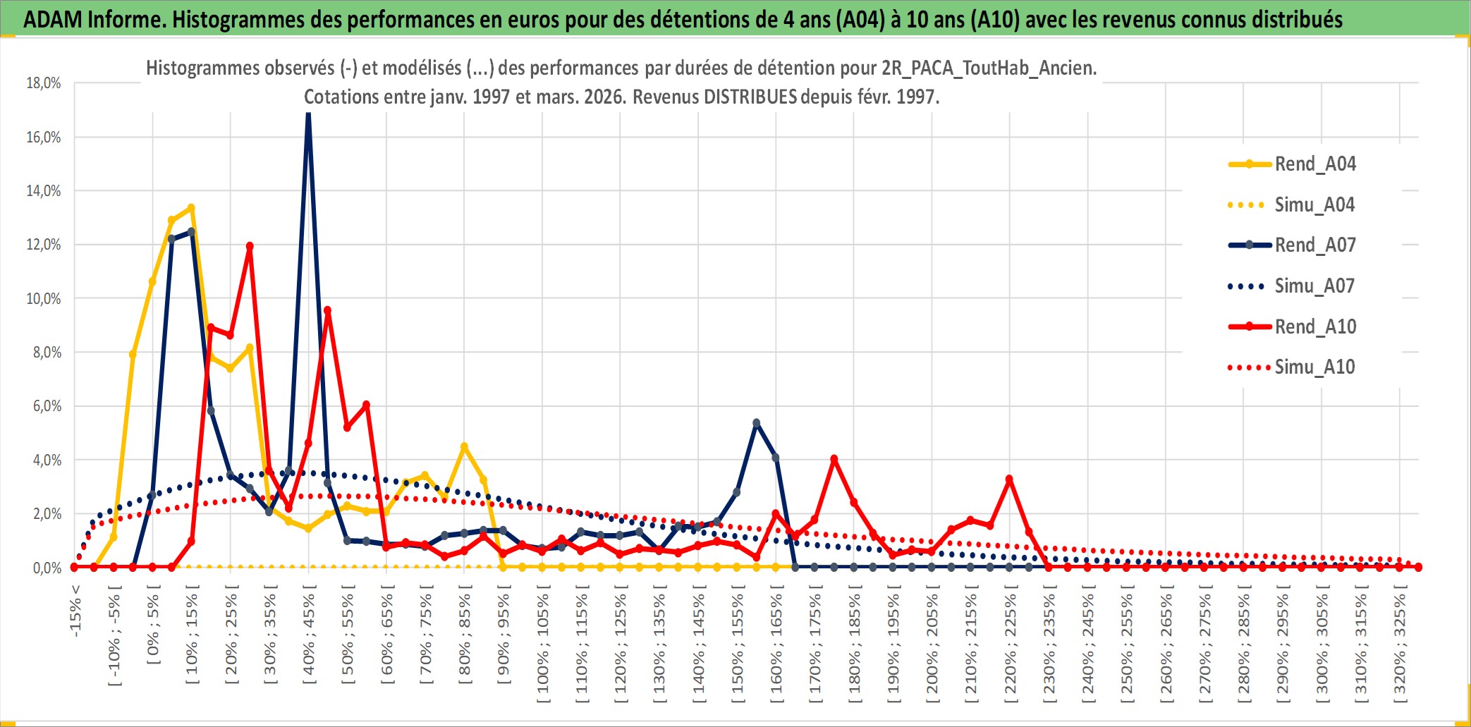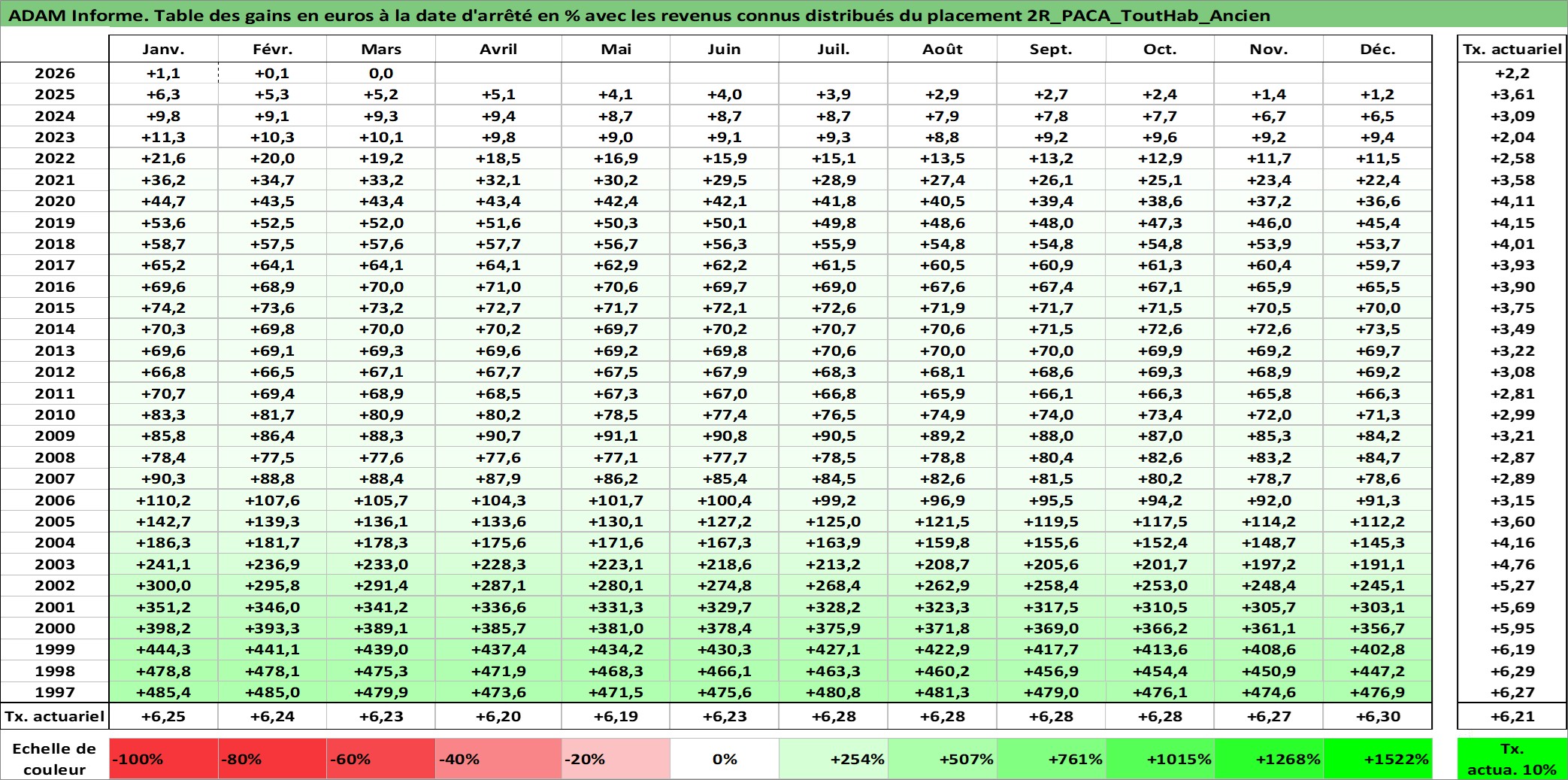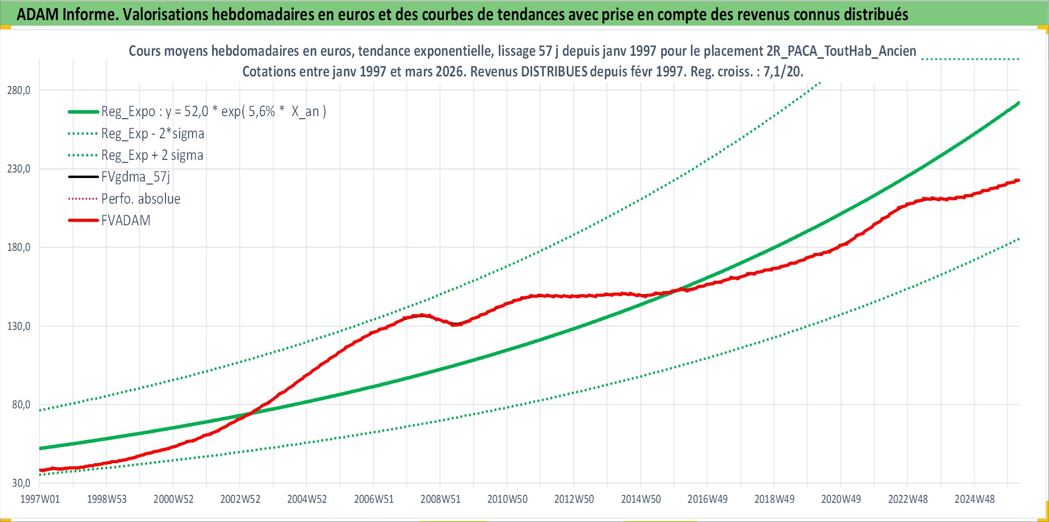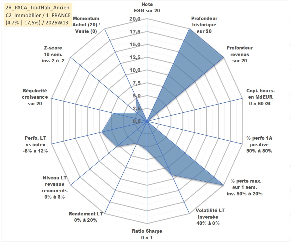 Site dédié aux investisseursPage dédiée sur site financeAnalyse des valorisations hebdomadaires de l'actif 2R_PACA_ToutHab_Ancien. Cet actif est cote en EUR. Les valorisations couvrent les semaines 1997W01 a 2026W13. Les loyers de cet actif immobilier sont pris egaux a 3,33% annuels de la valeur venale du logement.