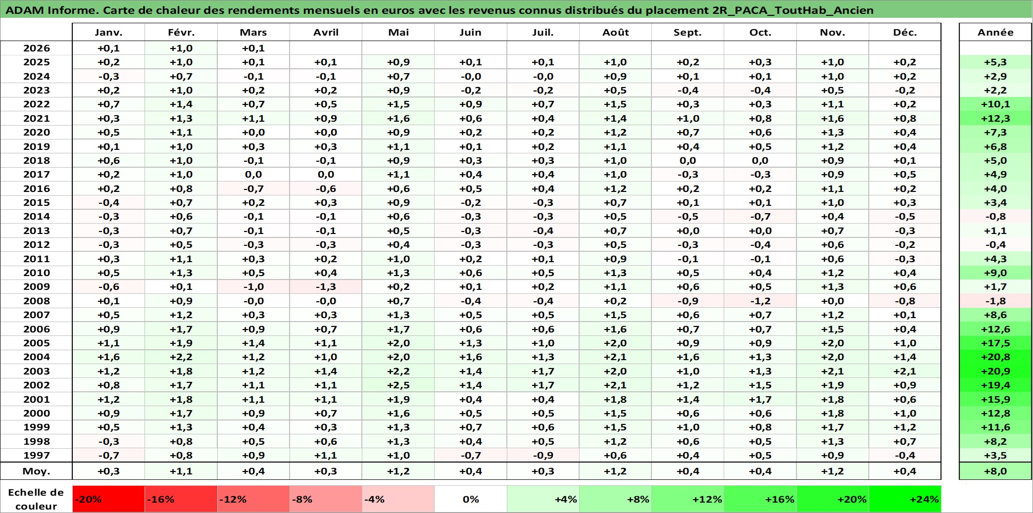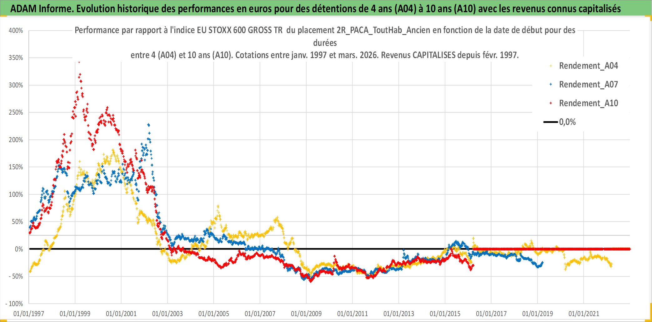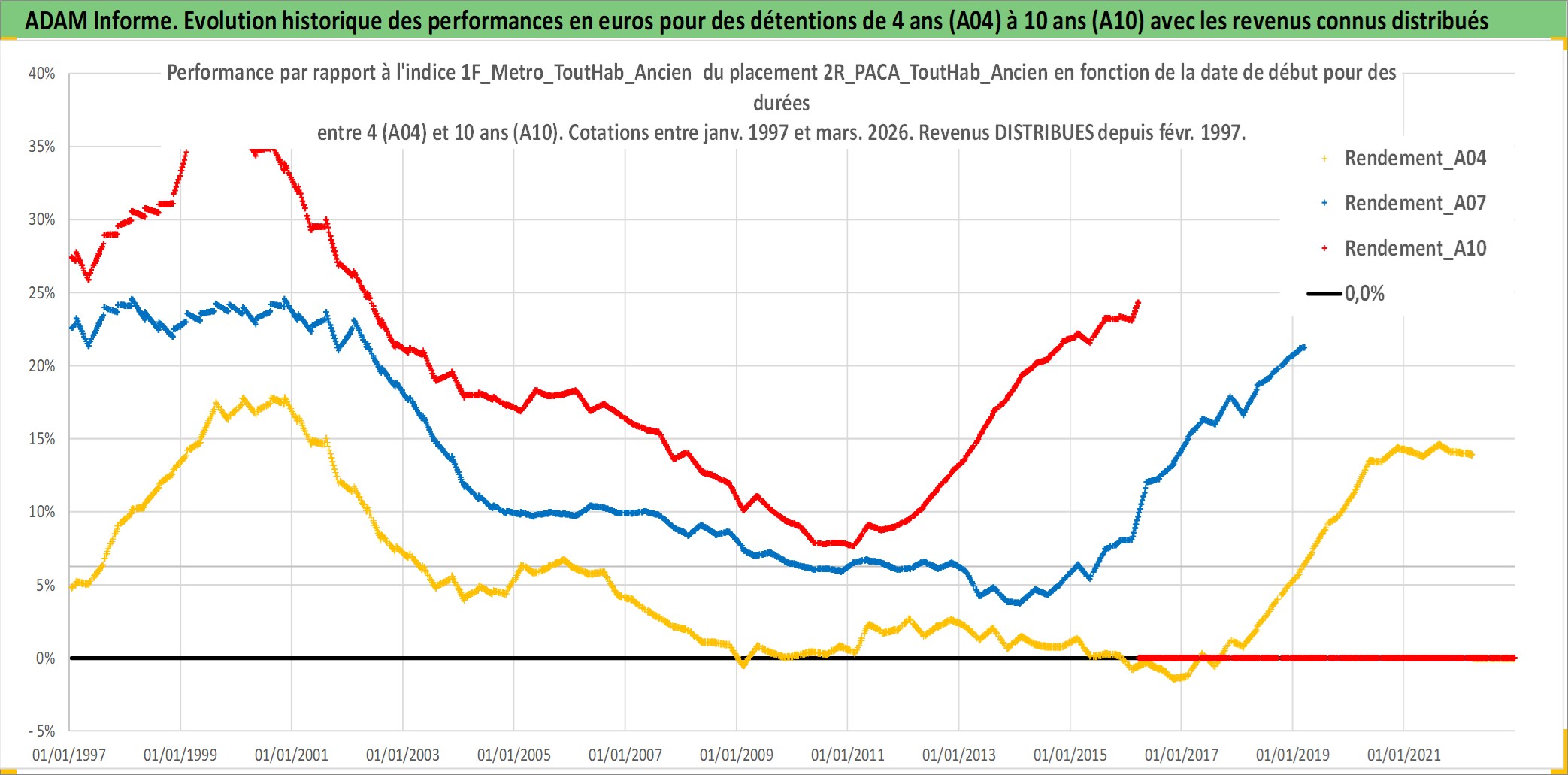Site dédié aux investisseursPage dédiée sur site financeAnalyse des valorisations hebdomadaires de l'actif 2R_PACA_ToutHab_Ancien. Cet actif est cote en EUR. Les valorisations couvrent les semaines 1997W01 a 2026W13. Les loyers de cet actif immobilier sont pris egaux a 3,33% annuels de la valeur venale du logement.