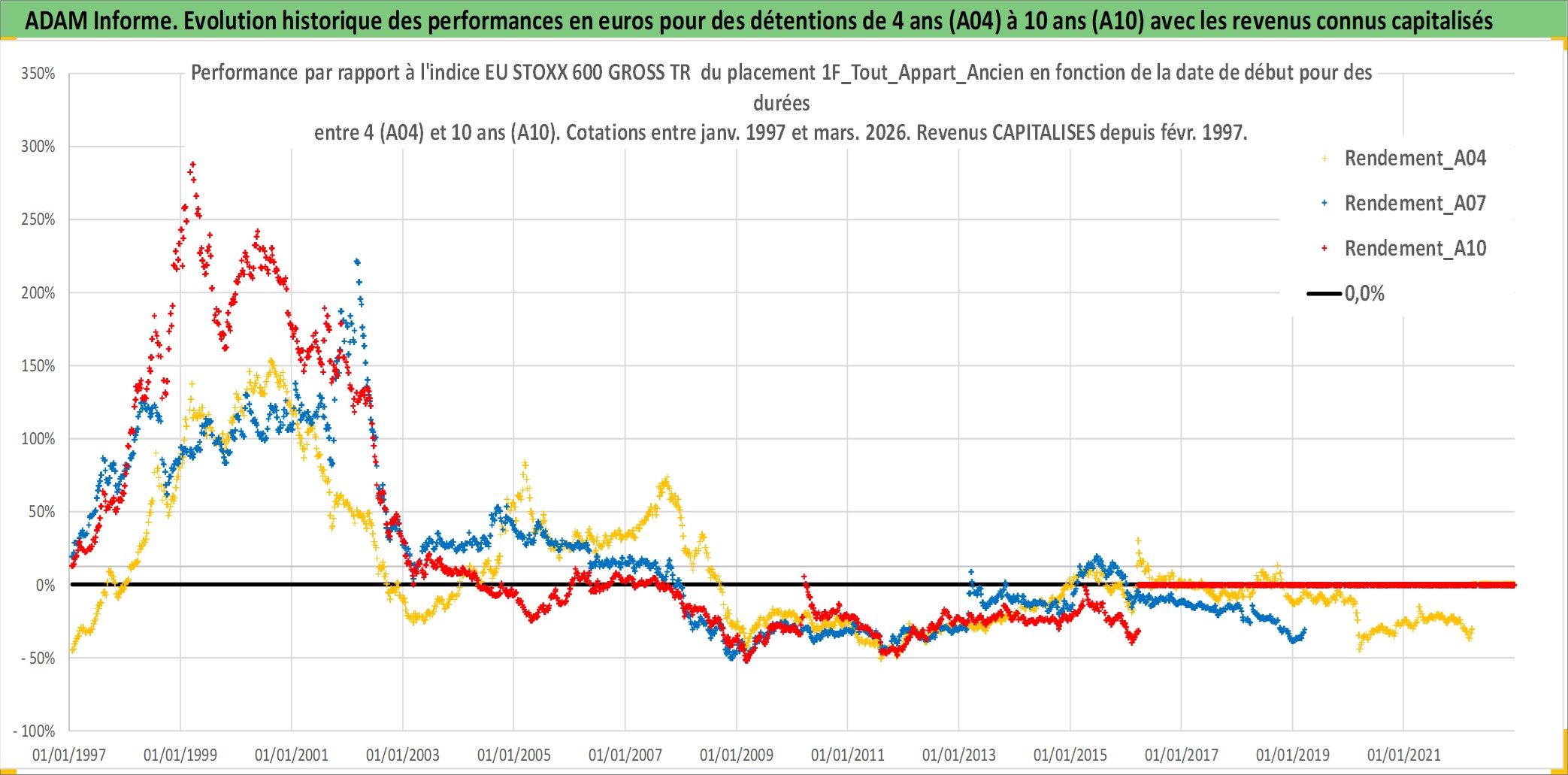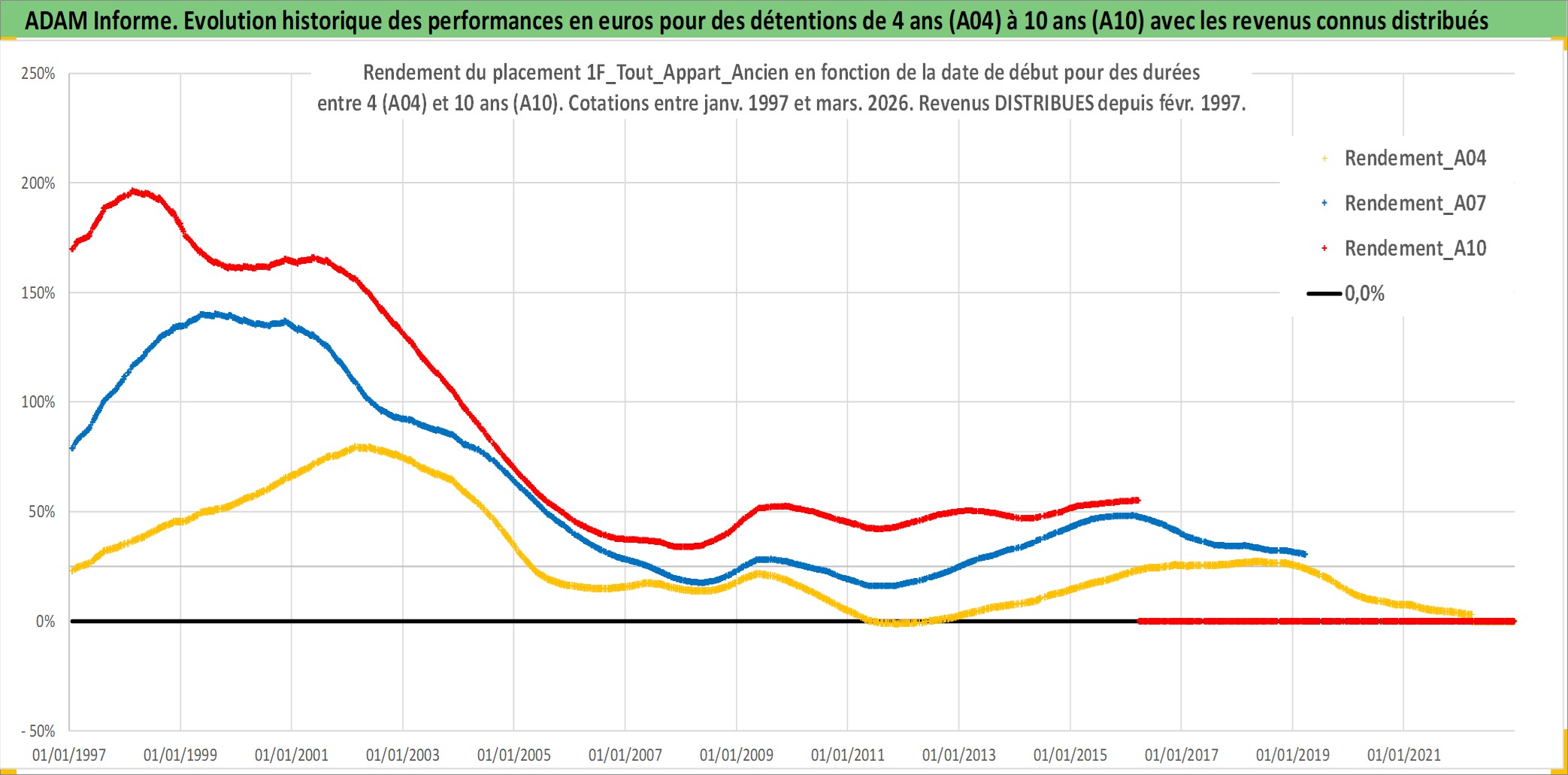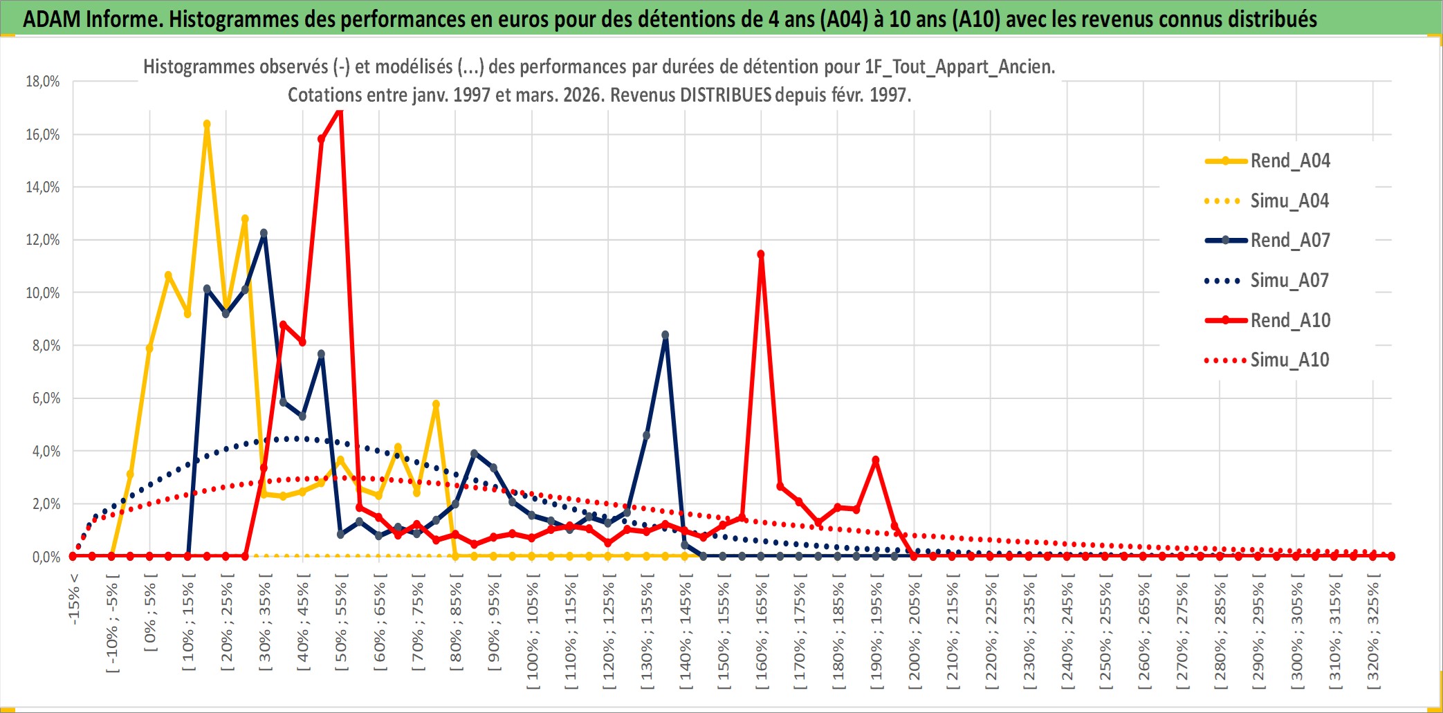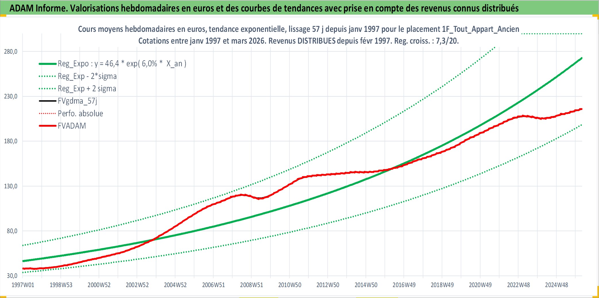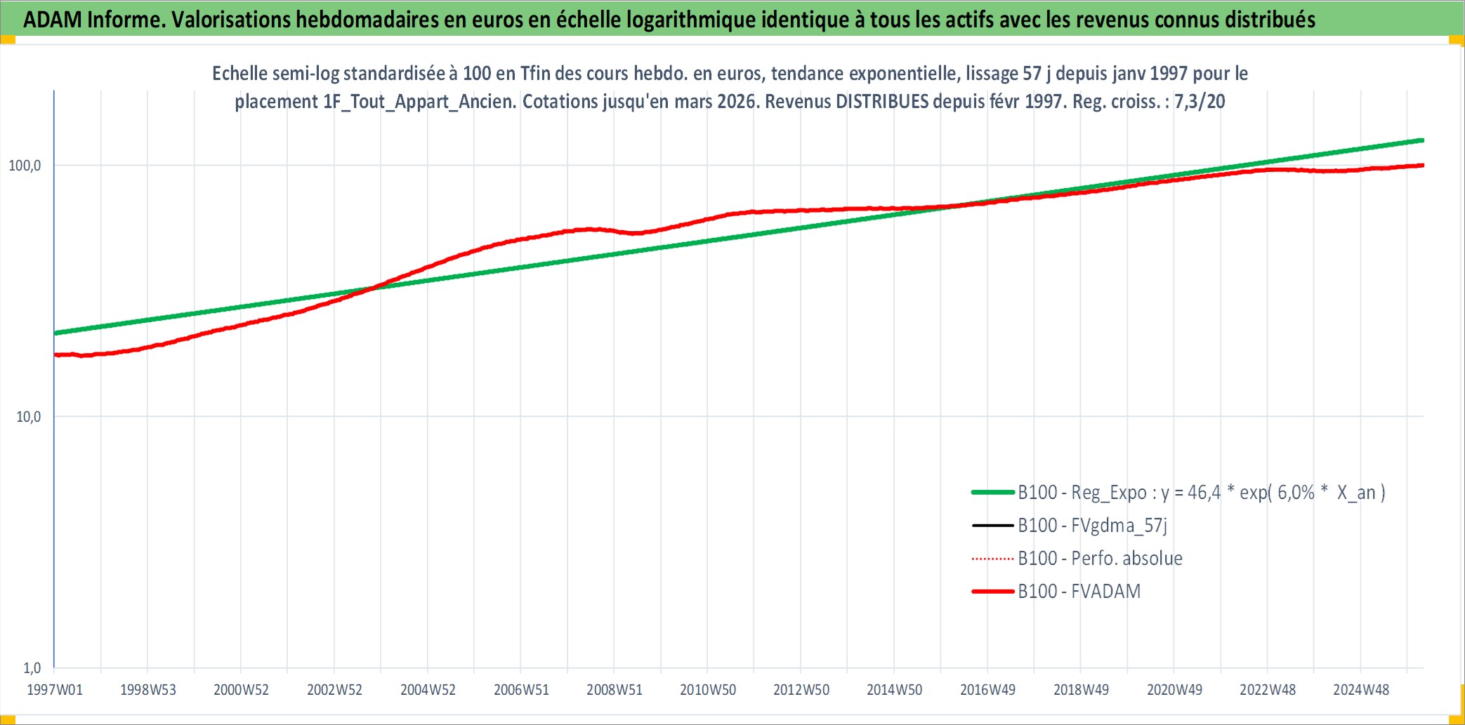 Site dédié aux investisseursPage dédiée sur site financeAnalyse des valorisations hebdomadaires de l'actif 1F_Tout_Appart_Ancien. Cet actif est cote en EUR. Les valorisations couvrent les semaines 1997W01 a 2026W13. Les loyers de cet actif immobilier sont pris egaux a 3,33% annuels de la valeur venale du logement.