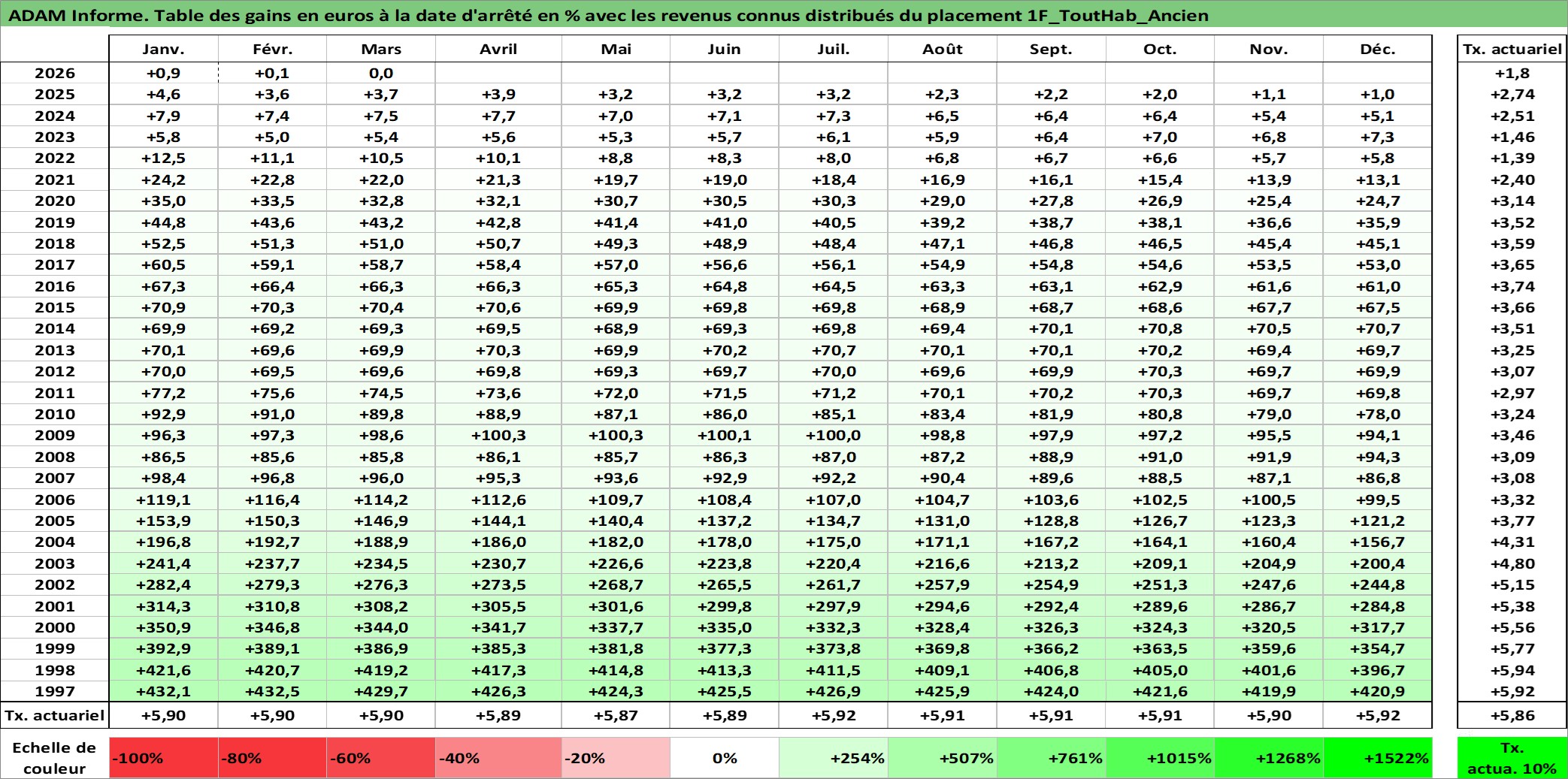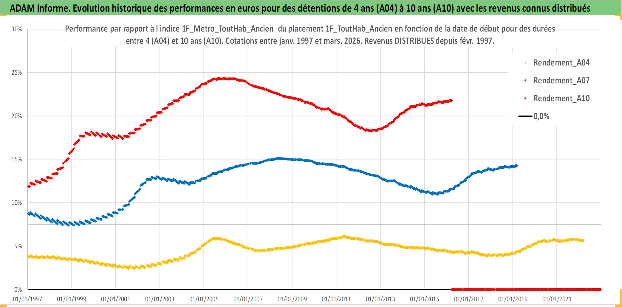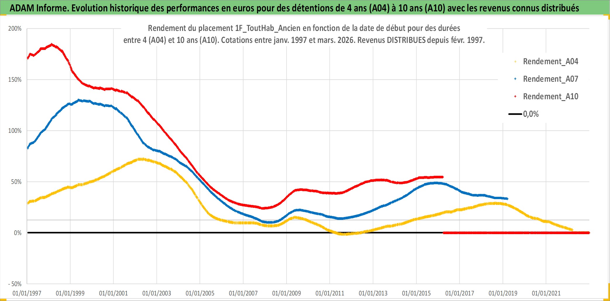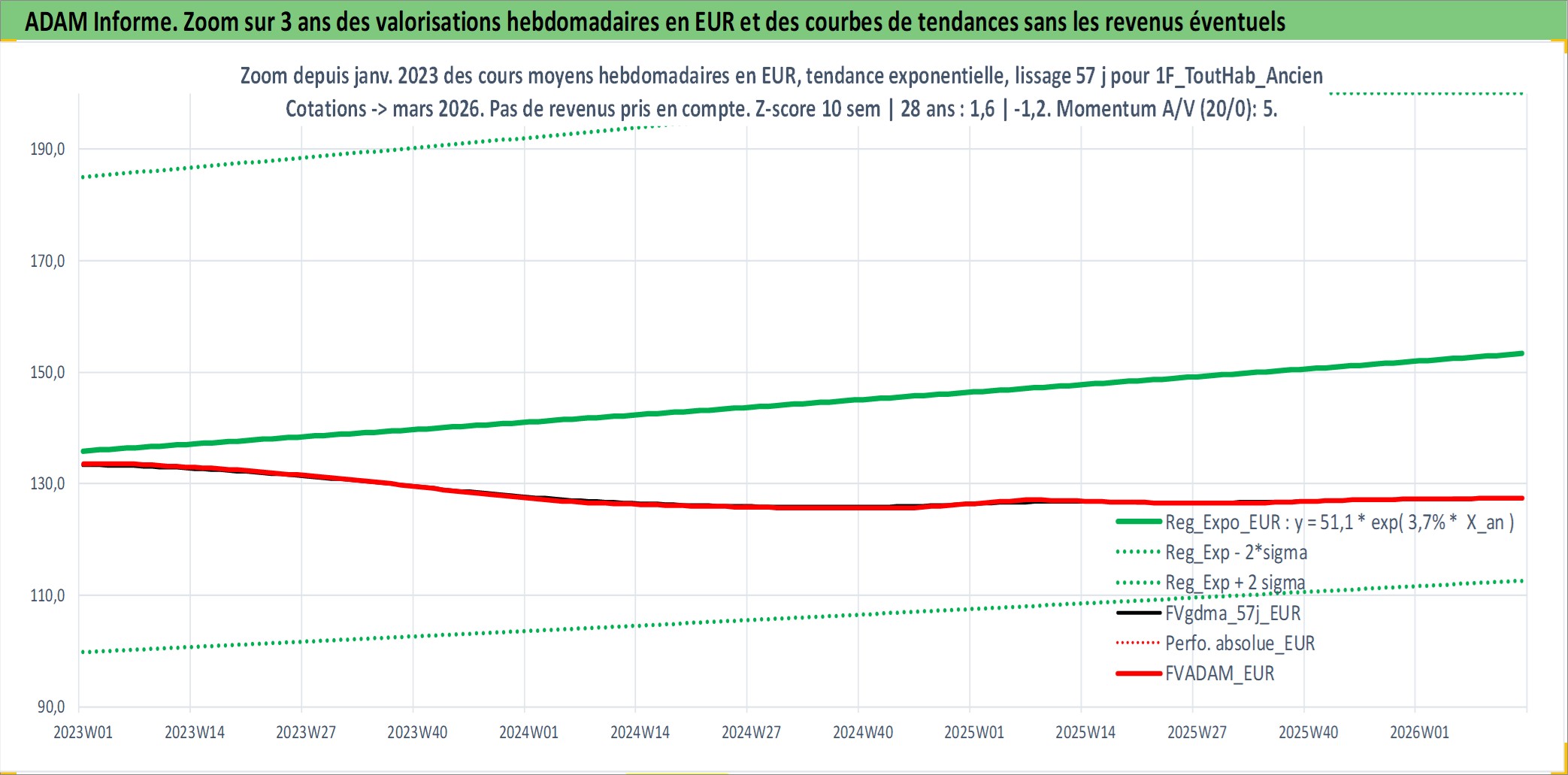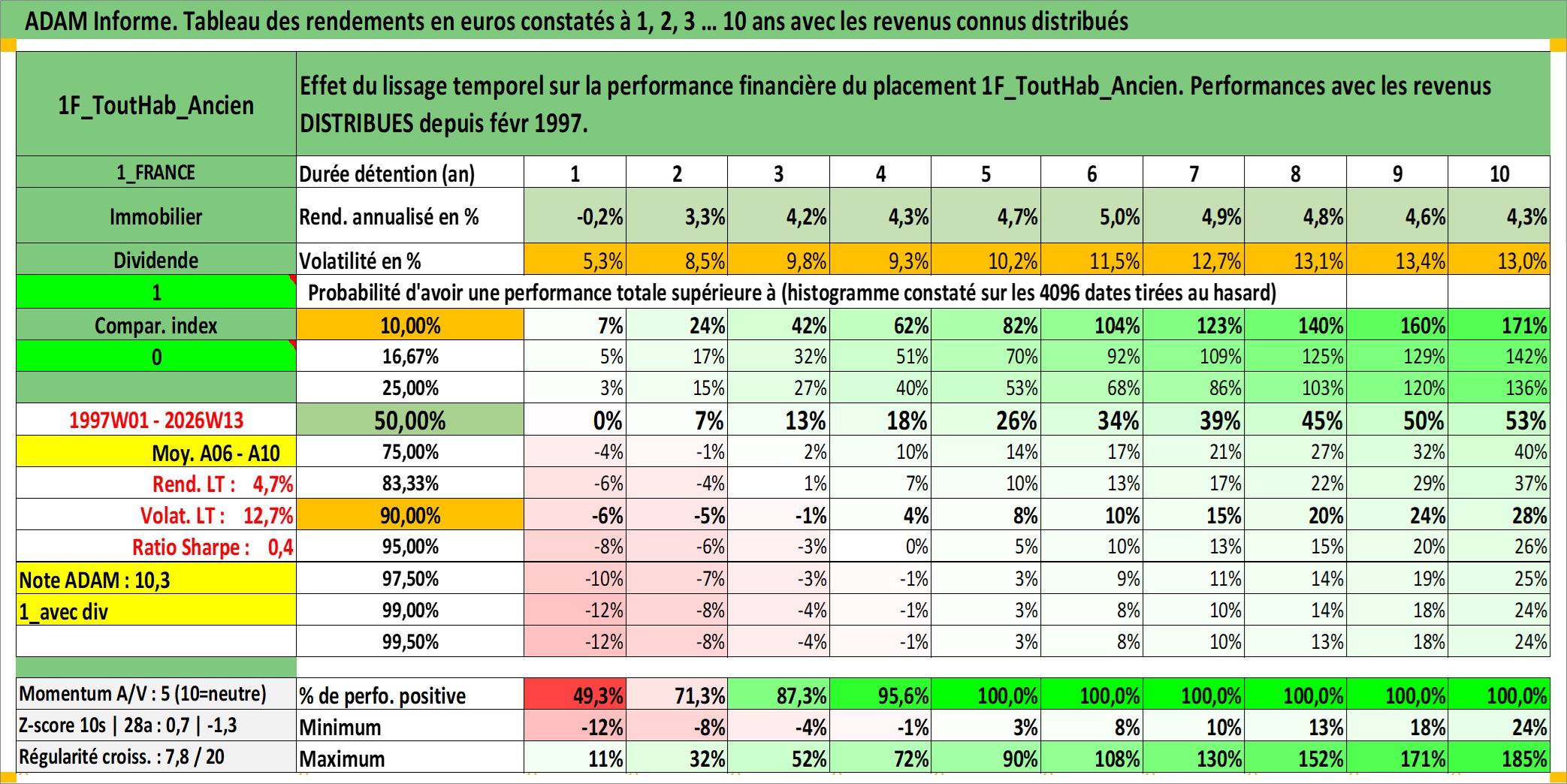 Site dédié aux investisseursPage dédiée sur site financeAnalyse des valorisations hebdomadaires de l'actif 1F_ToutHab_Ancien. Cet actif est cote en EUR. Les valorisations couvrent les semaines 1997W01 a 2026W13. Les loyers de cet actif immobilier sont pris egaux a 3,33% annuels de la valeur venale du logement.
