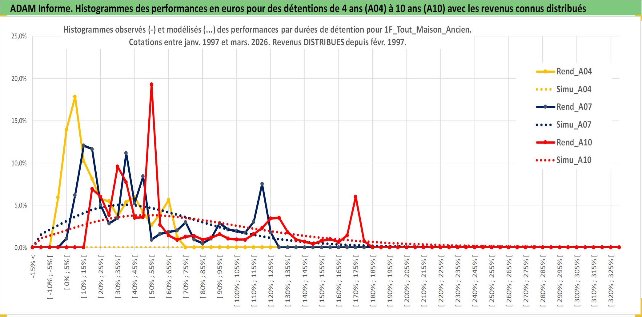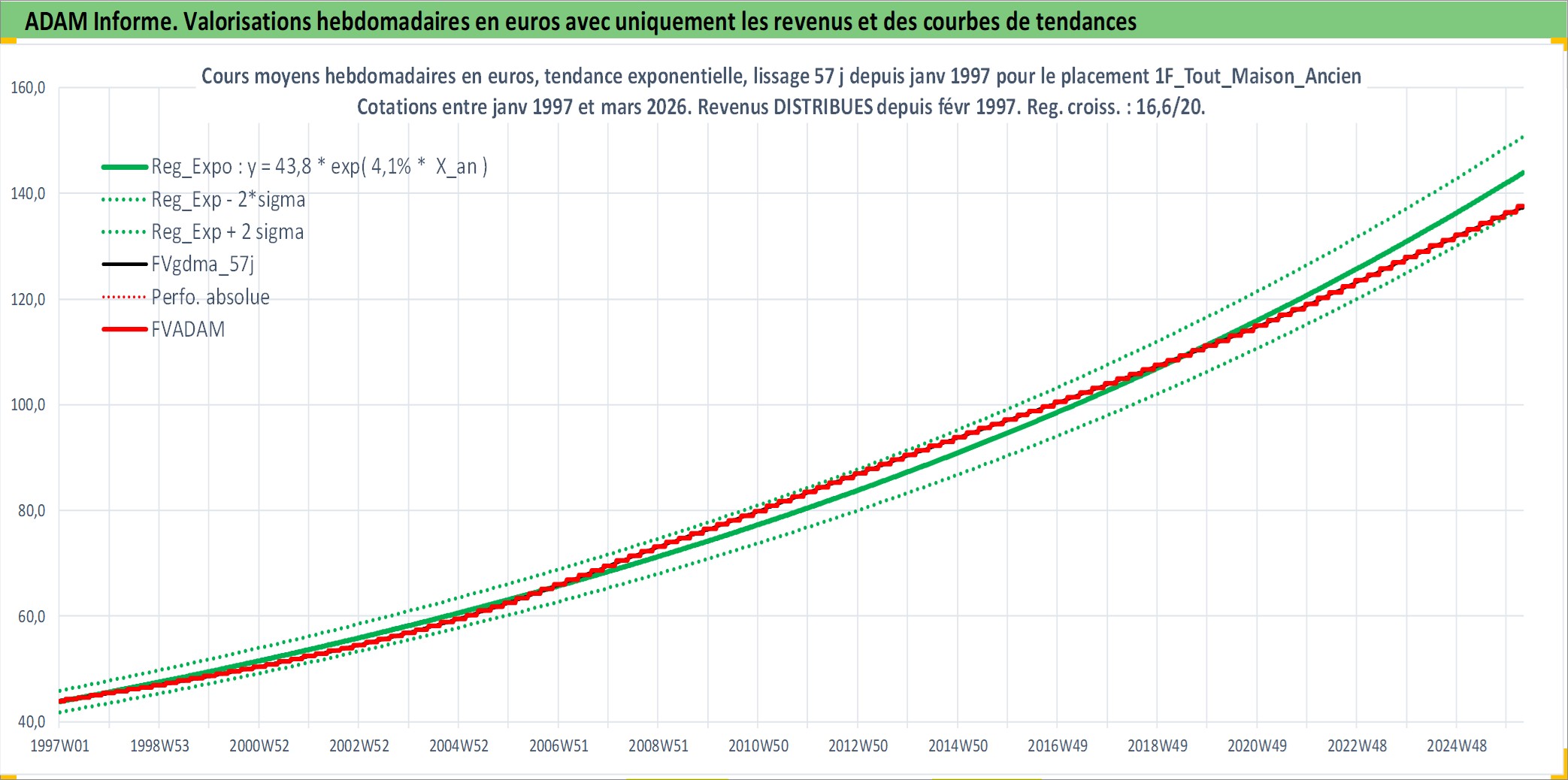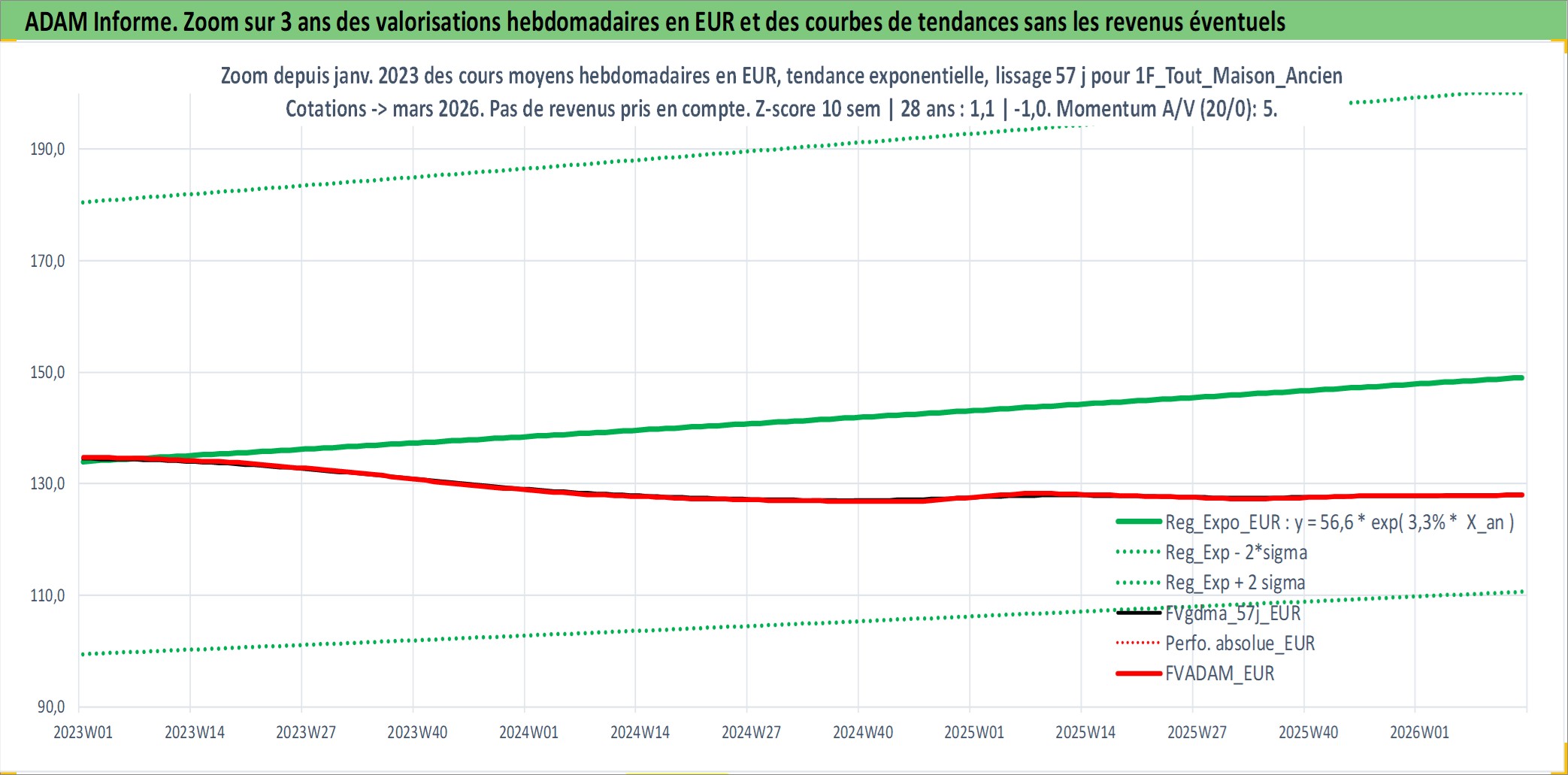 Site dédié aux investisseursPage dédiée sur site financeAnalyse des valorisations hebdomadaires de l'actif 1F_Tout_Maison_Ancien. Cet actif est cote en EUR. Les valorisations couvrent les semaines 1997W01 a 2026W13. Les loyers de cet actif immobilier sont pris egaux a 3,33% annuels de la valeur venale du logement.