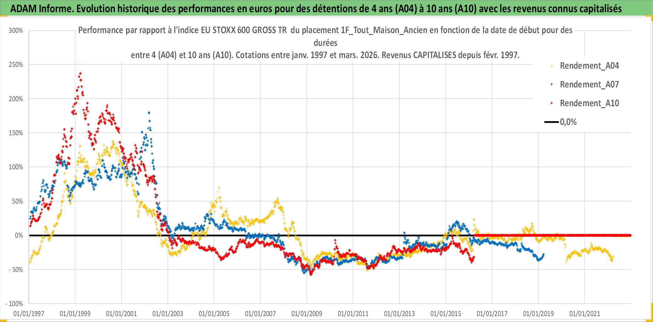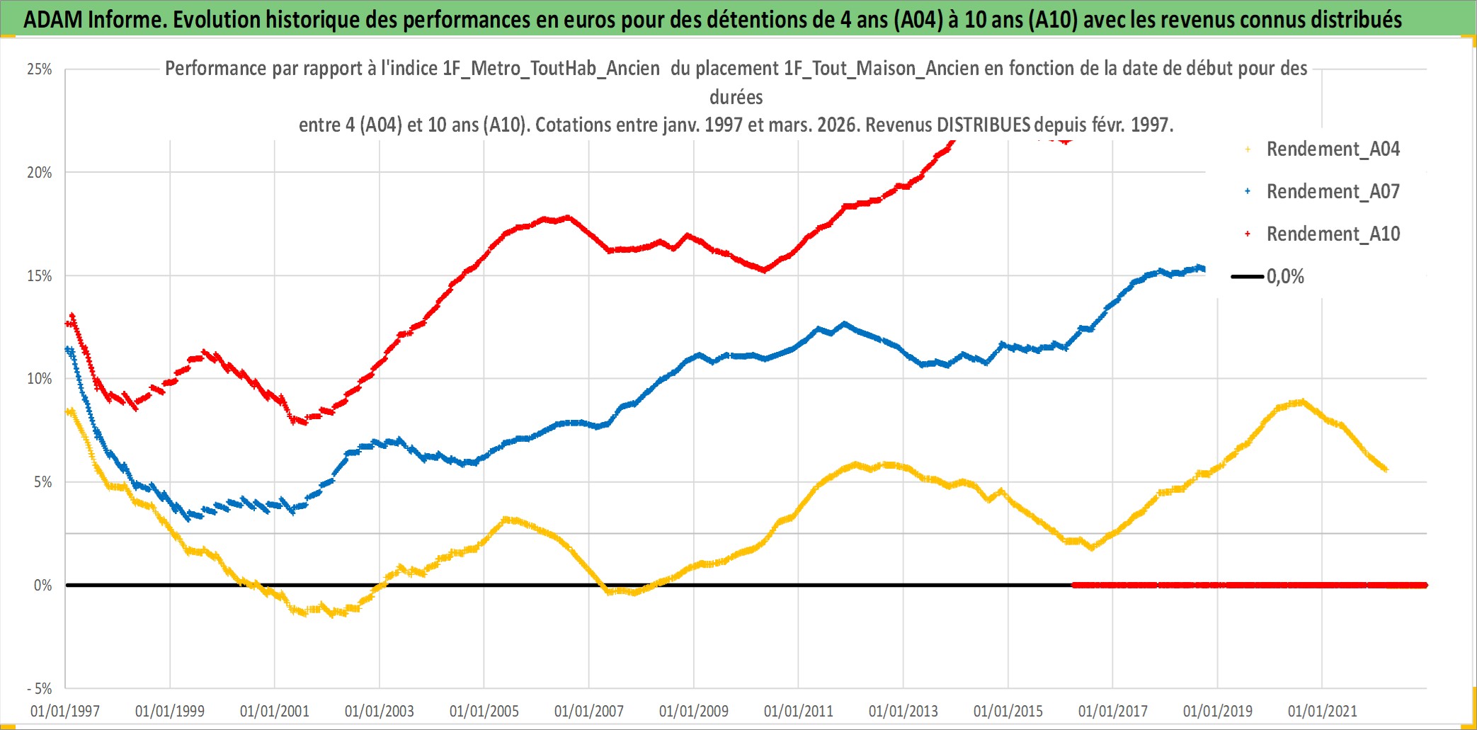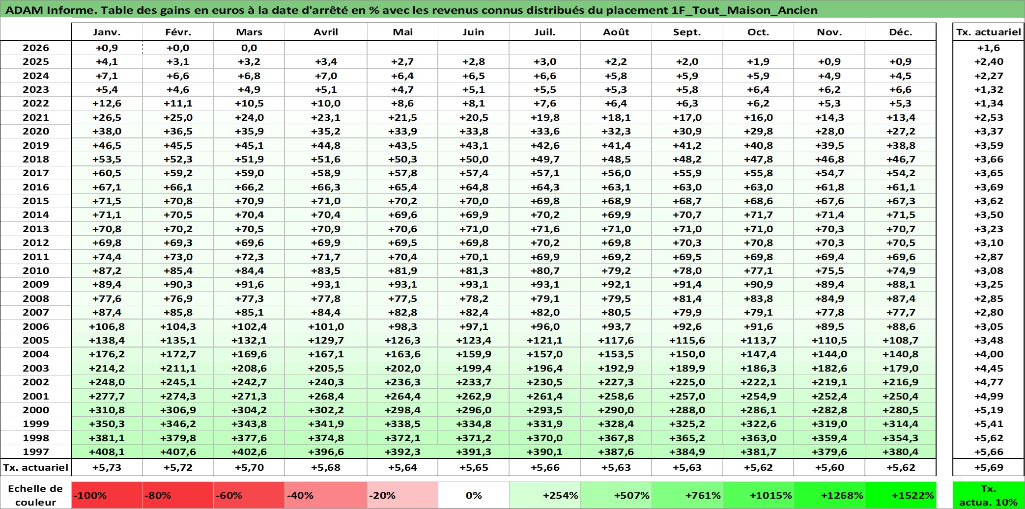 Site dédié aux investisseursPage dédiée sur site financeAnalyse des valorisations hebdomadaires de l'actif 1F_Tout_Maison_Ancien. Cet actif est cote en EUR. Les valorisations couvrent les semaines 1997W01 a 2026W13. Les loyers de cet actif immobilier sont pris egaux a 3,33% annuels de la valeur venale du logement.