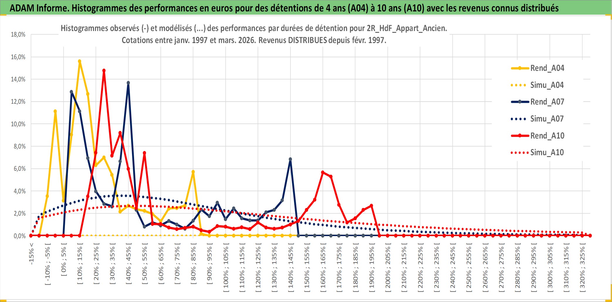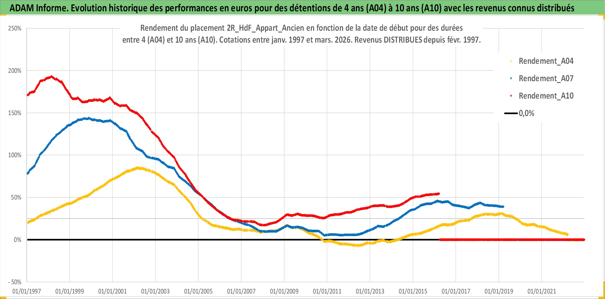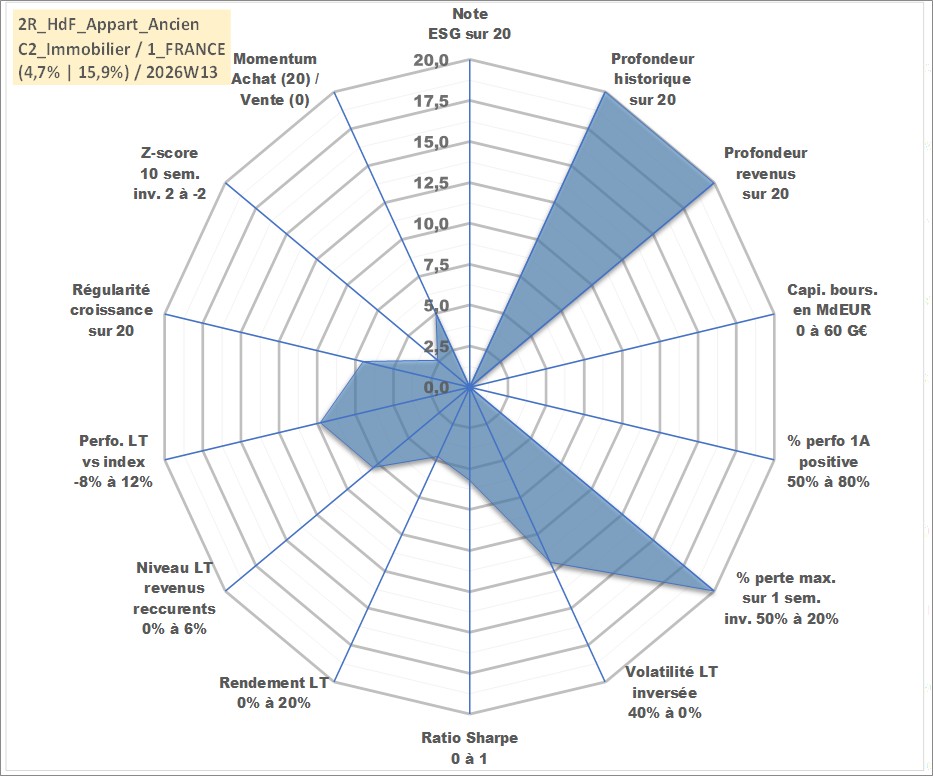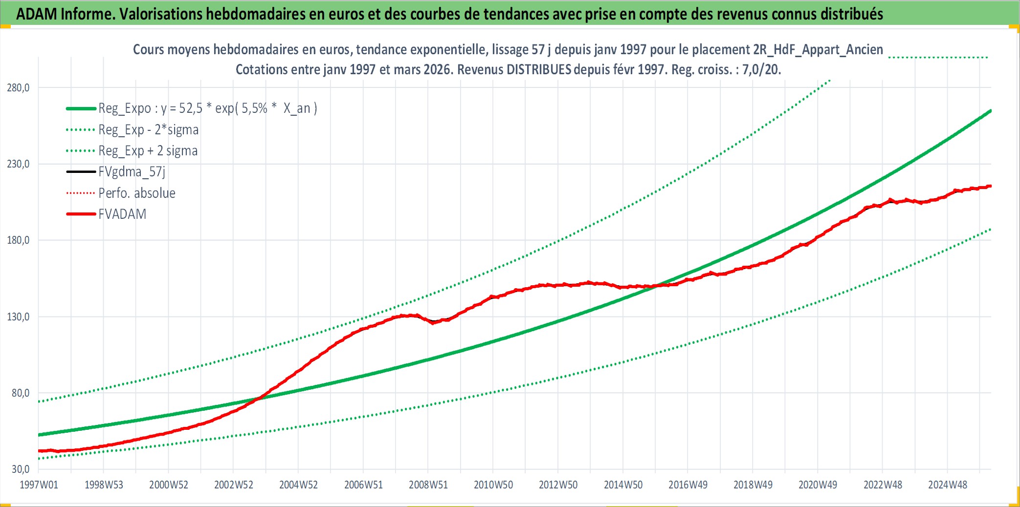 Site dédié aux investisseursPage dédiée sur site financeAnalyse des valorisations hebdomadaires de l'actif 2R_HdF_Appart_Ancien. Cet actif est cote en EUR. Les valorisations couvrent les semaines 1997W01 a 2026W13. Les loyers de cet actif immobilier sont pris egaux a 3,33% annuels de la valeur venale du logement.
