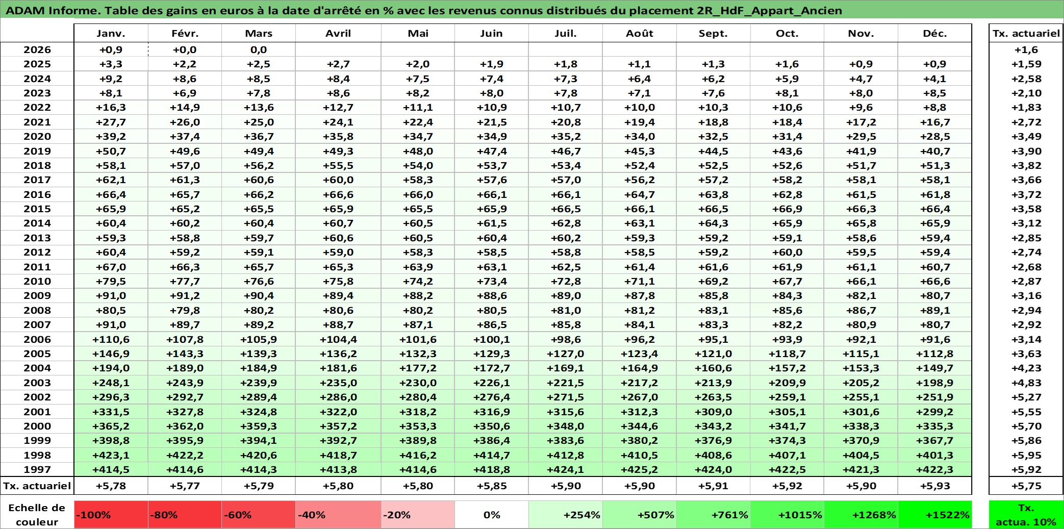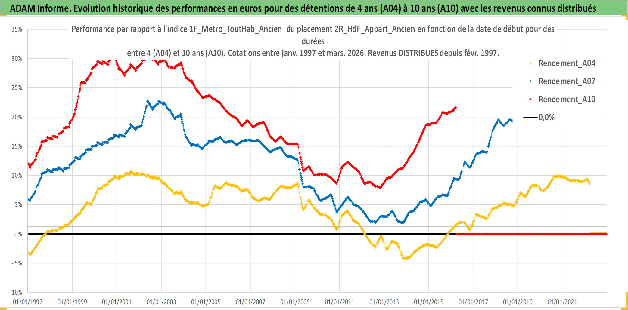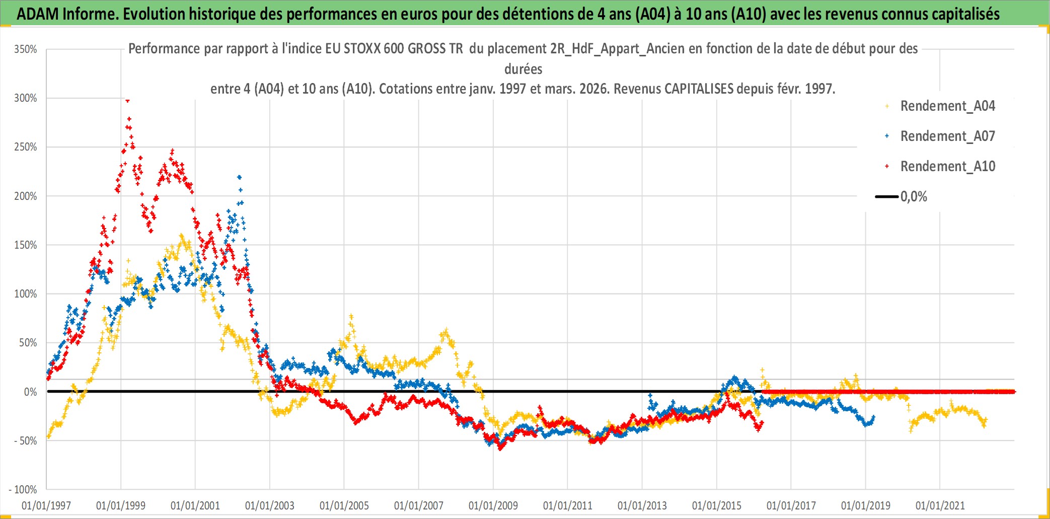 Site dédié aux investisseursPage dédiée sur site financeAnalyse des valorisations hebdomadaires de l'actif 2R_HdF_Appart_Ancien. Cet actif est cote en EUR. Les valorisations couvrent les semaines 1997W01 a 2026W13. Les loyers de cet actif immobilier sont pris egaux a 3,33% annuels de la valeur venale du logement.
