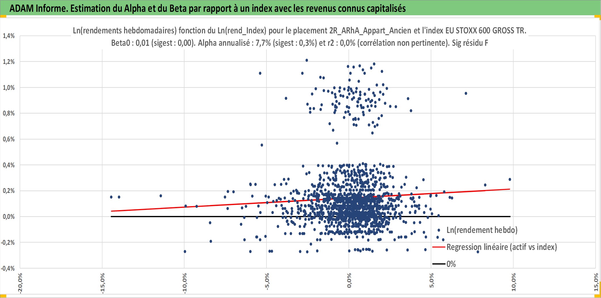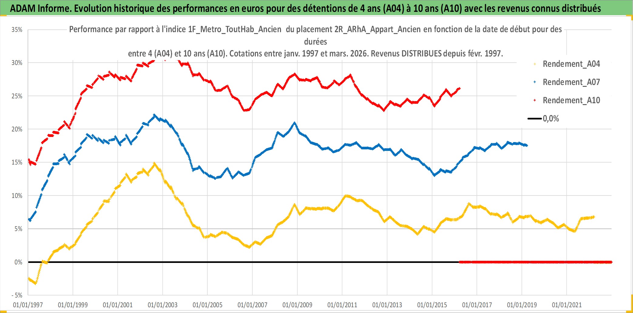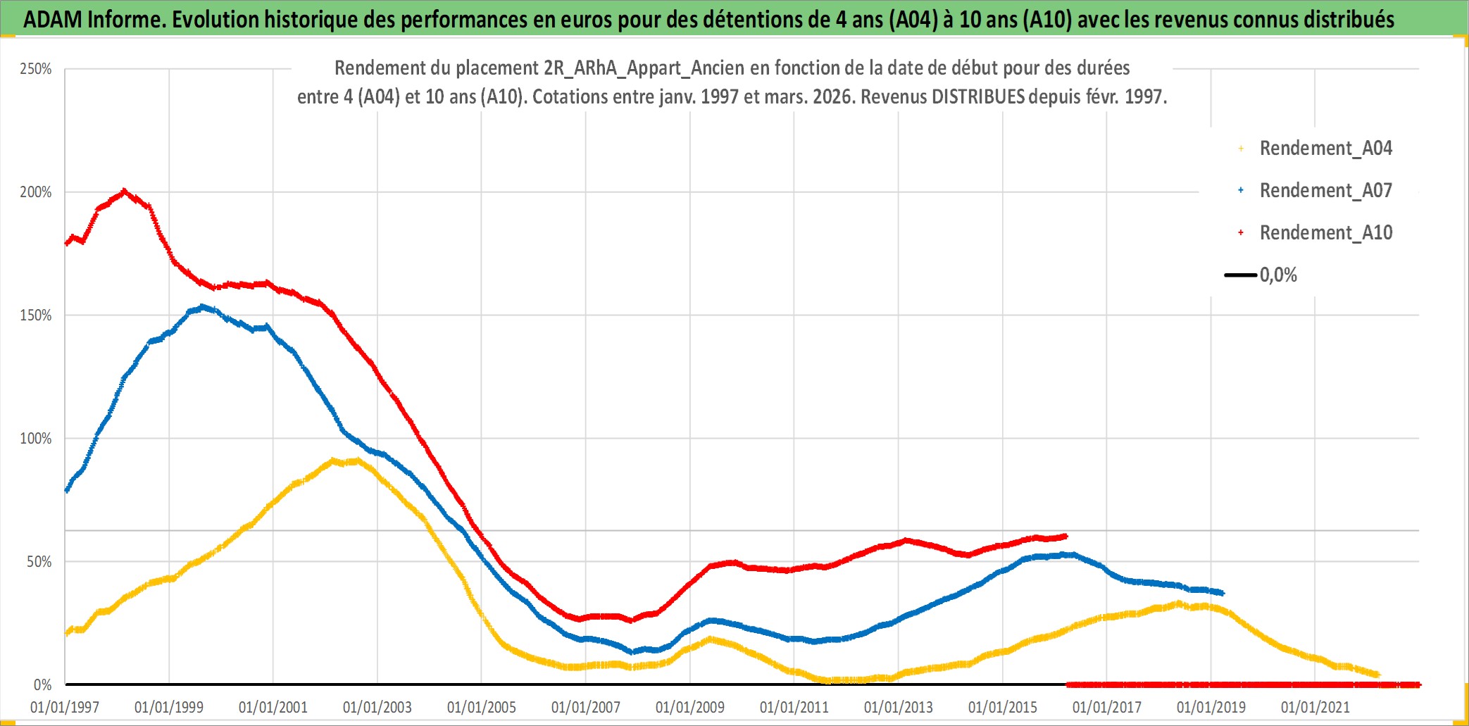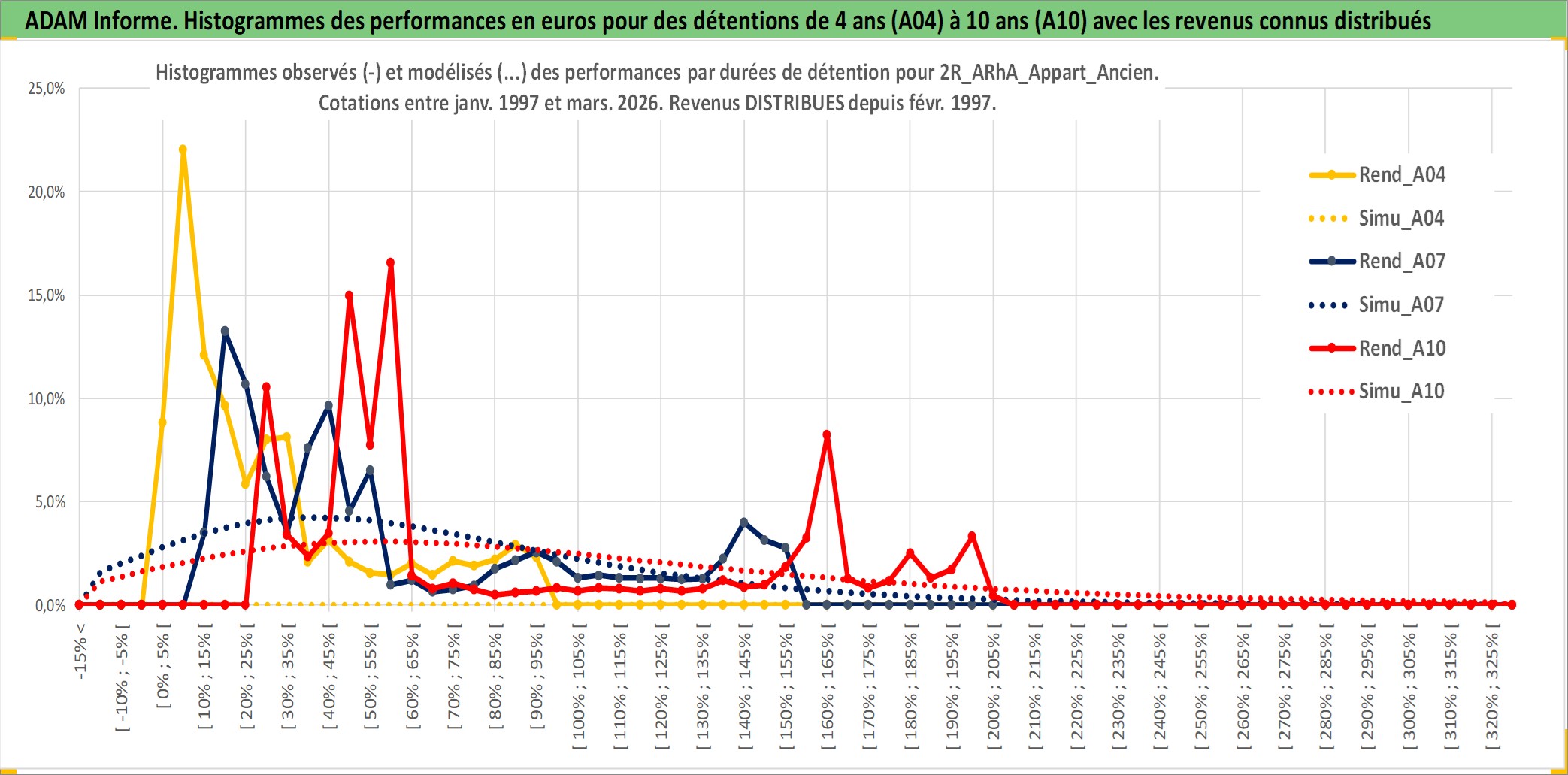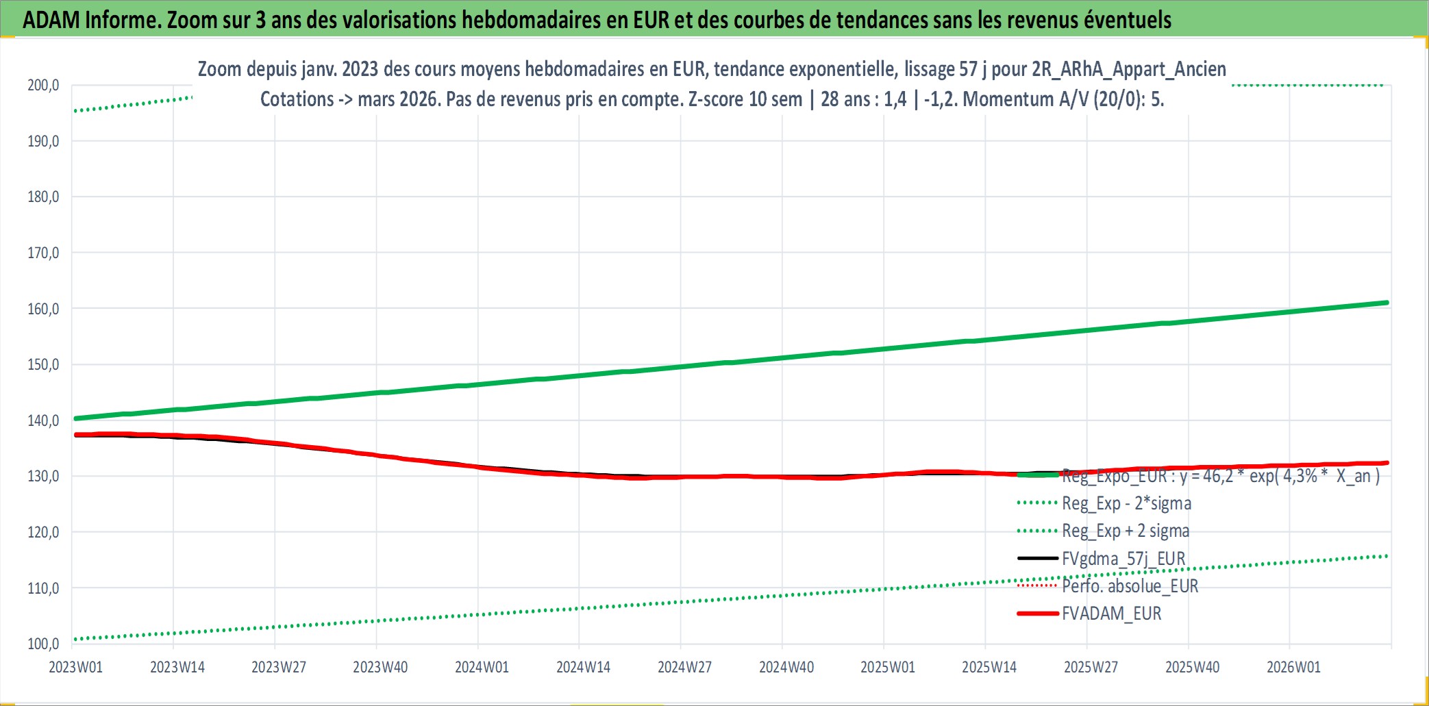 Site dédié aux investisseursPage dédiée sur site financeAnalyse des valorisations hebdomadaires de l'actif 2R_ARhA_Appart_Ancien. Cet actif est cote en EUR. Les valorisations couvrent les semaines 1997W01 a 2026W13. Les loyers de cet actif immobilier sont pris egaux a 3,33% annuels de la valeur venale du logement.