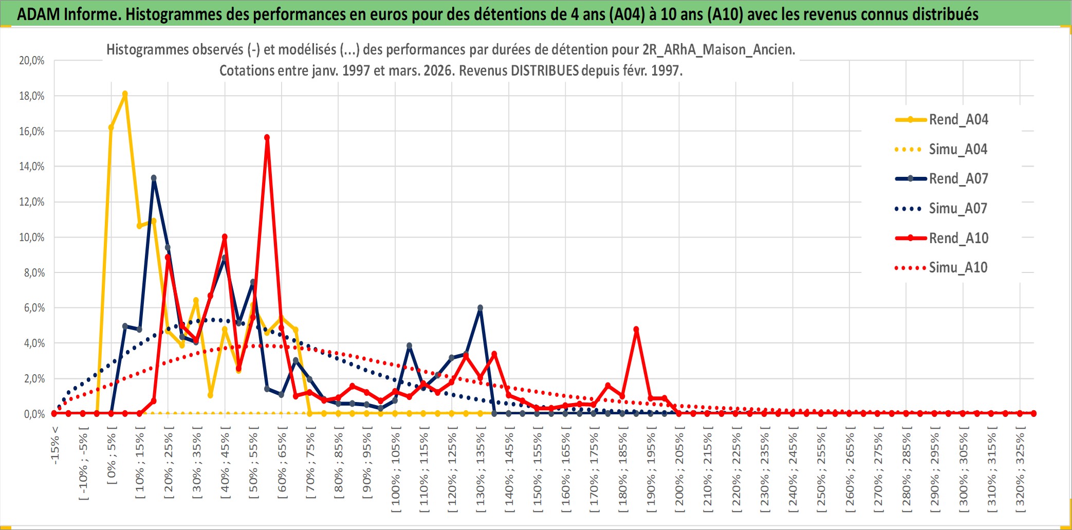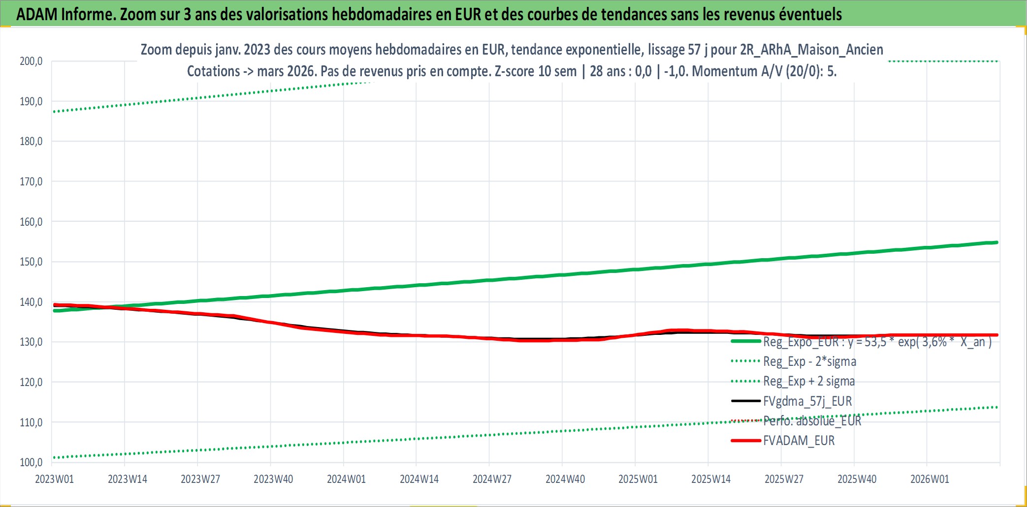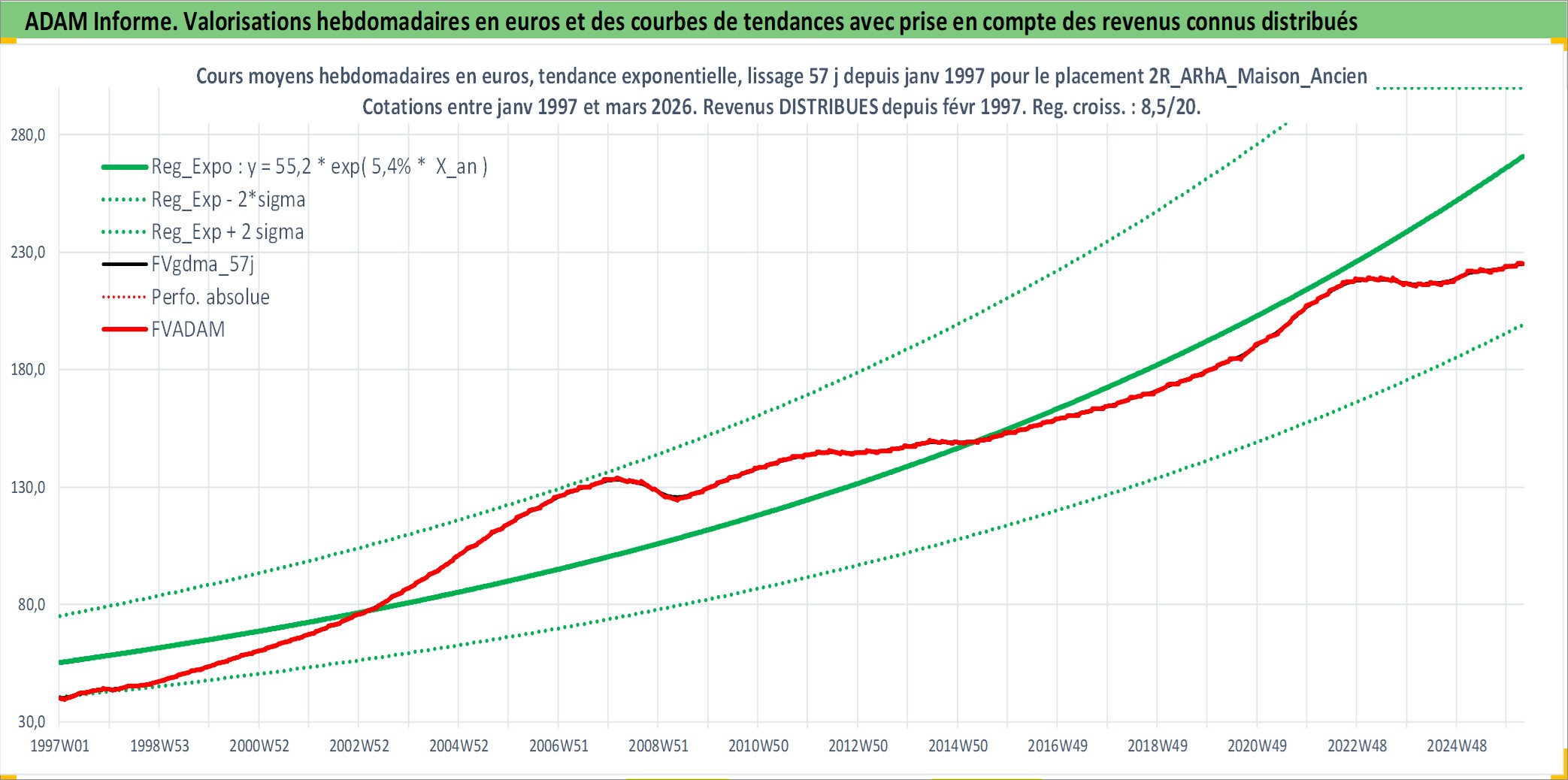 Site dédié aux investisseursPage dédiée sur site financeAnalyse des valorisations hebdomadaires de l'actif 2R_ARhA_Maison_Ancien. Cet actif est cote en EUR. Les valorisations couvrent les semaines 1997W01 a 2026W13. Les loyers de cet actif immobilier sont pris egaux a 3,33% annuels de la valeur venale du logement.
