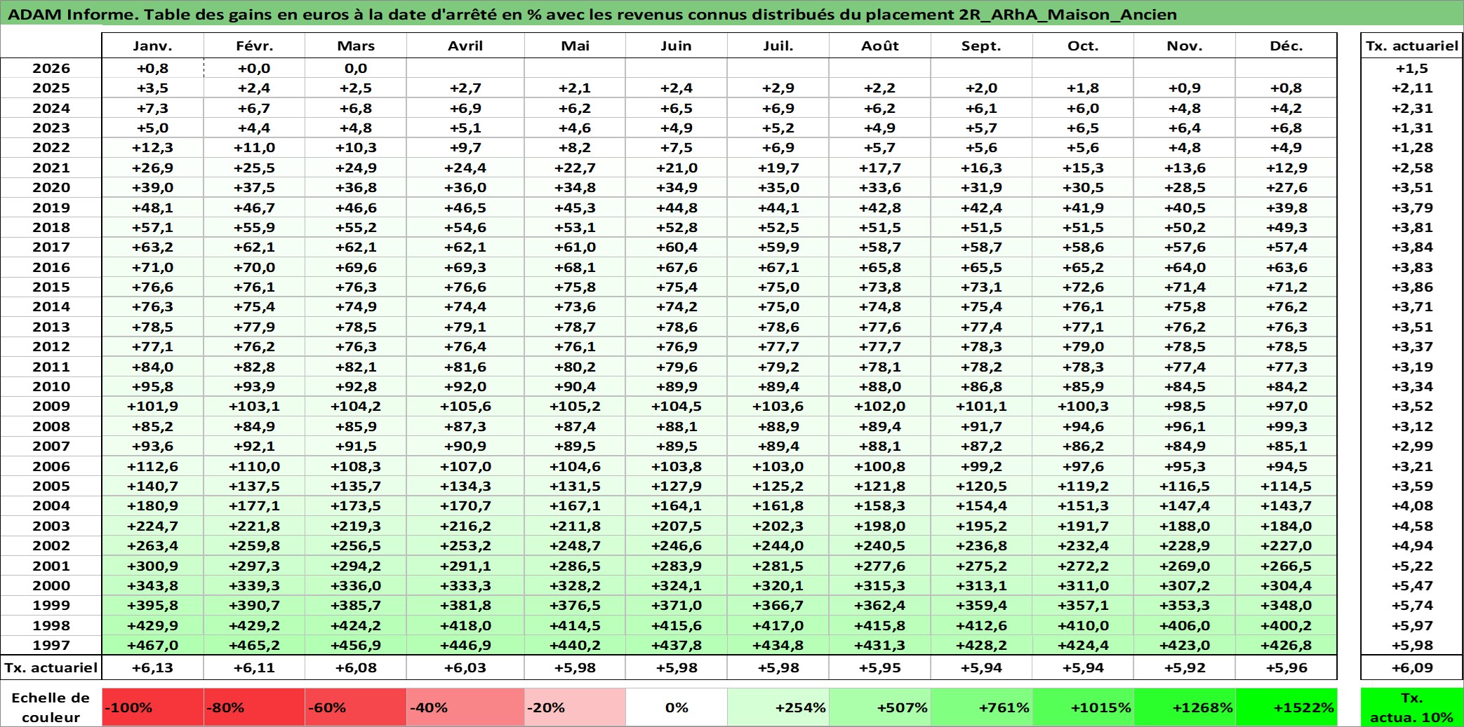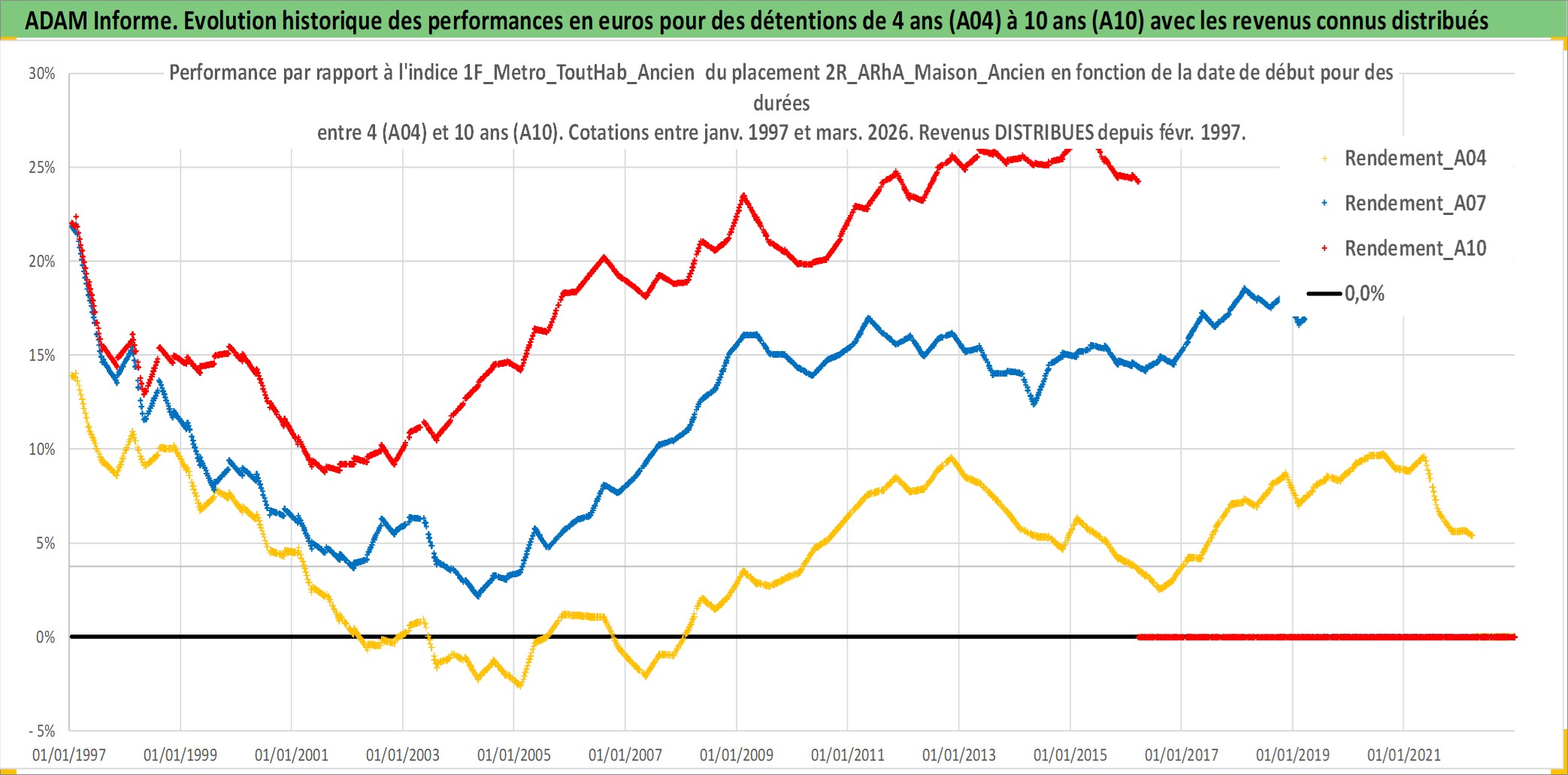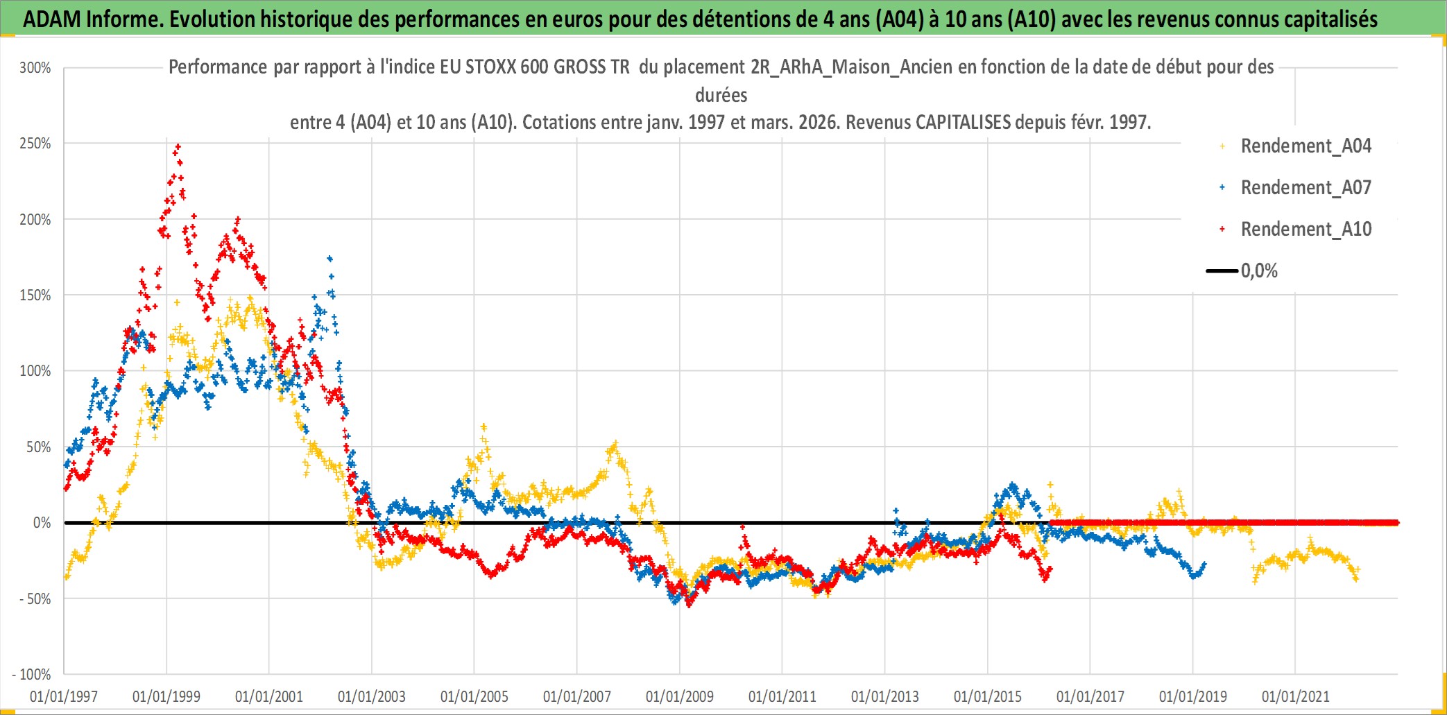 Site dédié aux investisseursPage dédiée sur site financeAnalyse des valorisations hebdomadaires de l'actif 2R_ARhA_Maison_Ancien. Cet actif est cote en EUR. Les valorisations couvrent les semaines 1997W01 a 2026W13. Les loyers de cet actif immobilier sont pris egaux a 3,33% annuels de la valeur venale du logement.