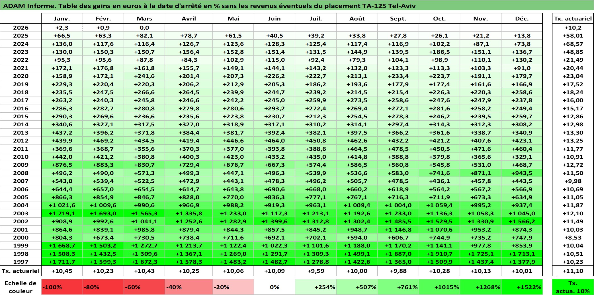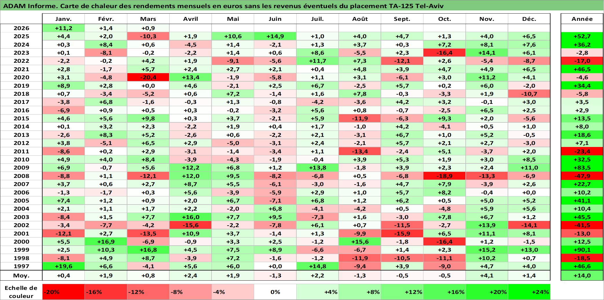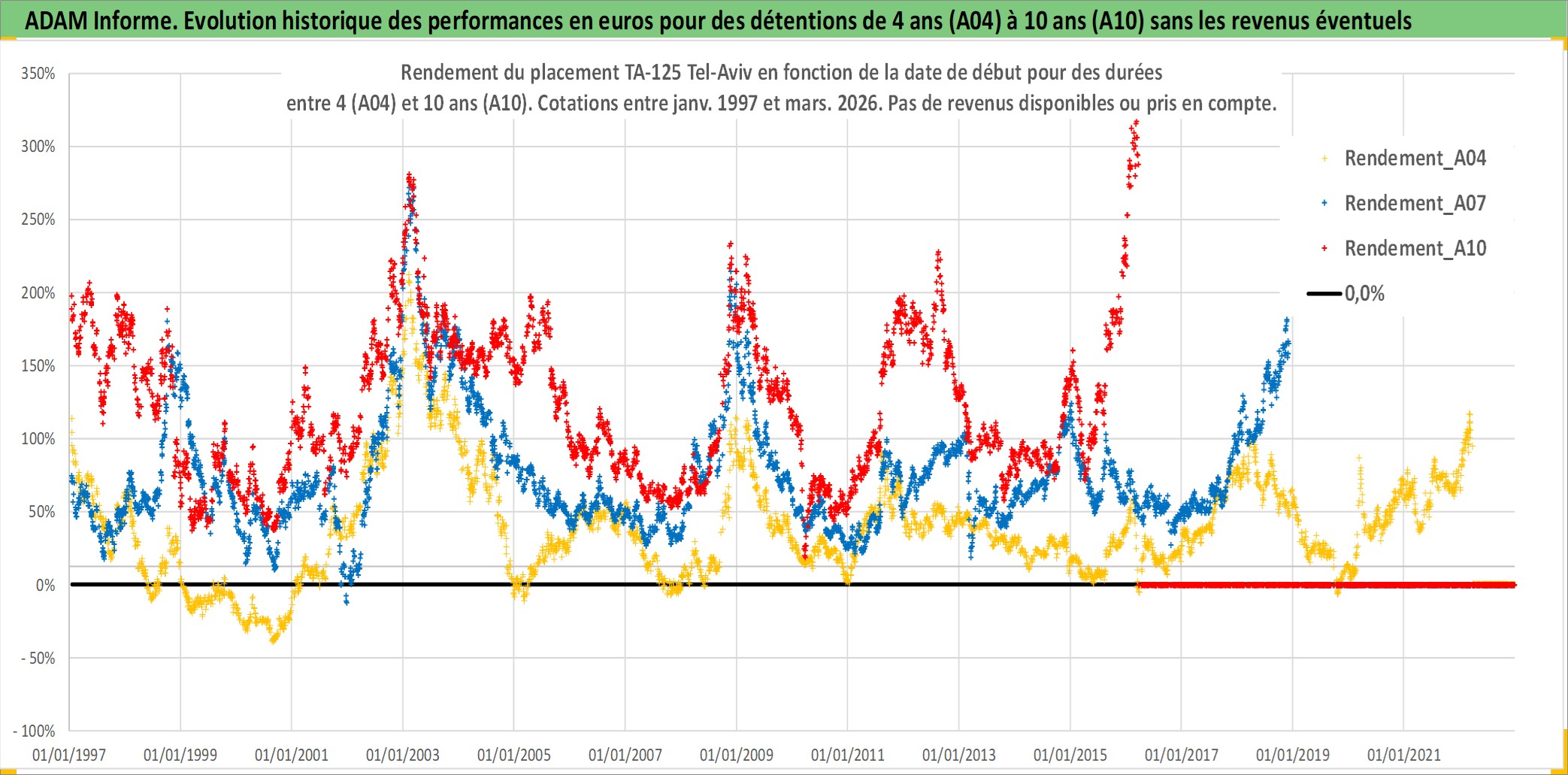 Site dédié aux investisseursPage dédiée sur site financeAnalyse des valorisations hebdomadaires de l'actif TA-125 Tel-Aviv. Cet actif est cote en ILS. Les valorisations sont en contrevaleur EURO et couvrent les semaines 1997W01 a 2026W13. Les revenus de cet actif financier ne sont pas connus car non existants ou non disponibles sur le site Yahoo Finance. La note ESG de cet actif n'est pas connue.