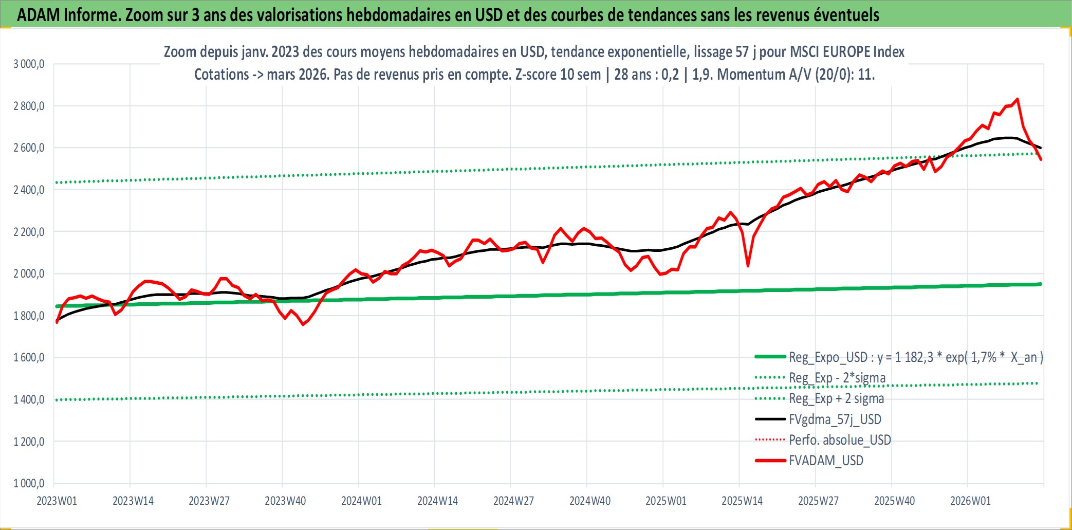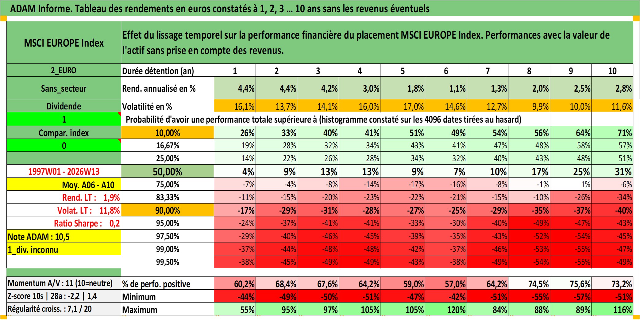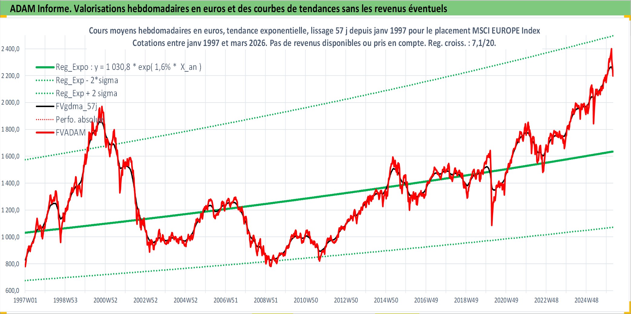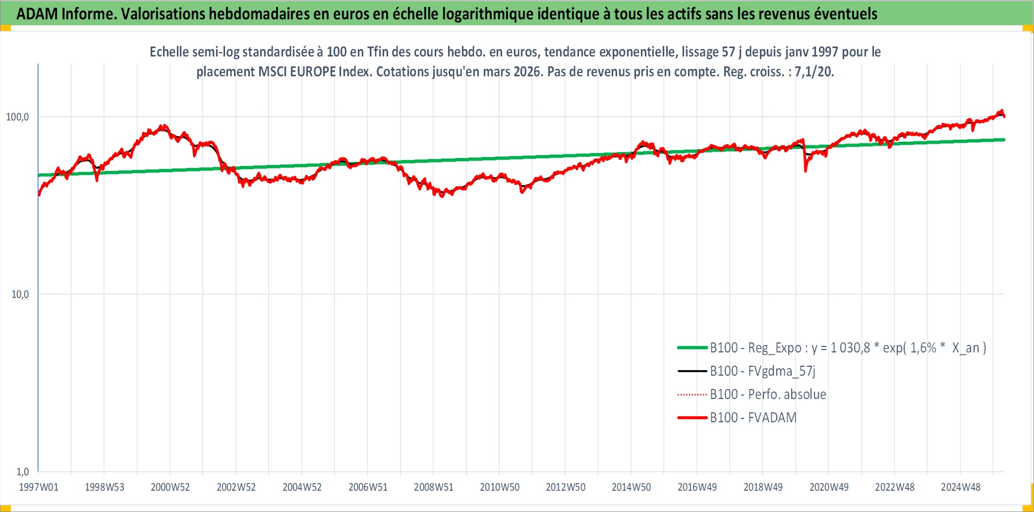 Site dédié aux investisseursPage dédiée sur site financeAnalyse des valorisations hebdomadaires de l'actif MSCI EUROPE Index. Cet actif est cote en USD. Les valorisations sont en contrevaleur EURO et couvrent les semaines 1997W01 a 2026W13. Les revenus de cet actif financier ne sont pas connus car non existants ou non disponibles sur le site Yahoo Finance. La note ESG de cet actif n'est pas connue.