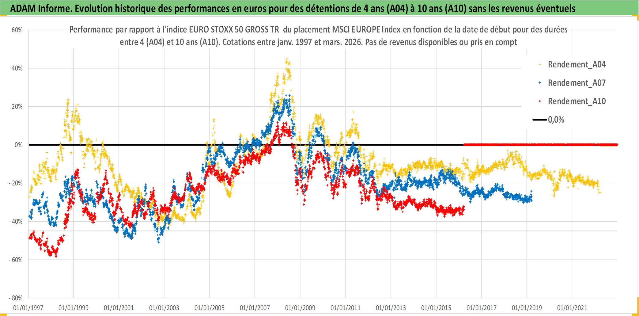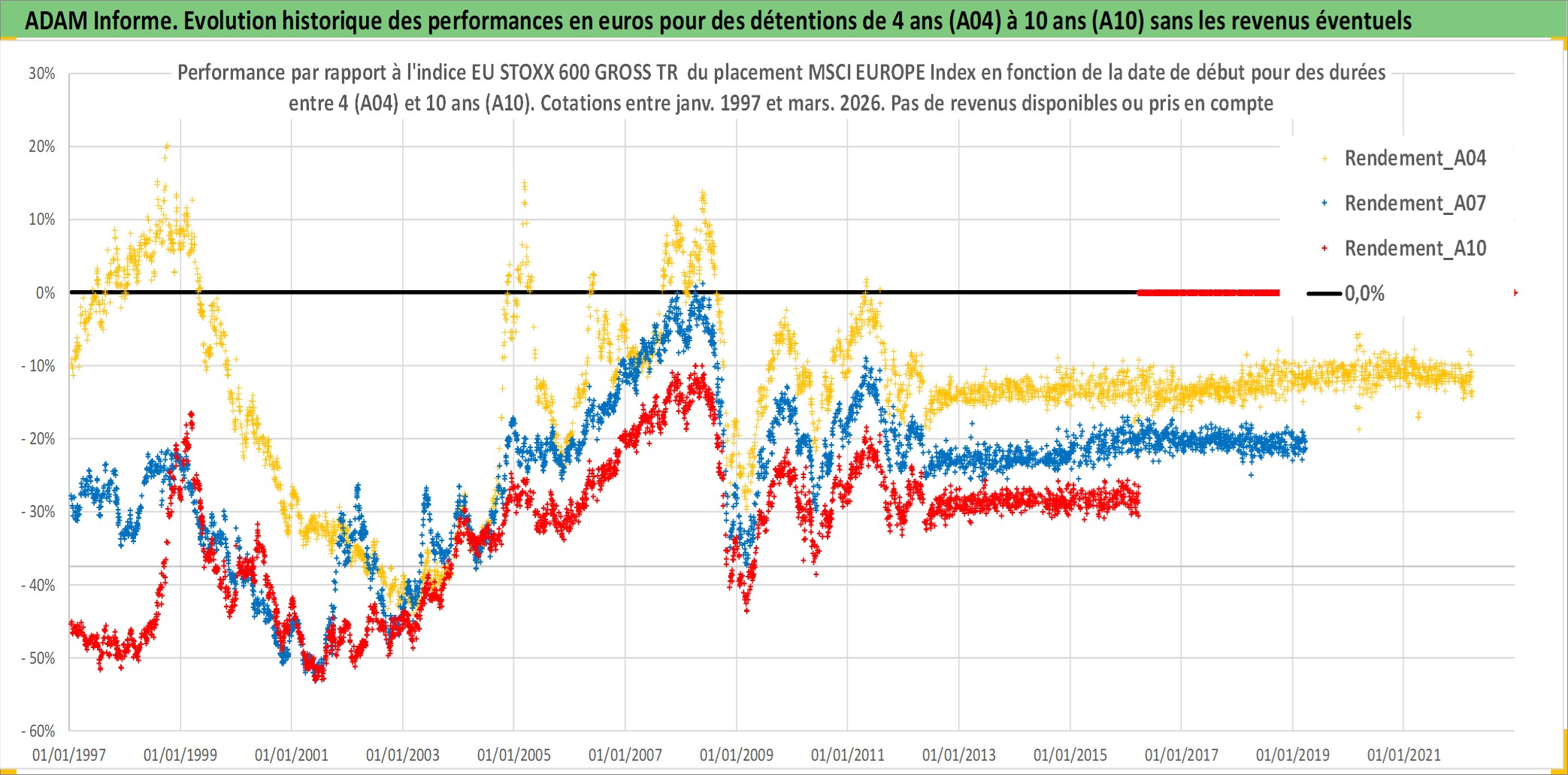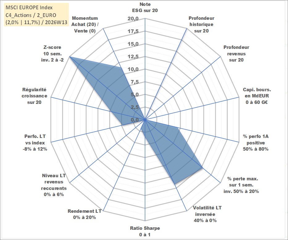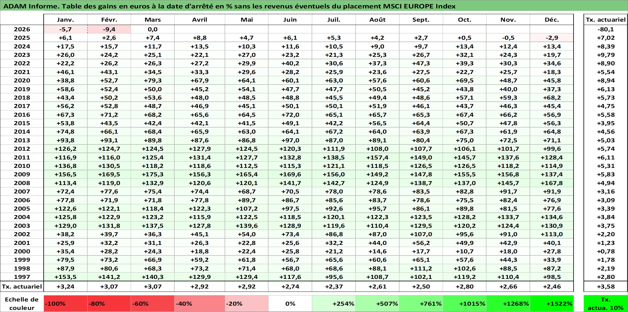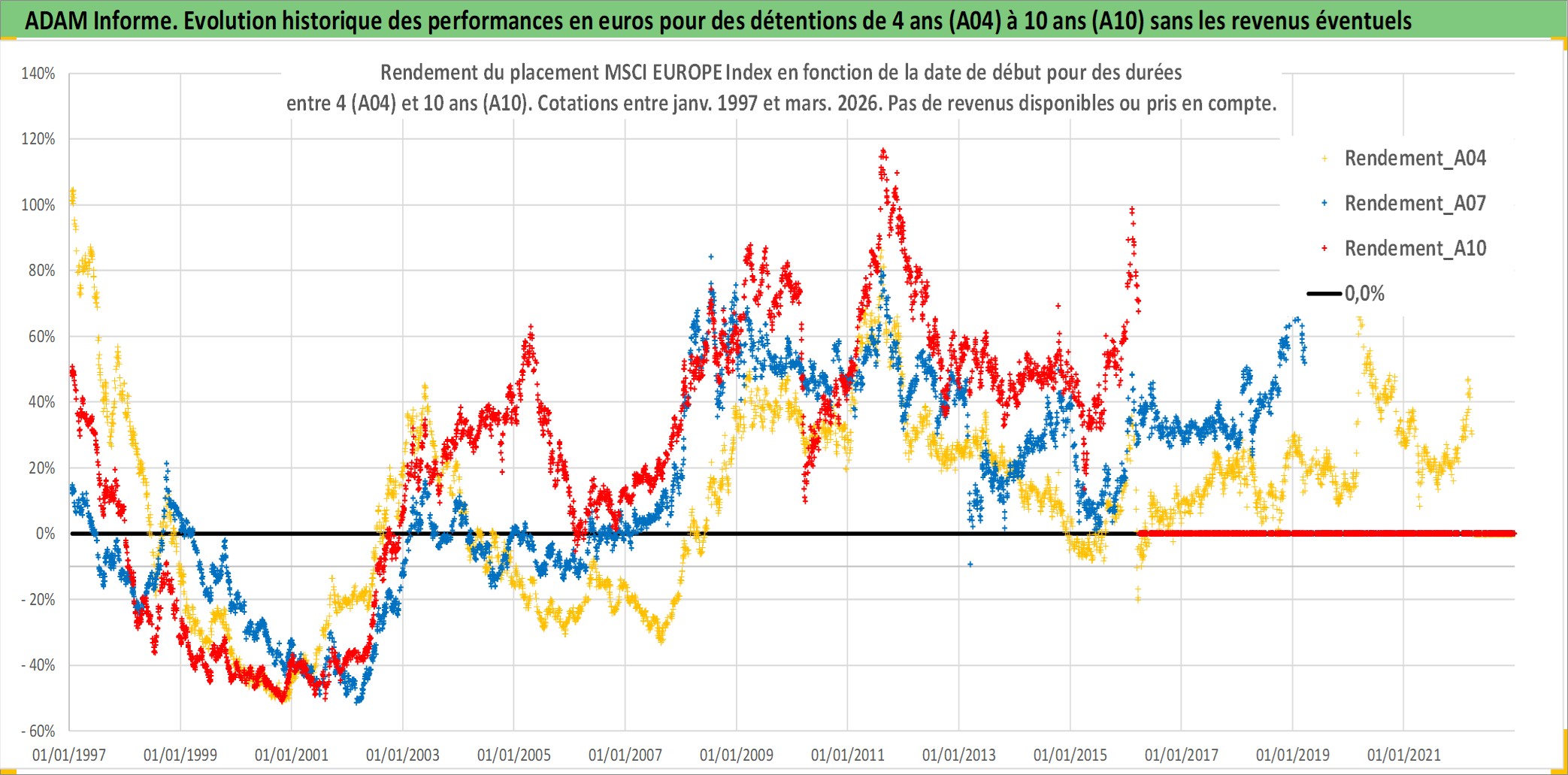Site dédié aux investisseursPage dédiée sur site financeAnalyse des valorisations hebdomadaires de l'actif MSCI EUROPE Index. Cet actif est cote en USD. Les valorisations sont en contrevaleur EURO et couvrent les semaines 1997W01 a 2026W13. Les revenus de cet actif financier ne sont pas connus car non existants ou non disponibles sur le site Yahoo Finance. La note ESG de cet actif n'est pas connue.