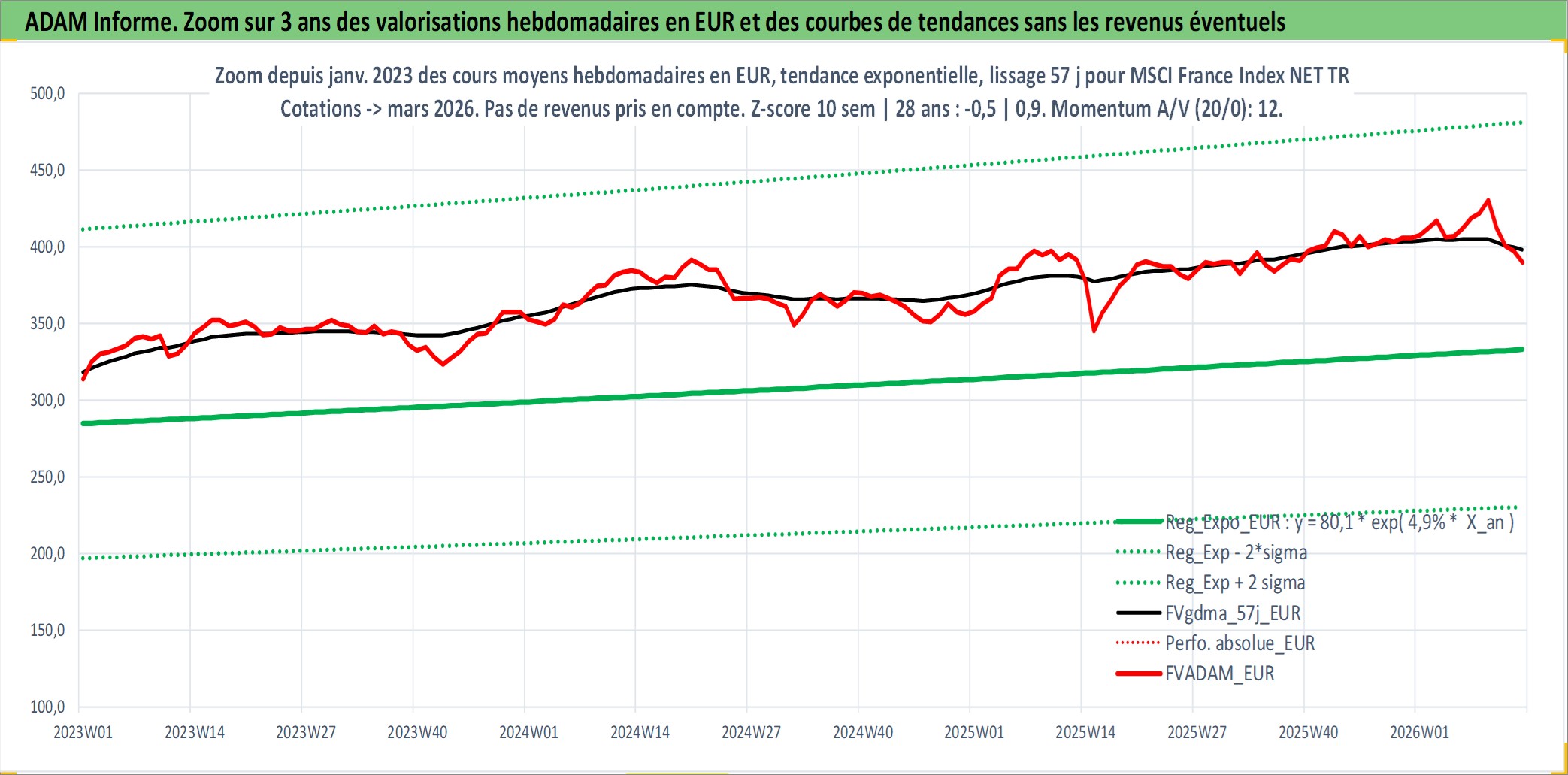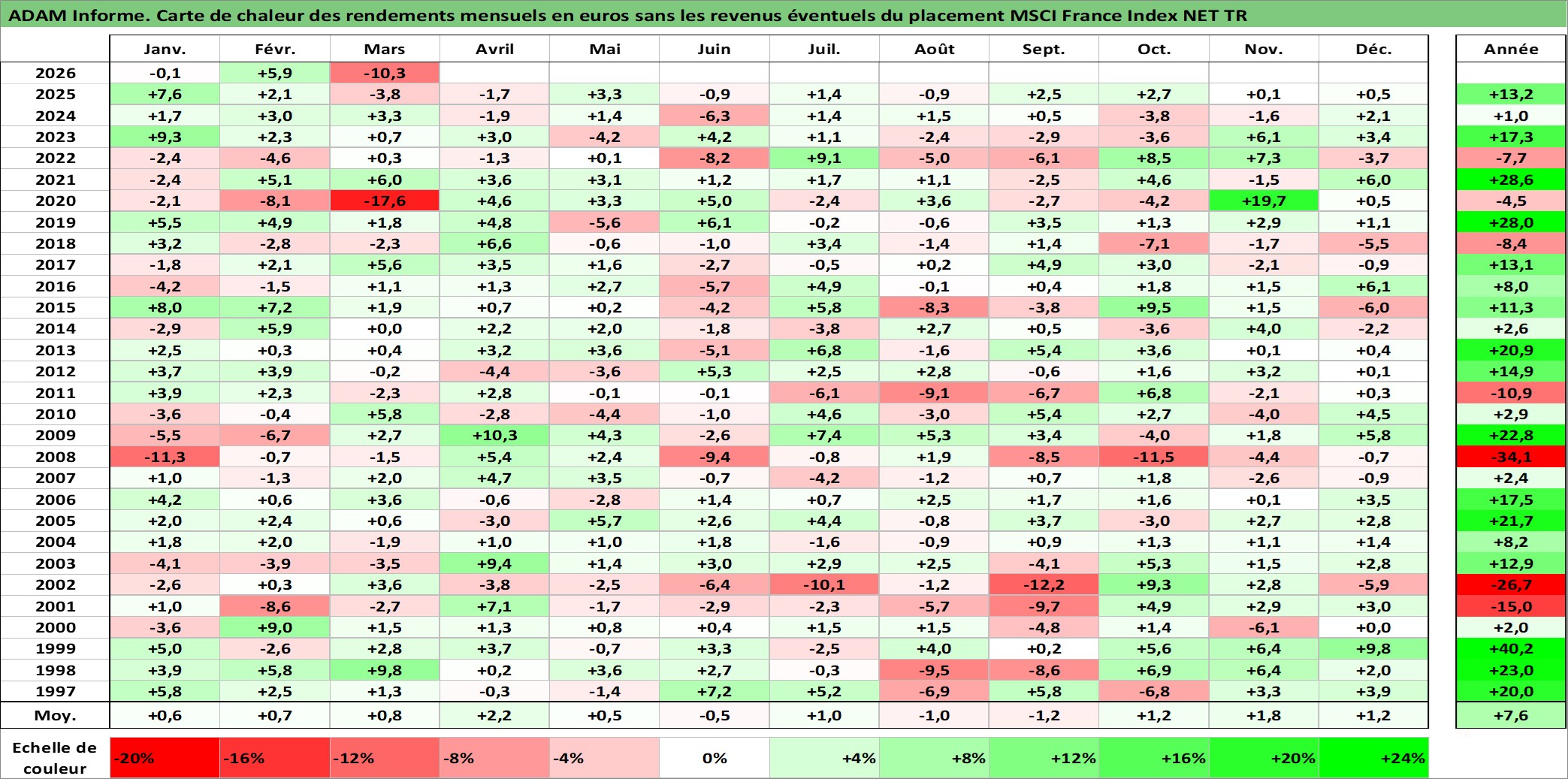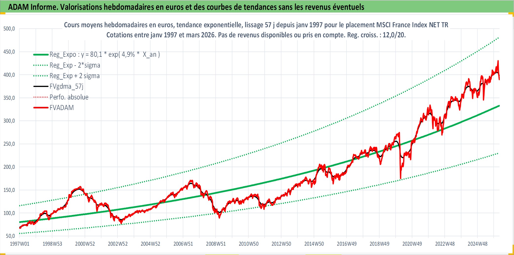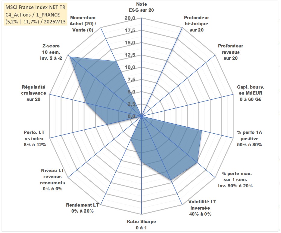 Site dédié aux investisseursPage dédiée sur site financeAnalyse des valorisations hebdomadaires de l'actif MSCI France Index NET TR. Cet actif est cote en EUR. Les valorisations couvrent les semaines 1997W01 a 2026W13. Les revenus de cet actif financier ne sont pas connus car non existants ou non disponibles sur le site Yahoo Finance. La note ESG de cet actif n'est pas connue.