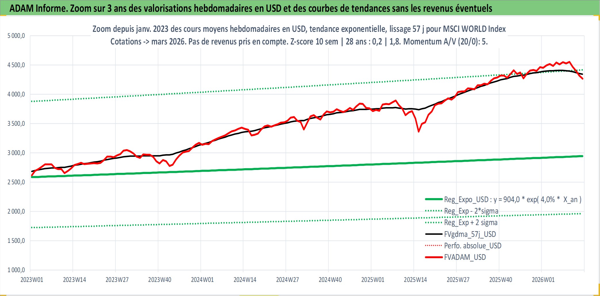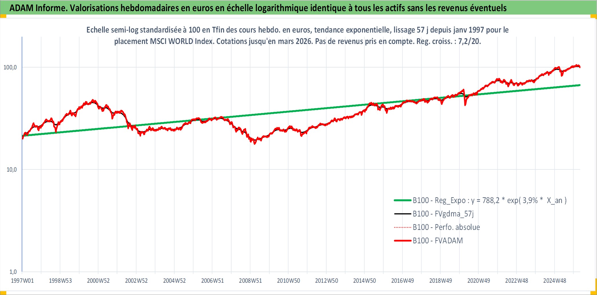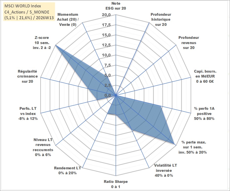 Site dédié aux investisseursPage dédiée sur site financeAnalyse des valorisations hebdomadaires de l'actif MSCI WORLD Index. Cet actif est cote en USD. Les valorisations sont en contrevaleur EURO et couvrent les semaines 1997W01 a 2026W13. Les revenus de cet actif financier ne sont pas connus car non existants ou non disponibles sur le site Yahoo Finance. La note ESG de cet actif n'est pas connue.