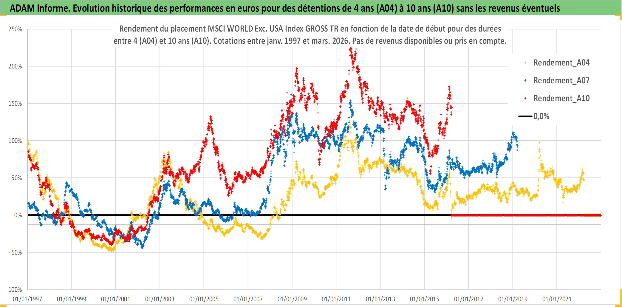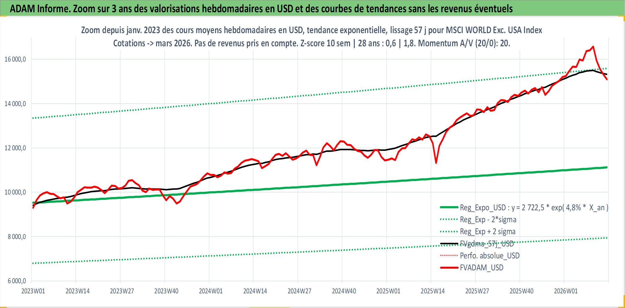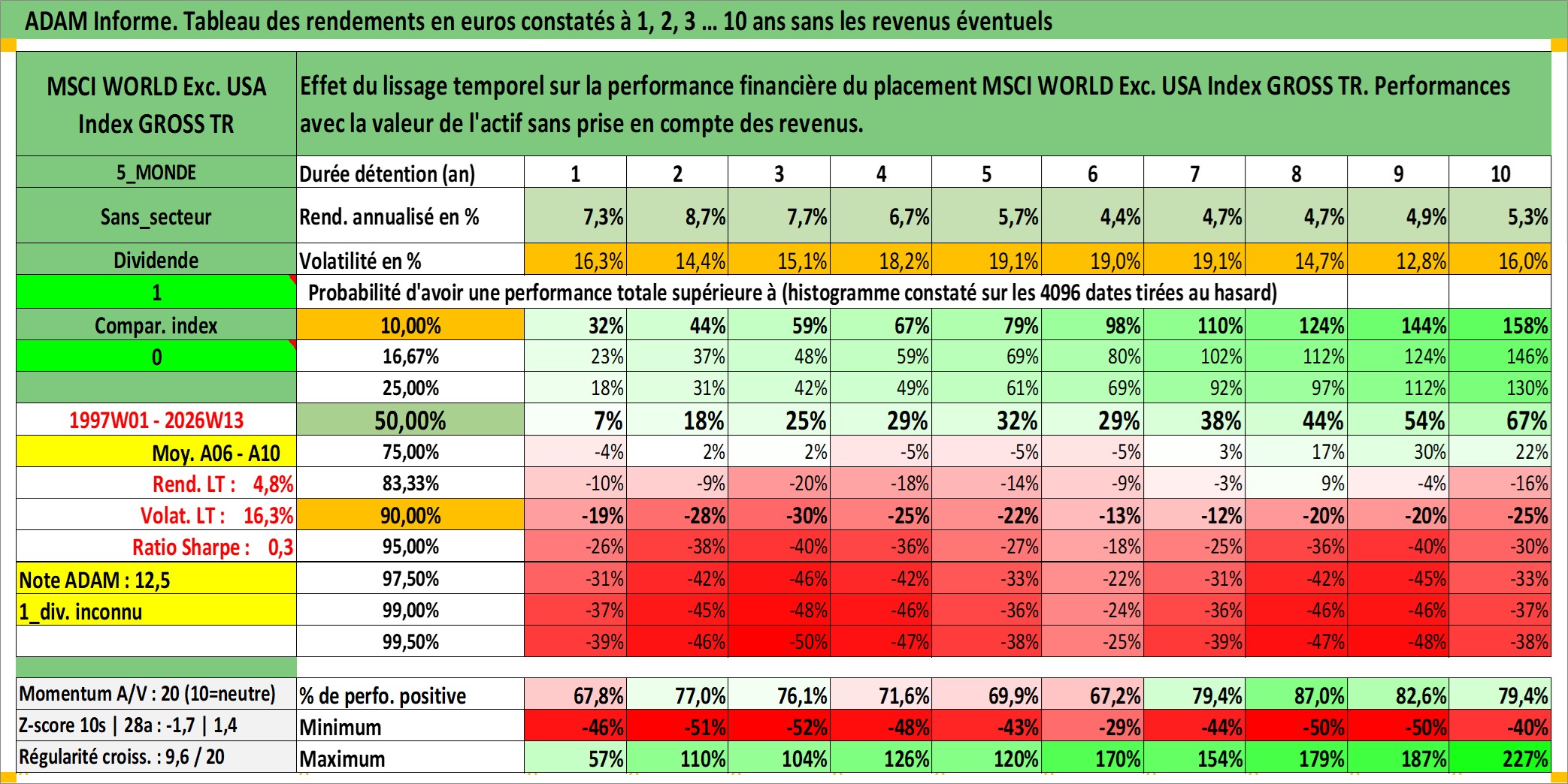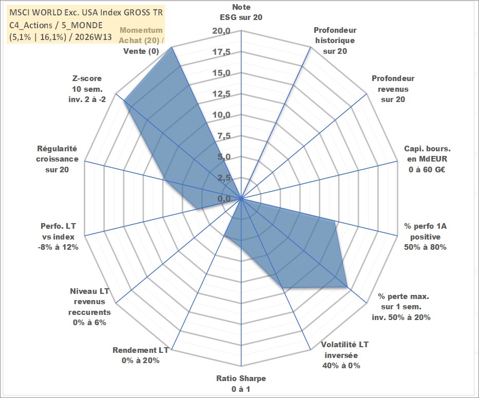 Site dédié aux investisseursPage dédiée sur site financeAnalyse des valorisations hebdomadaires de l'actif MSCI WORLD Exc. USA Index GROSS TR. Cet actif est cote en USD. Les valorisations sont en contrevaleur EURO et couvrent les semaines 1997W01 a 2026W13. Les revenus de cet actif financier ne sont pas connus car non existants ou non disponibles sur le site Yahoo Finance. La note ESG de cet actif n'est pas connue.