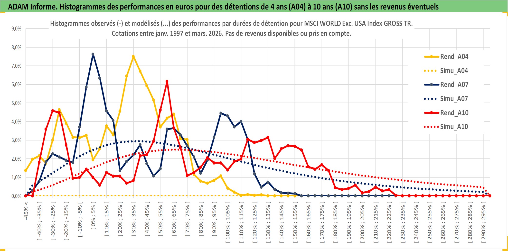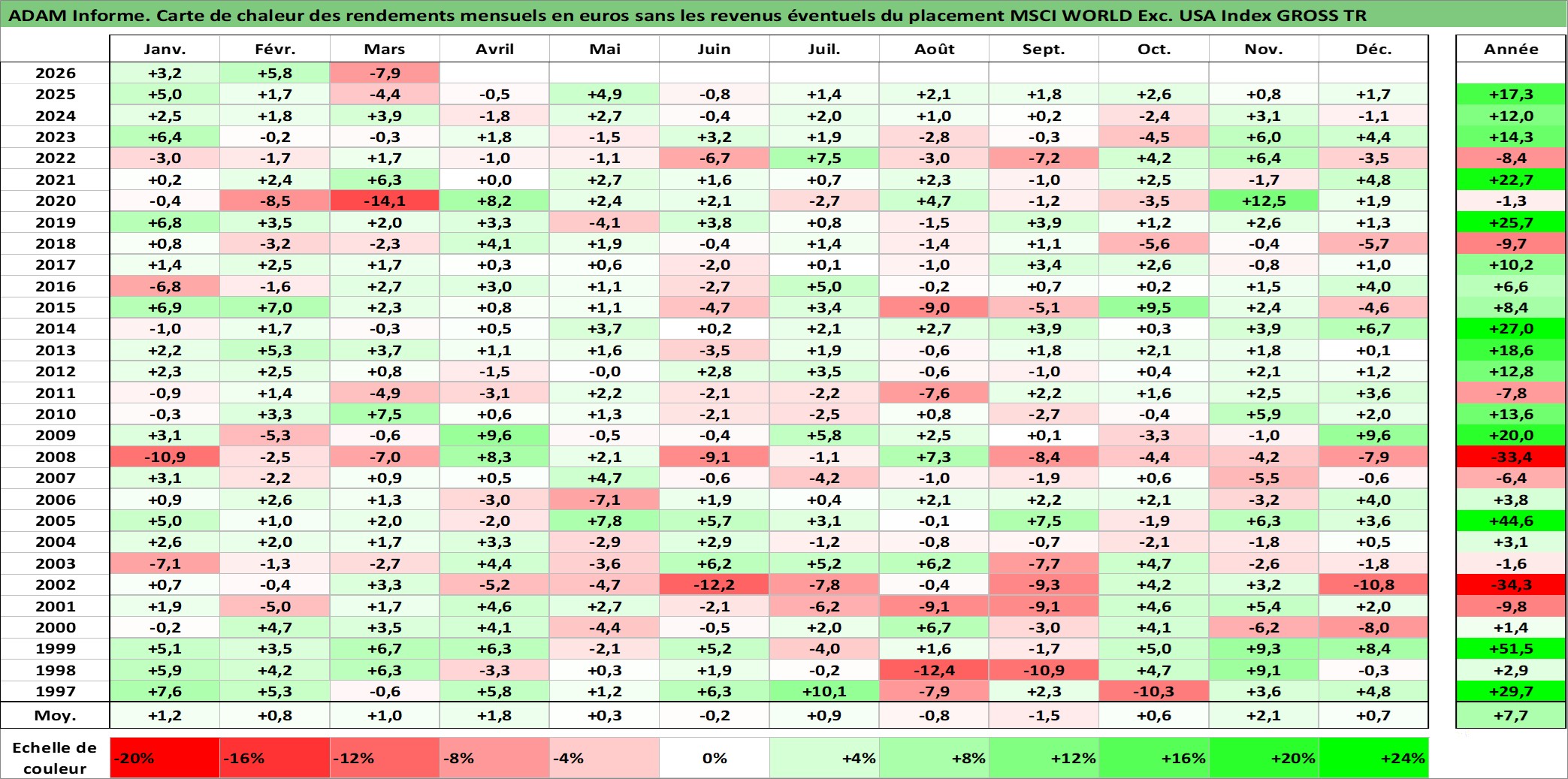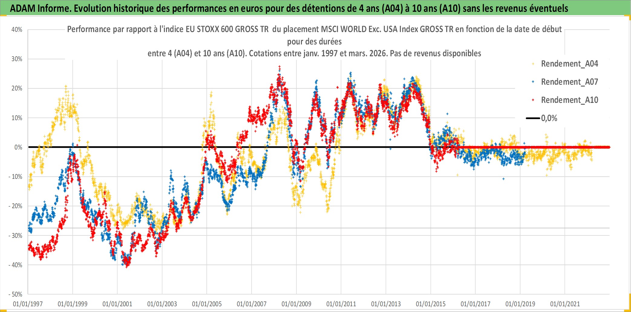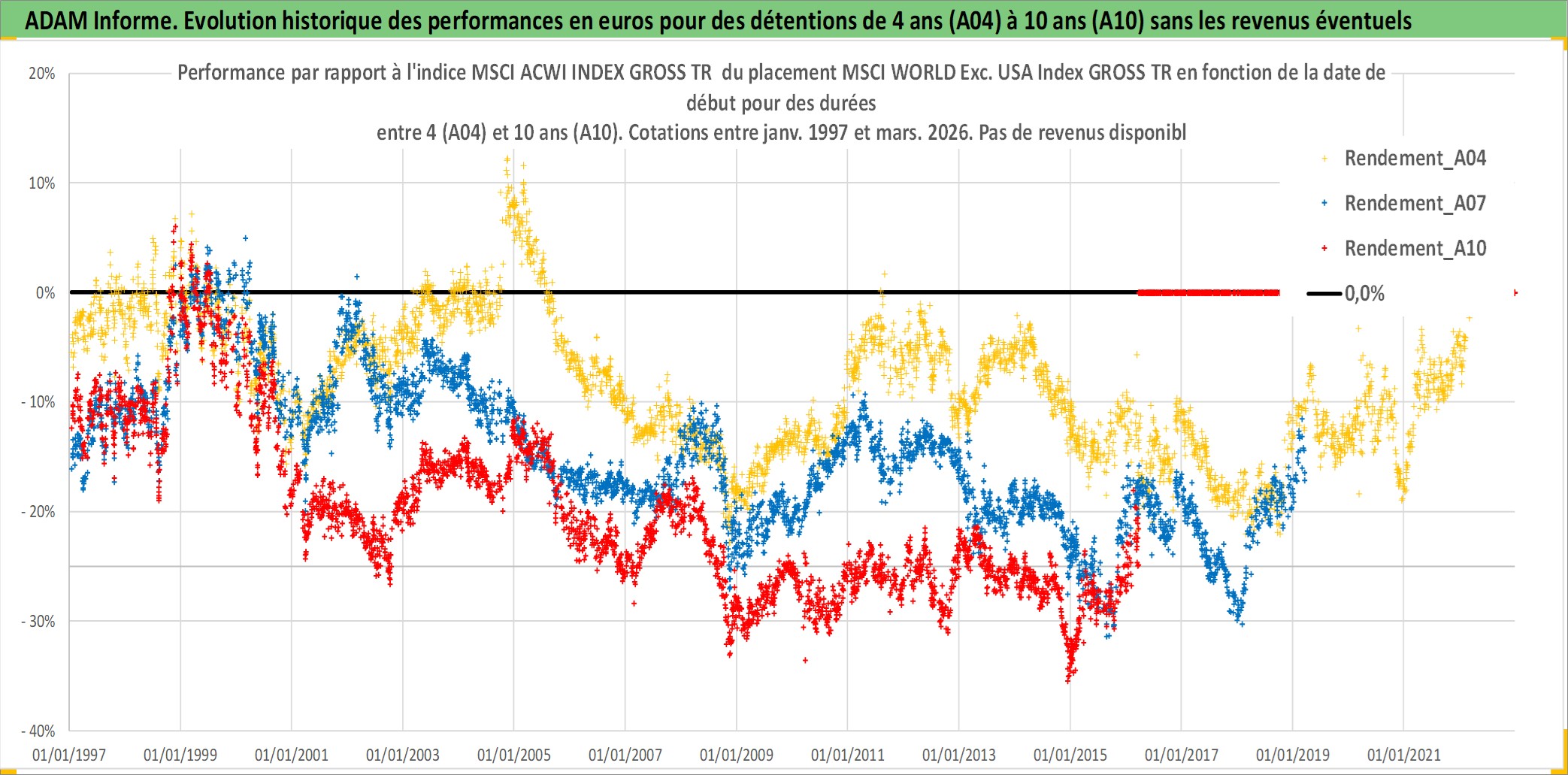 Site dédié aux investisseursPage dédiée sur site financeAnalyse des valorisations hebdomadaires de l'actif MSCI WORLD Exc. USA Index GROSS TR. Cet actif est cote en USD. Les valorisations sont en contrevaleur EURO et couvrent les semaines 1997W01 a 2026W13. Les revenus de cet actif financier ne sont pas connus car non existants ou non disponibles sur le site Yahoo Finance. La note ESG de cet actif n'est pas connue.