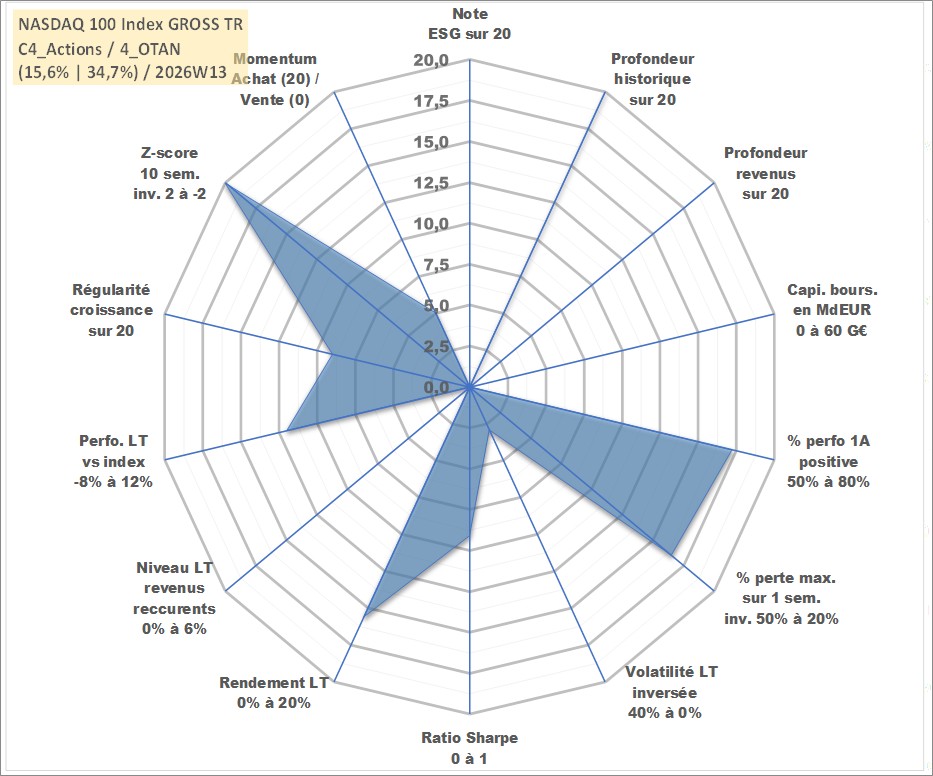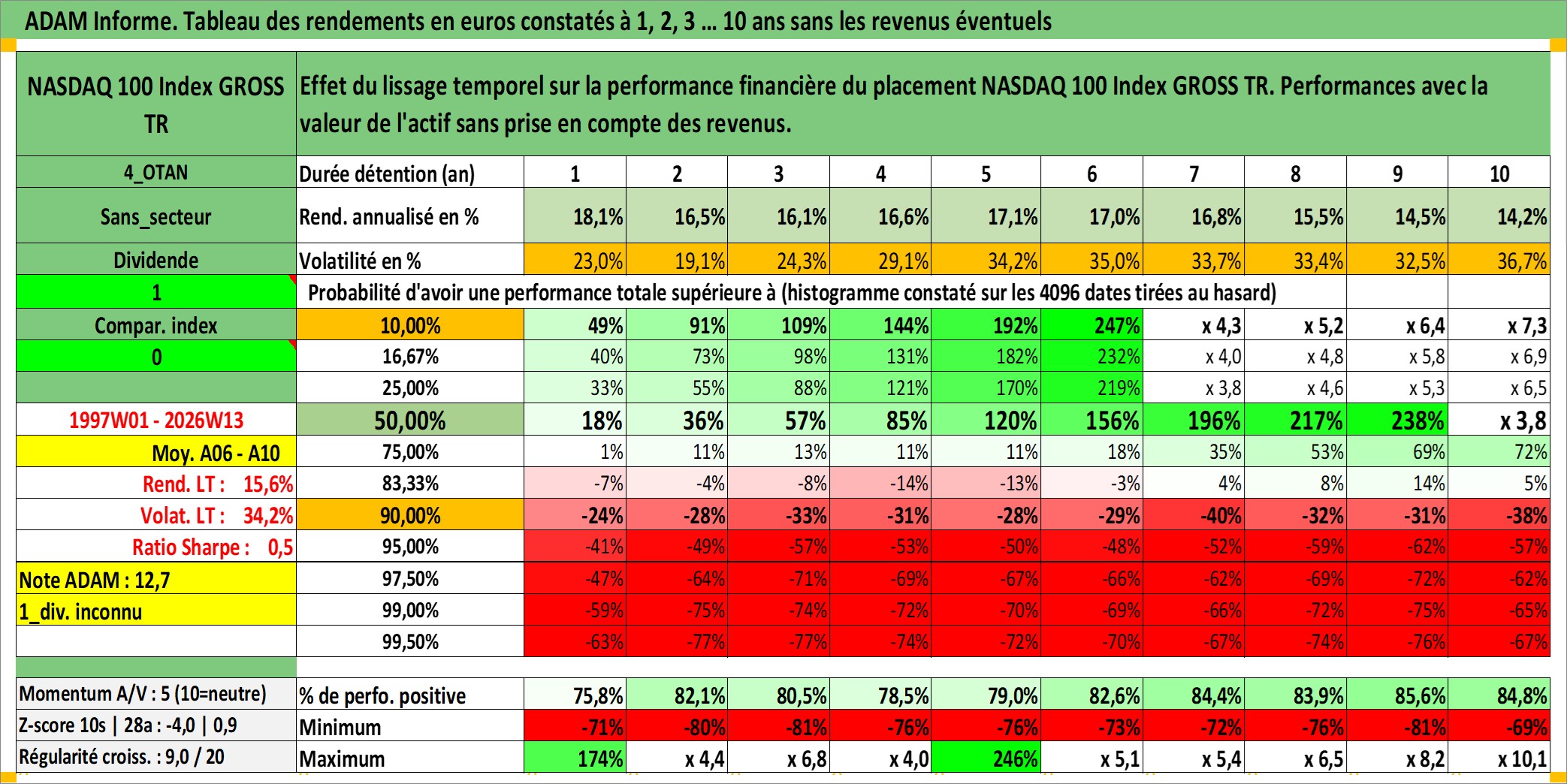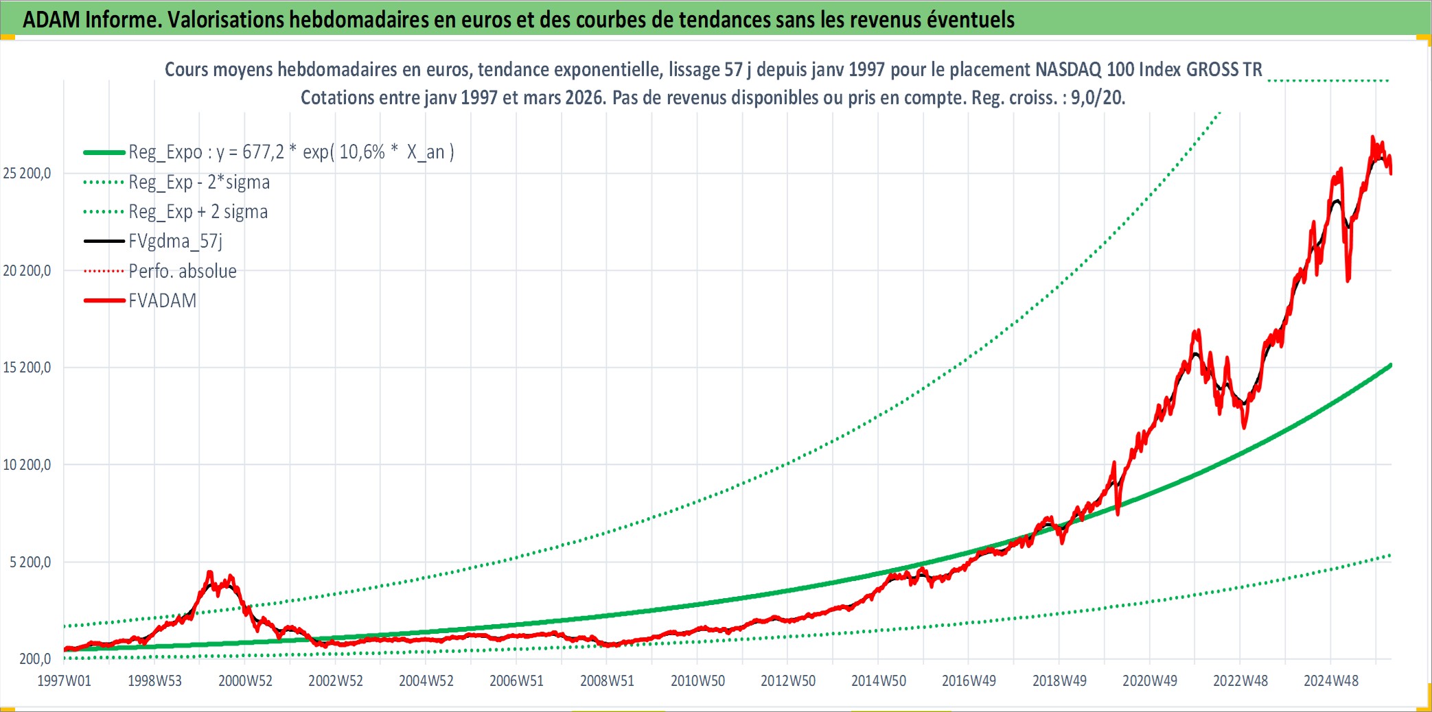 Site dédié aux investisseursPage dédiée sur site financeAnalyse des valorisations hebdomadaires de l'actif NASDAQ 100 Index GROSS TR. Cet actif est cote en USD. Les valorisations sont en contrevaleur EURO et couvrent les semaines 1997W01 a 2026W13. Les revenus de cet actif financier ne sont pas connus car non existants ou non disponibles sur le site Yahoo Finance. La note ESG de cet actif n'est pas connue.