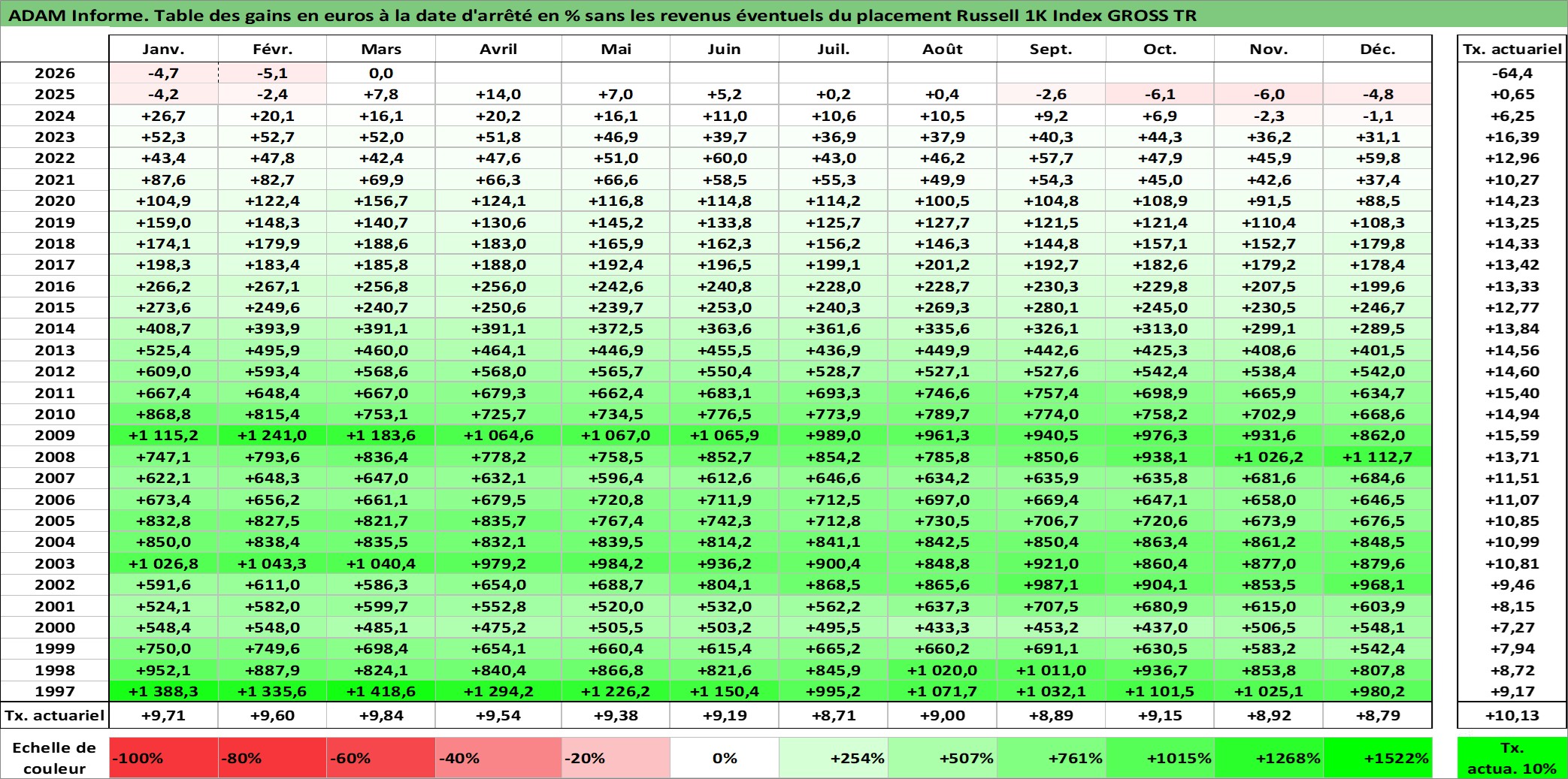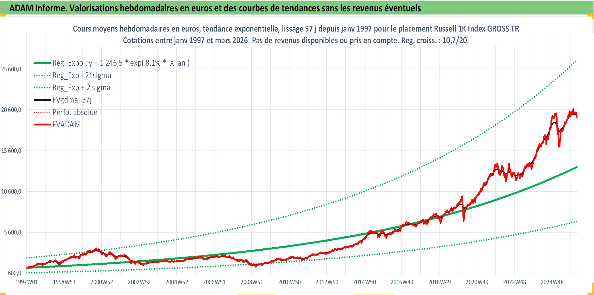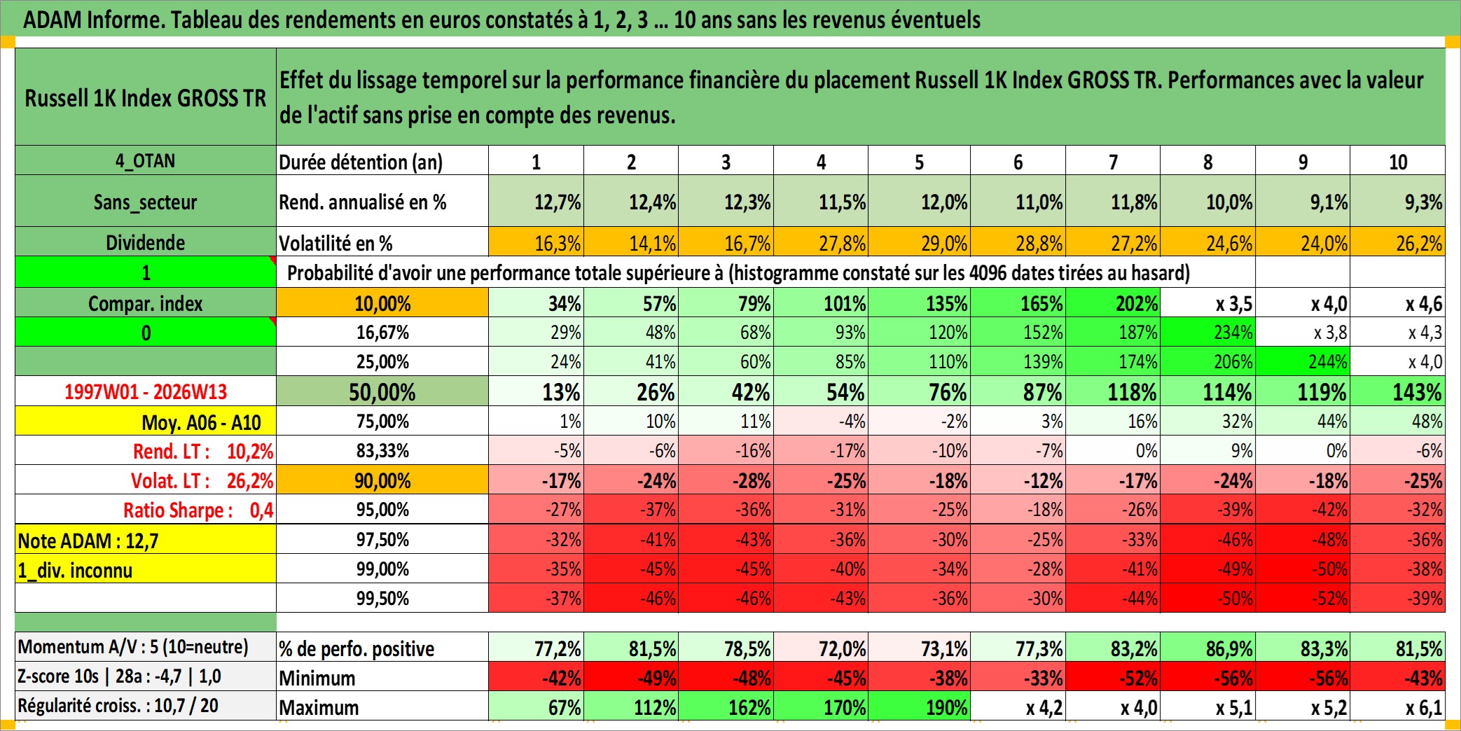 Site dédié aux investisseursPage dédiée sur site financeAnalyse des valorisations hebdomadaires de l'actif Russell 1K Index GROSS TR. Cet actif est cote en USD. Les valorisations sont en contrevaleur EURO et couvrent les semaines 1997W01 a 2026W13. Les revenus de cet actif financier ne sont pas connus car non existants ou non disponibles sur le site Yahoo Finance. La note ESG de cet actif n'est pas connue.