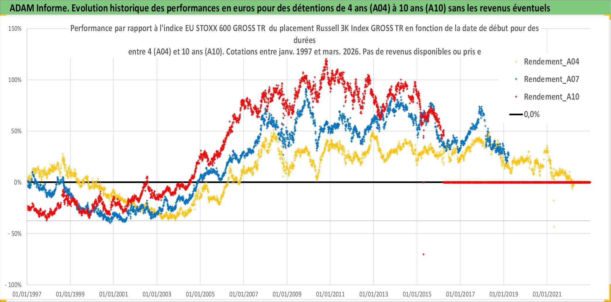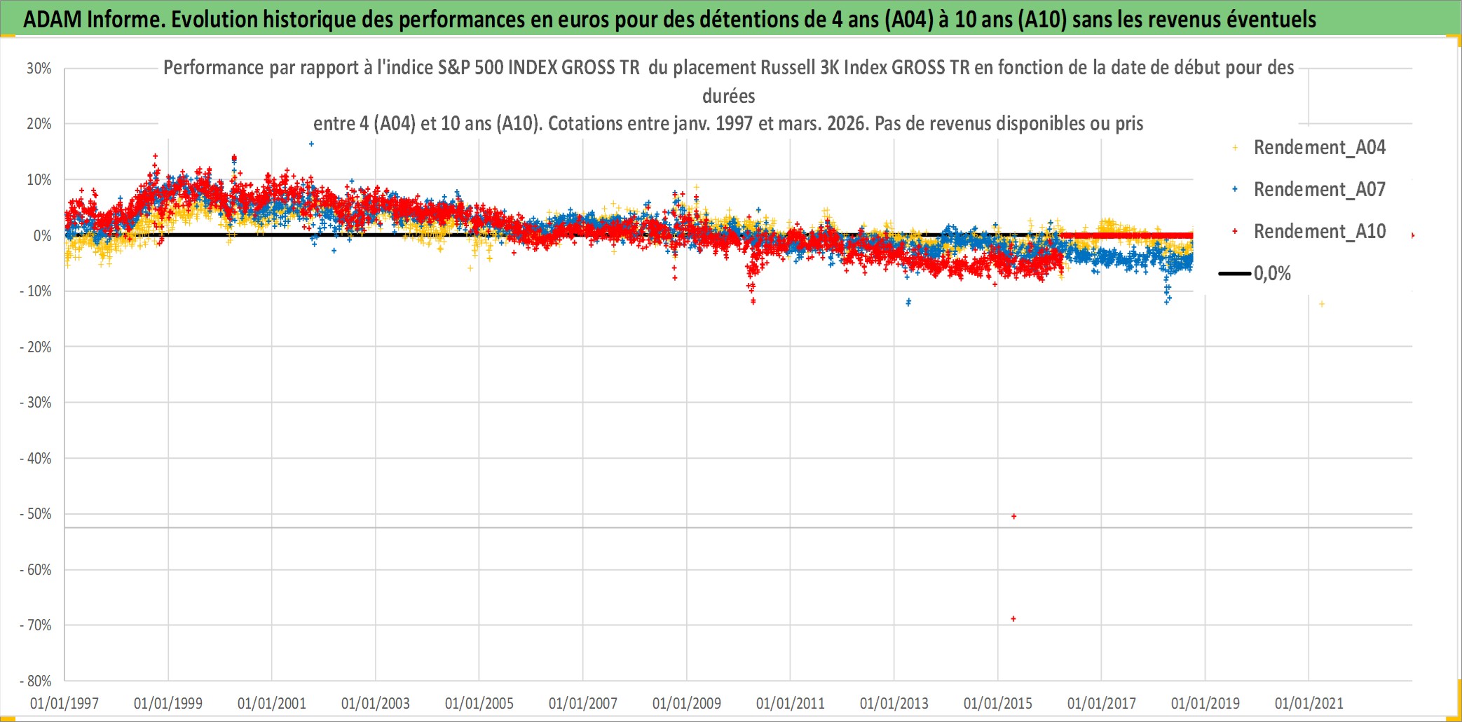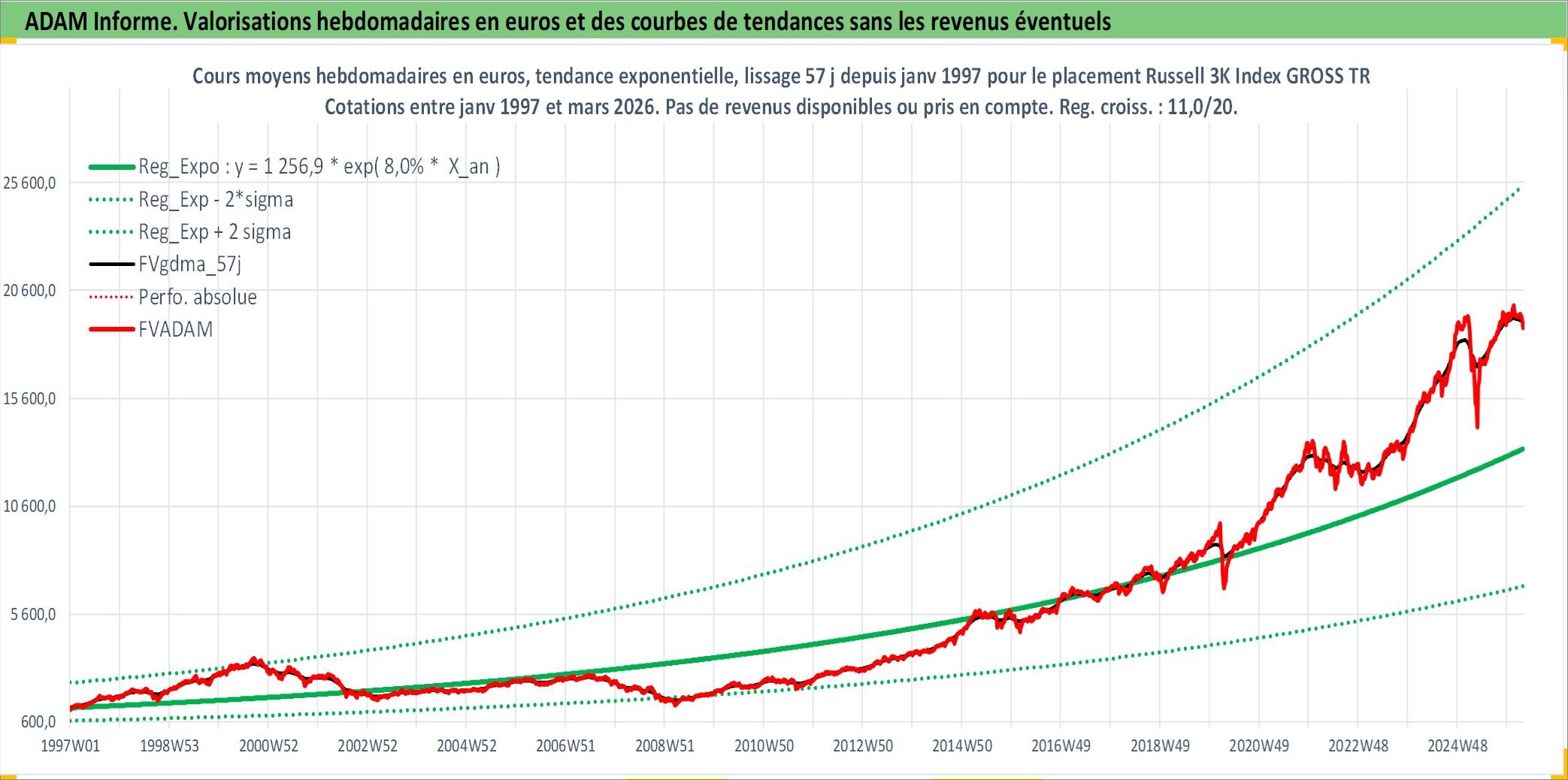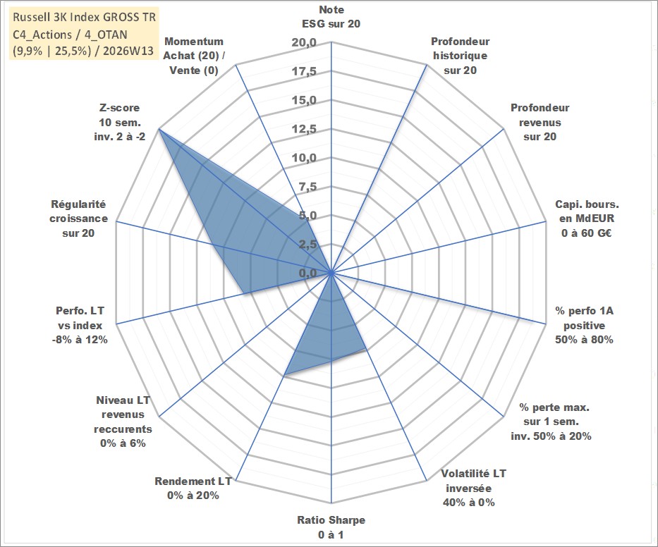 Site dédié aux investisseursPage dédiée sur site financeAnalyse des valorisations hebdomadaires de l'actif Russell 3K Index GROSS TR. Cet actif est cote en USD. Les valorisations sont en contrevaleur EURO et couvrent les semaines 1997W01 a 2026W13. Les revenus de cet actif financier ne sont pas connus car non existants ou non disponibles sur le site Yahoo Finance. La note ESG de cet actif n'est pas connue.