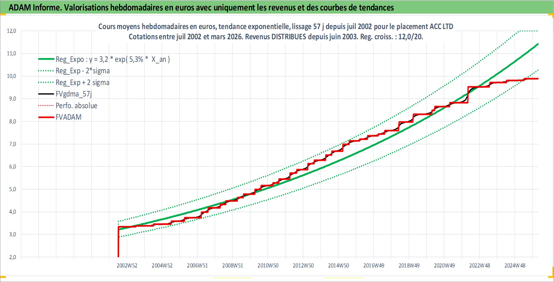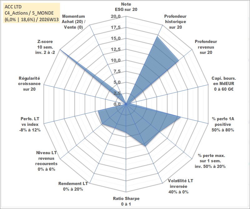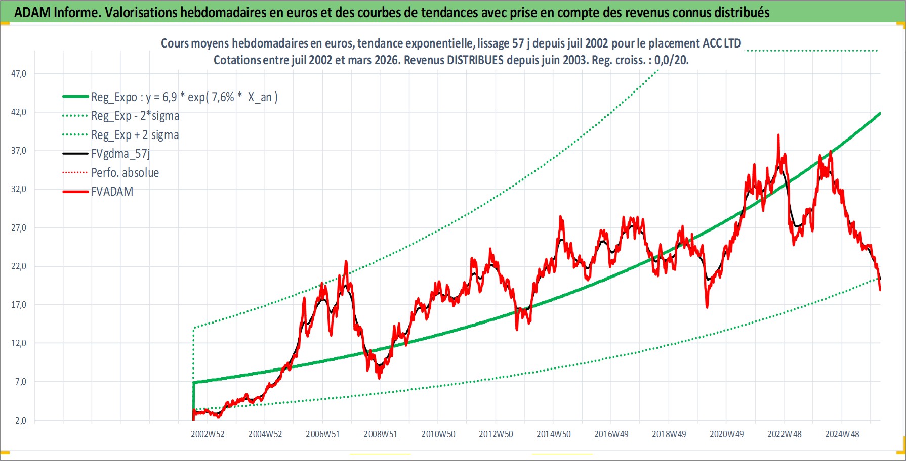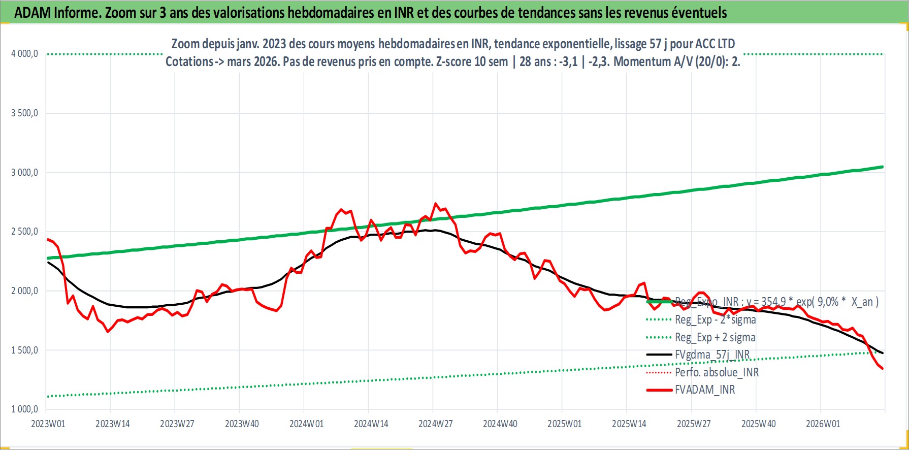 Site dédié aux investisseursPage dédiée sur site financeAnalyse des valorisations hebdomadaires de l'action ACC LTD. Cet actif est cote en INR. Les valorisations sont en contrevaleur EURO et couvrent les semaines 2002W27 a 2026W13. Les revenus de cet actif financier sont pris en compte depuis la semaine 2003W27. La note ESG de cet actif n'est pas connue.