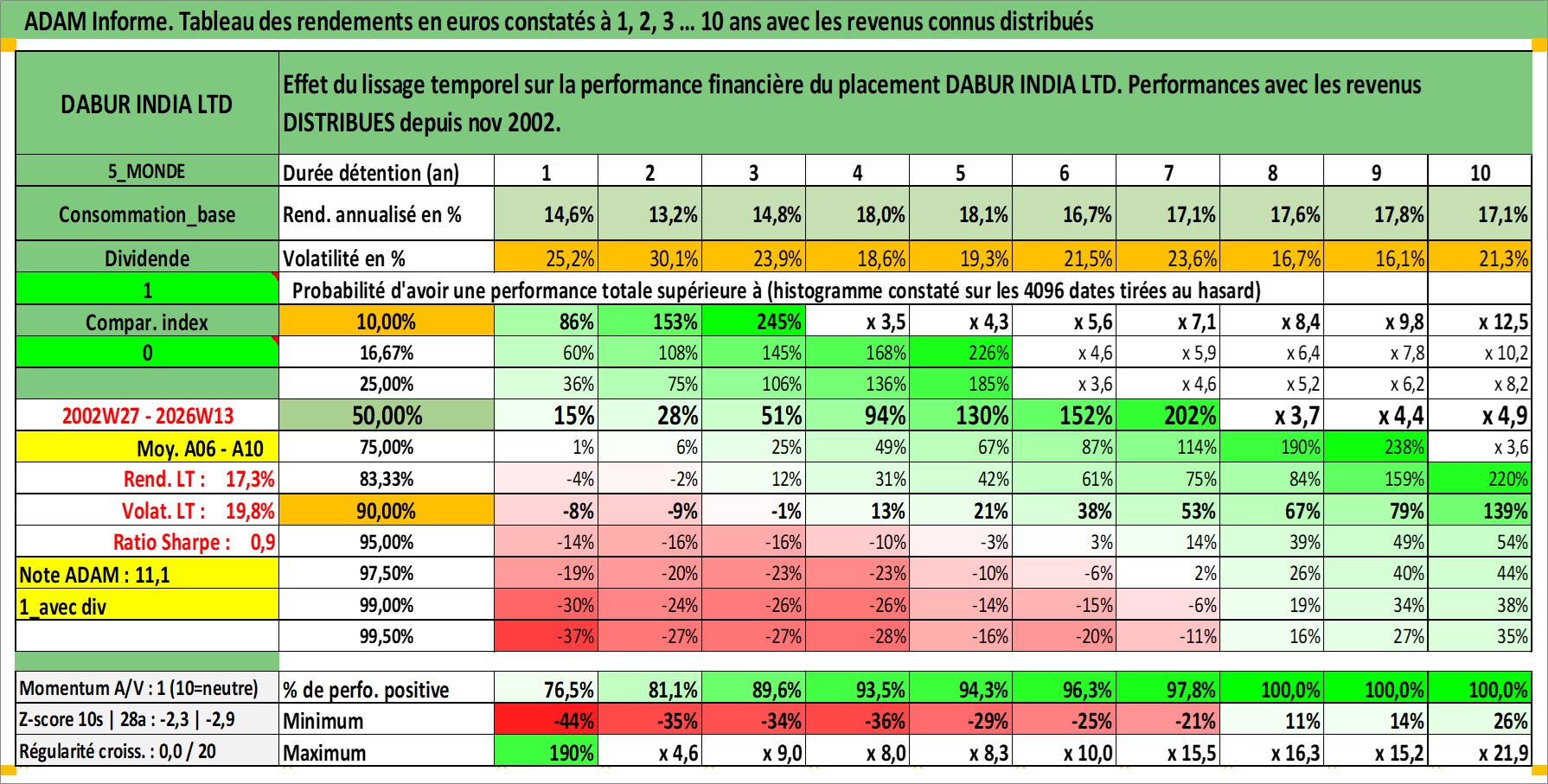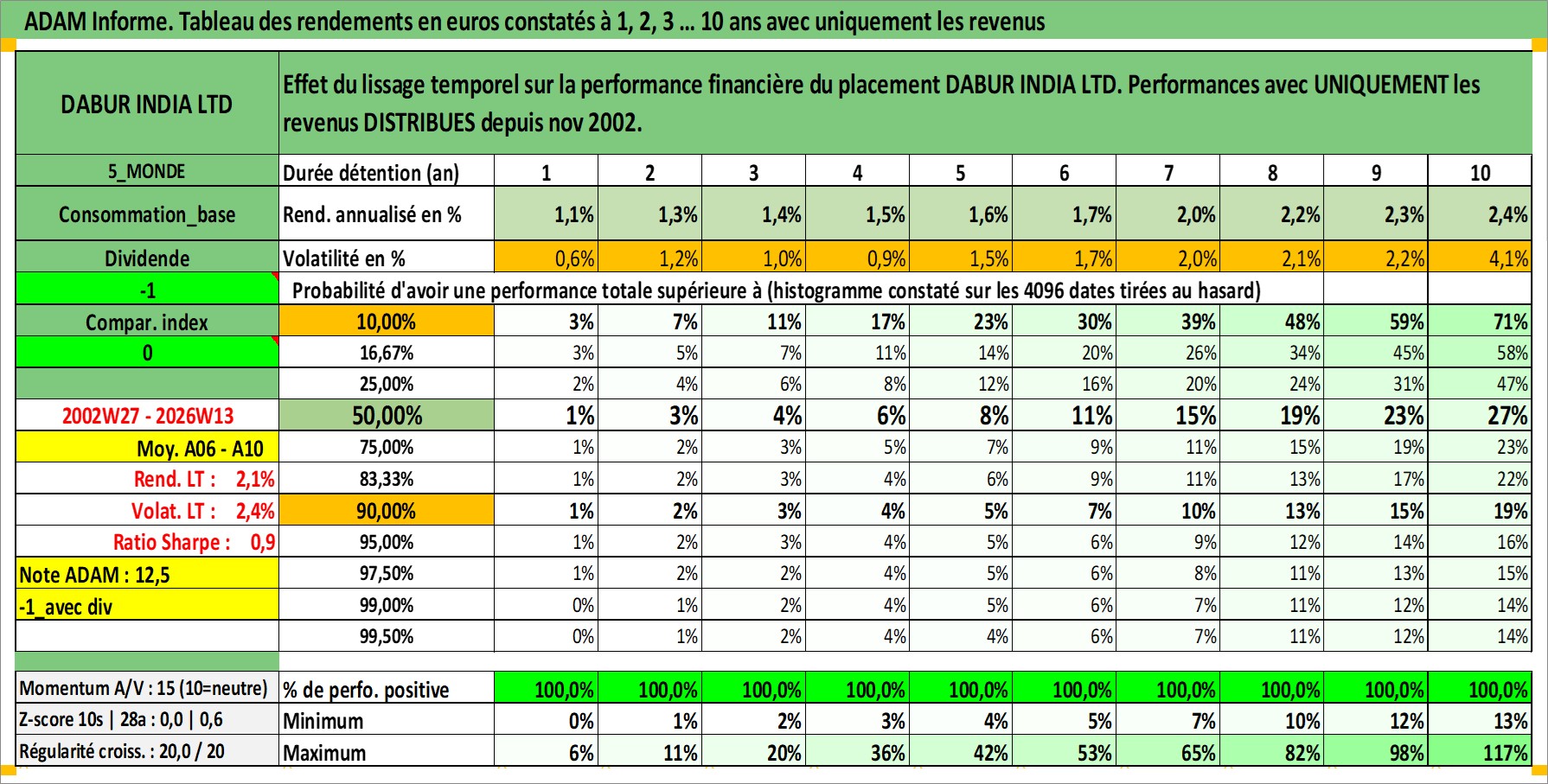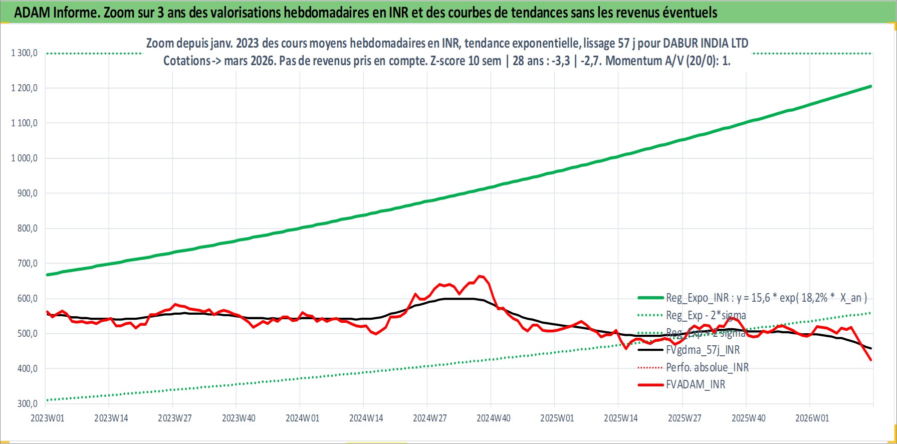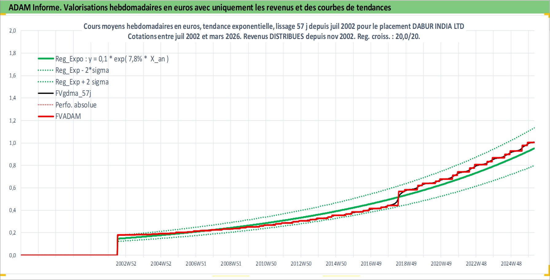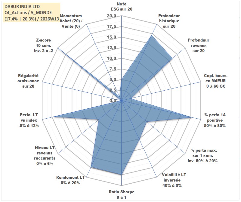 Site dédié aux investisseursPage dédiée sur site financeAnalyse des valorisations hebdomadaires de l'action DABUR INDIA LTD. Cet actif est cote en INR. Les valorisations sont en contrevaleur EURO et couvrent les semaines 2002W27 a 2026W13. Les revenus de cet actif financier sont pris en compte depuis la semaine 2002W46. La note globale ESG de cet actif est estimee a 5.0 (apres rebasage entre 0 et 20).