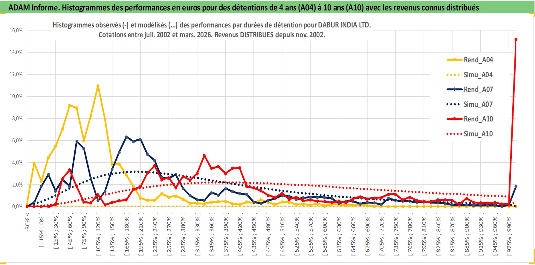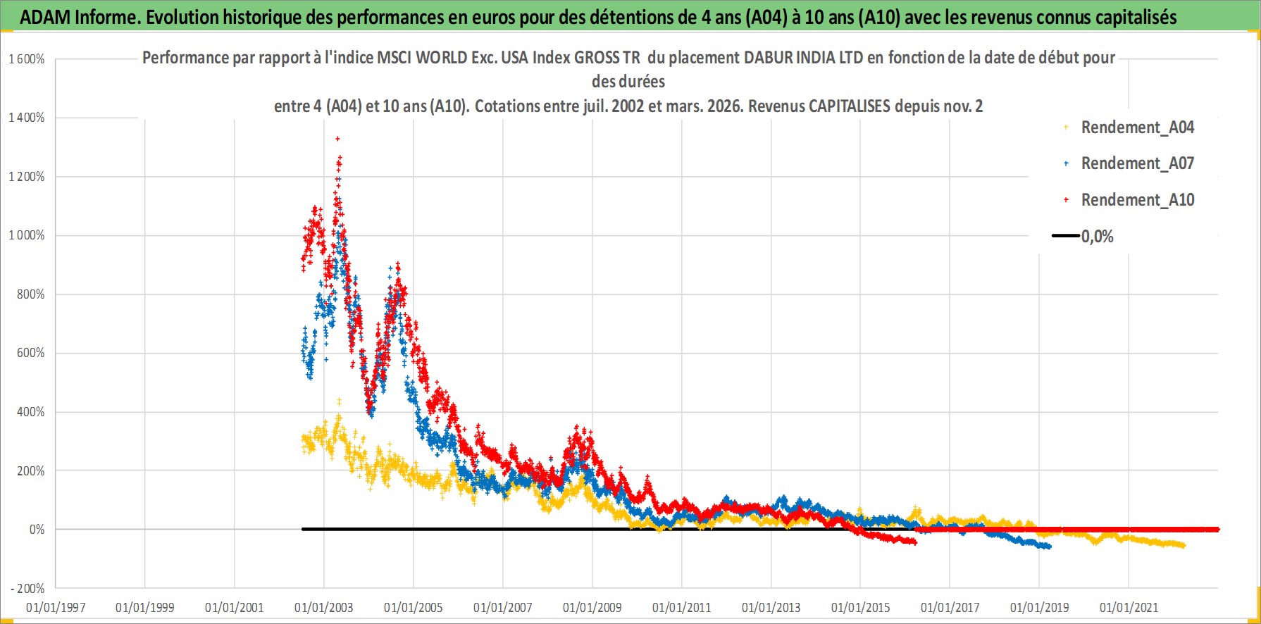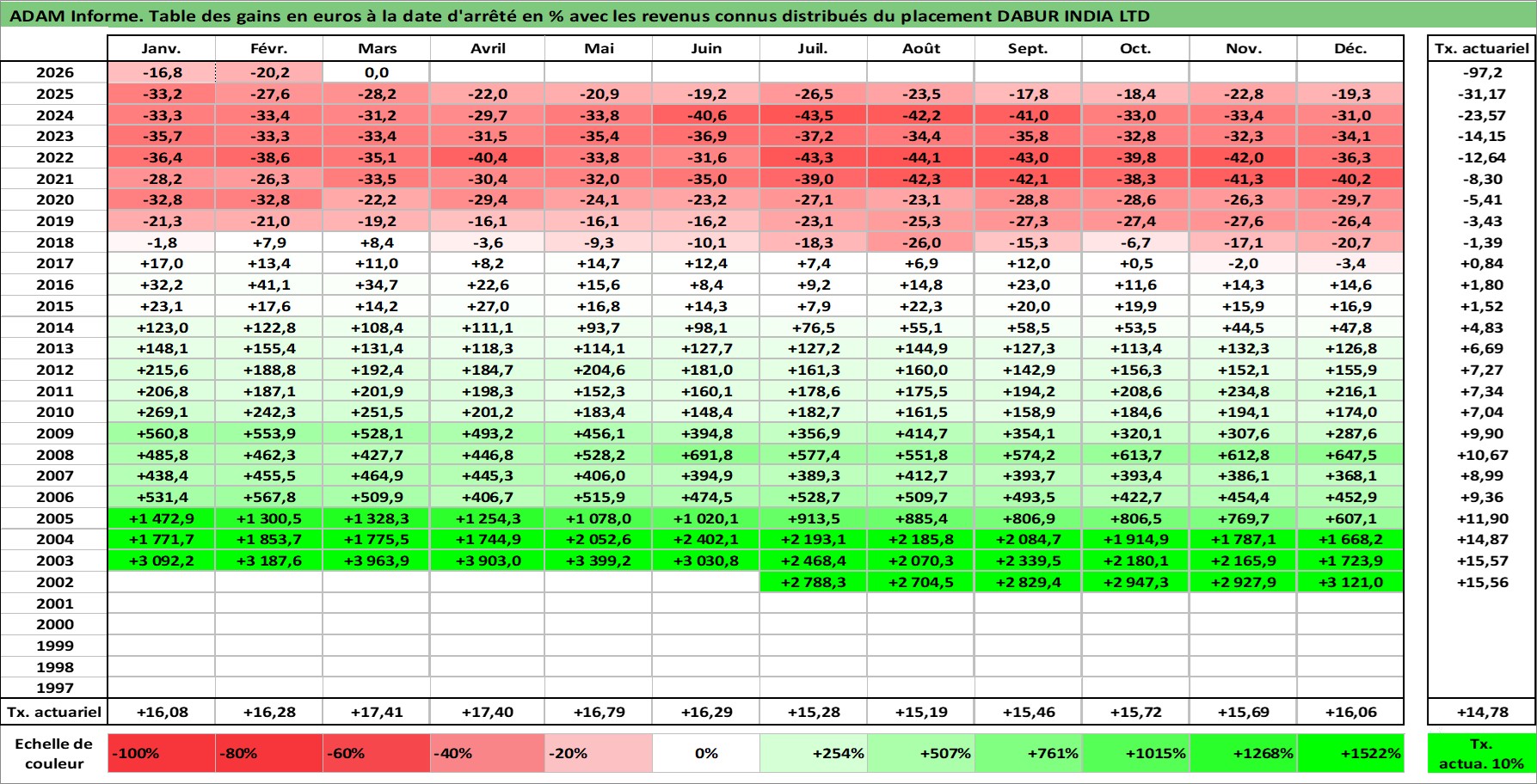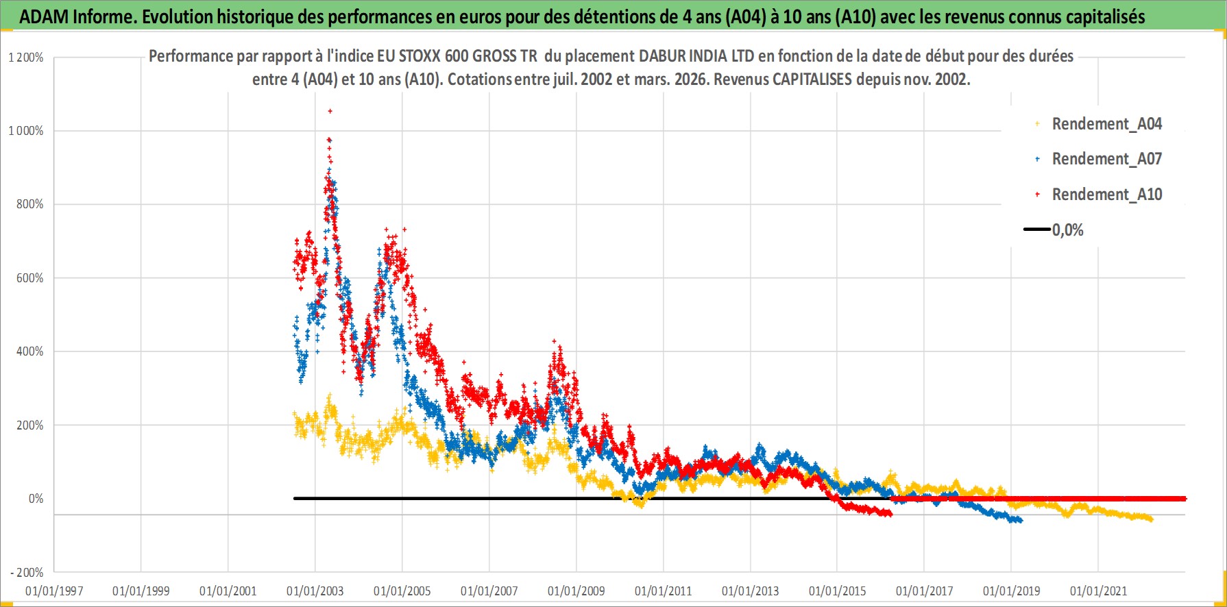Site dédié aux investisseursPage dédiée sur site financeAnalyse des valorisations hebdomadaires de l'action DABUR INDIA LTD. Cet actif est cote en INR. Les valorisations sont en contrevaleur EURO et couvrent les semaines 2002W27 a 2026W13. Les revenus de cet actif financier sont pris en compte depuis la semaine 2002W46. La note globale ESG de cet actif est estimee a 5.0 (apres rebasage entre 0 et 20).
