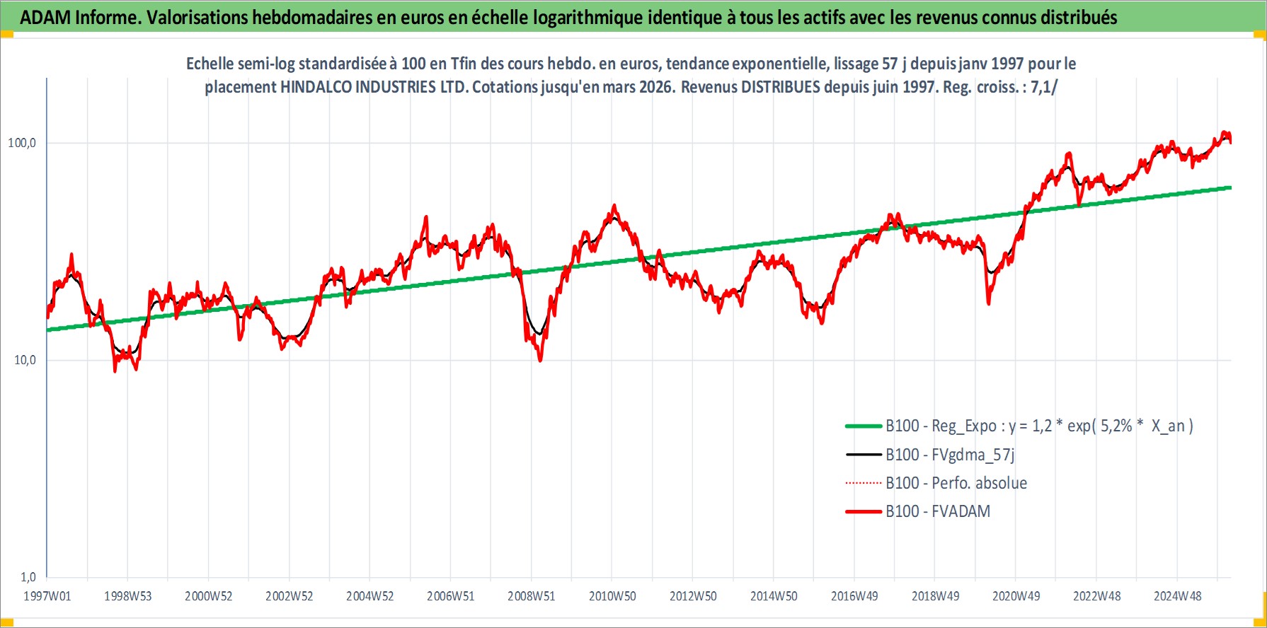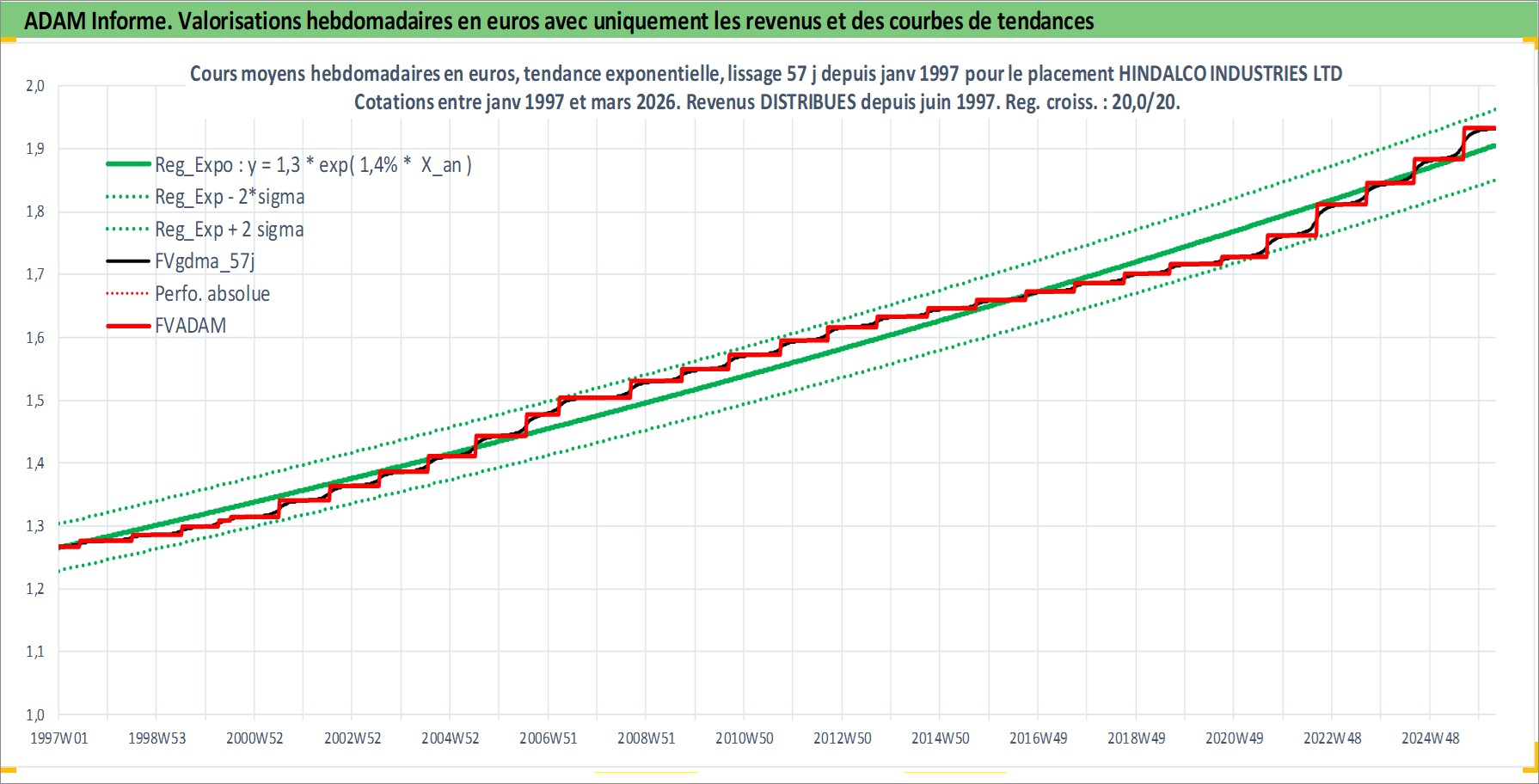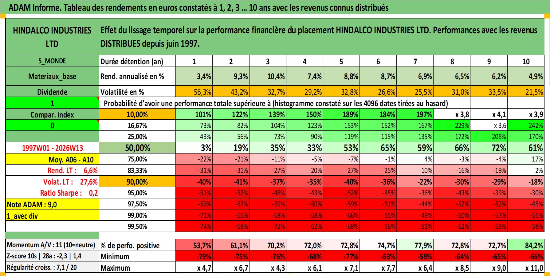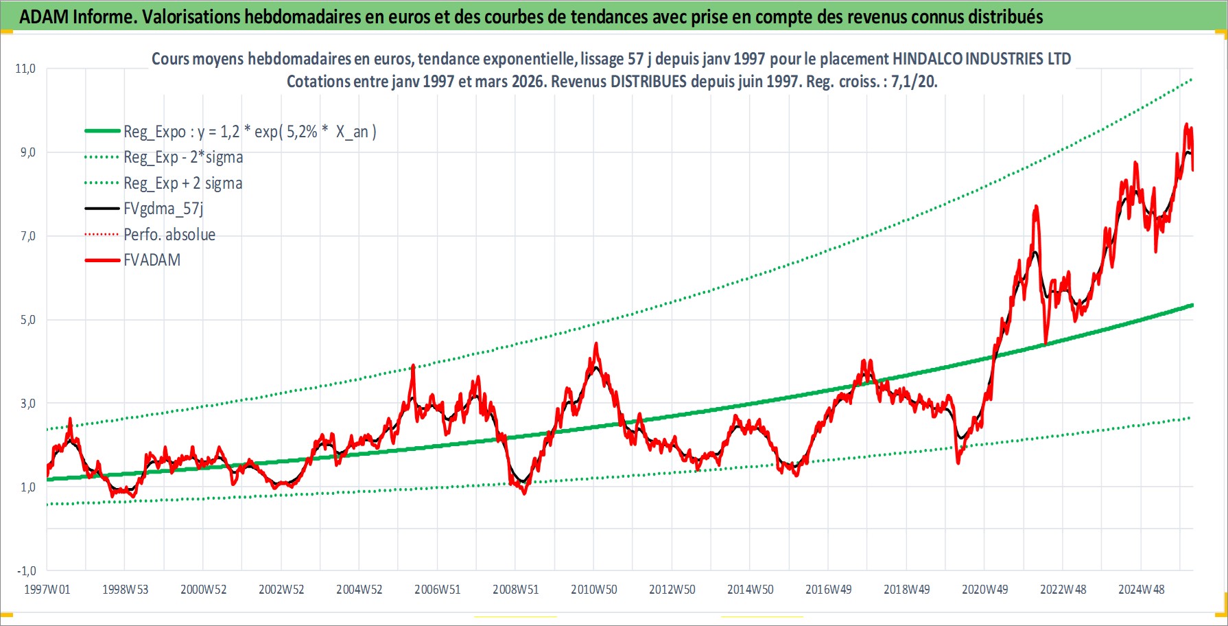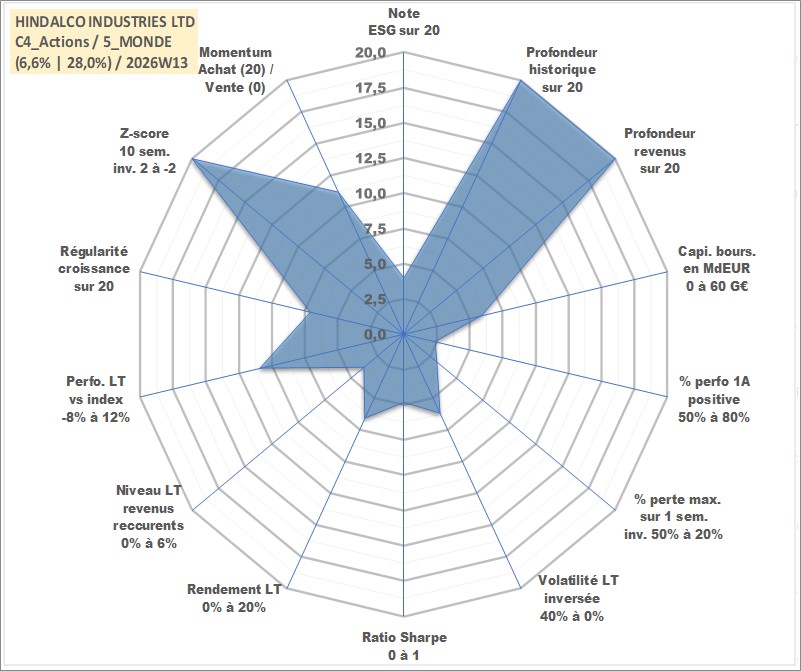 Site dédié aux investisseursPage dédiée sur site financeAnalyse des valorisations hebdomadaires de l'action HINDALCO INDUSTRIES LTD. Cet actif est cote en INR. Les valorisations sont en contrevaleur EURO et couvrent les semaines 1997W01 a 2026W13. Les revenus de cet actif financier sont pris en compte depuis la semaine 1997W24. La note globale ESG de cet actif est estimee a 4.0 (apres rebasage entre 0 et 20).