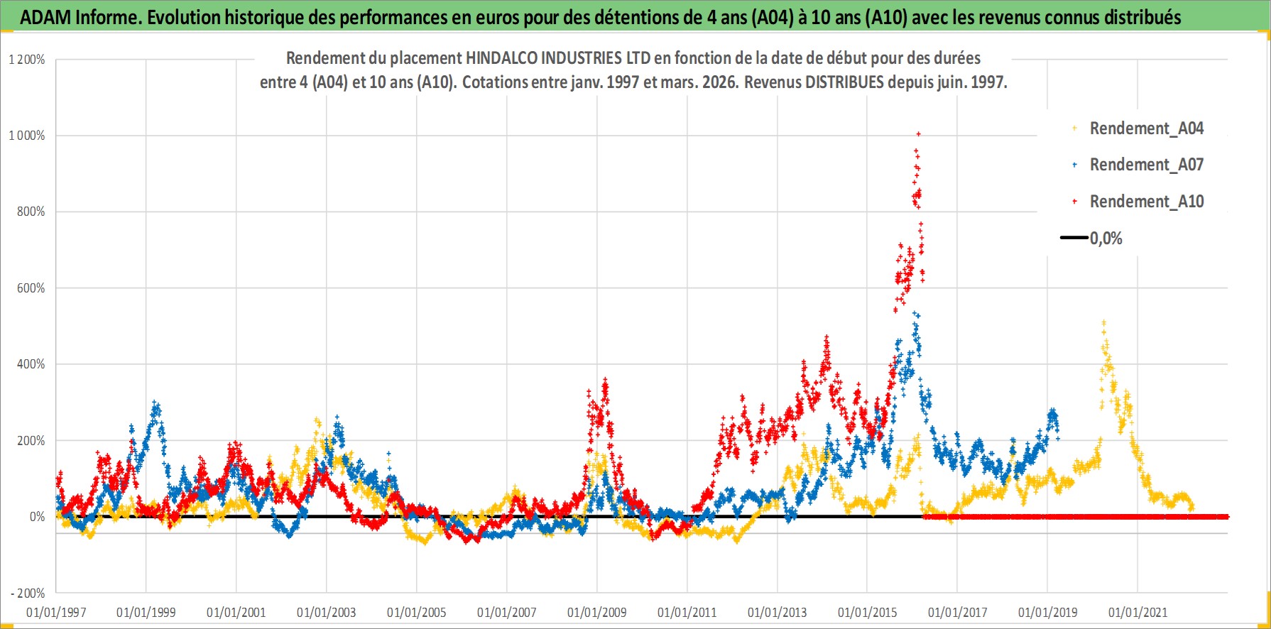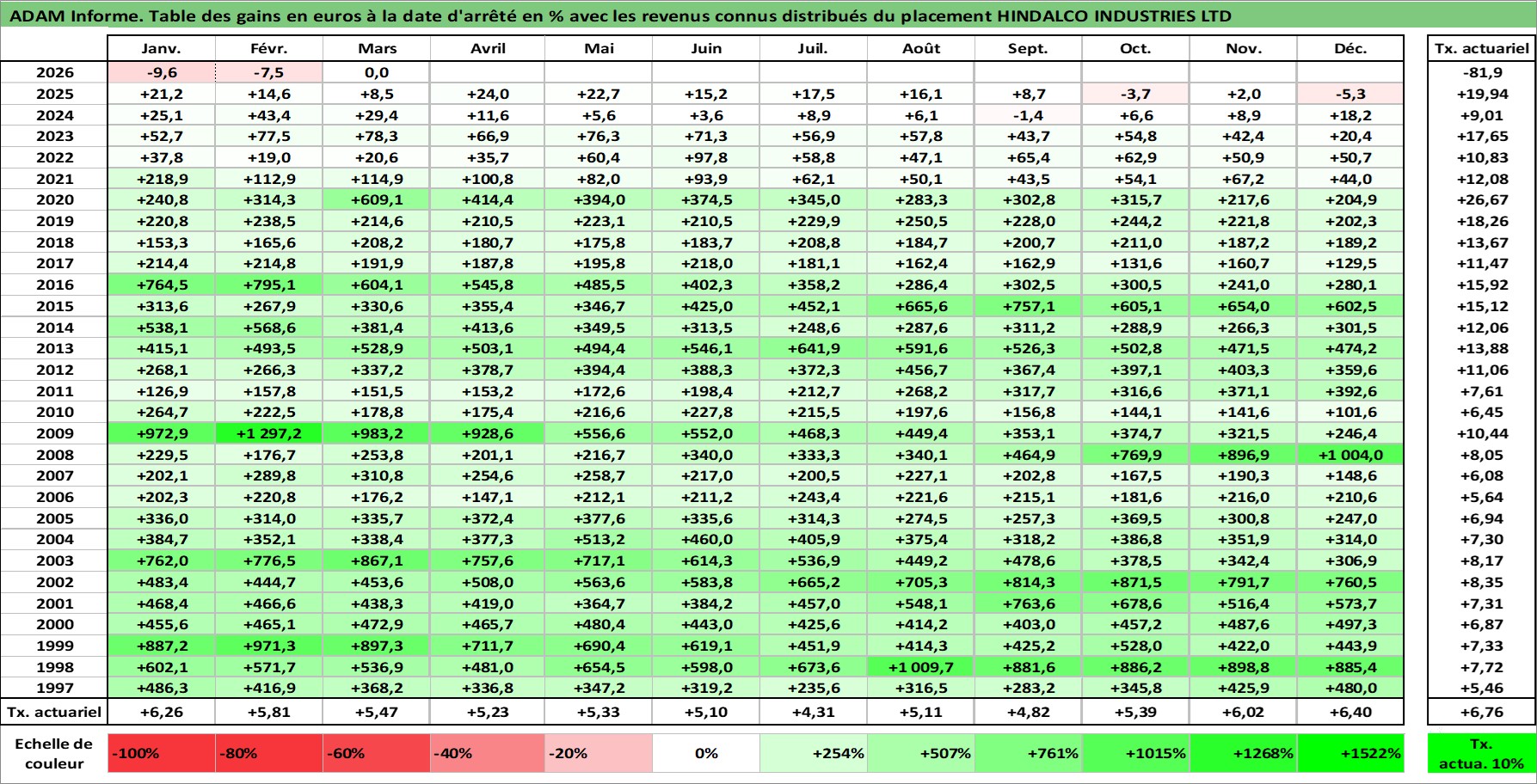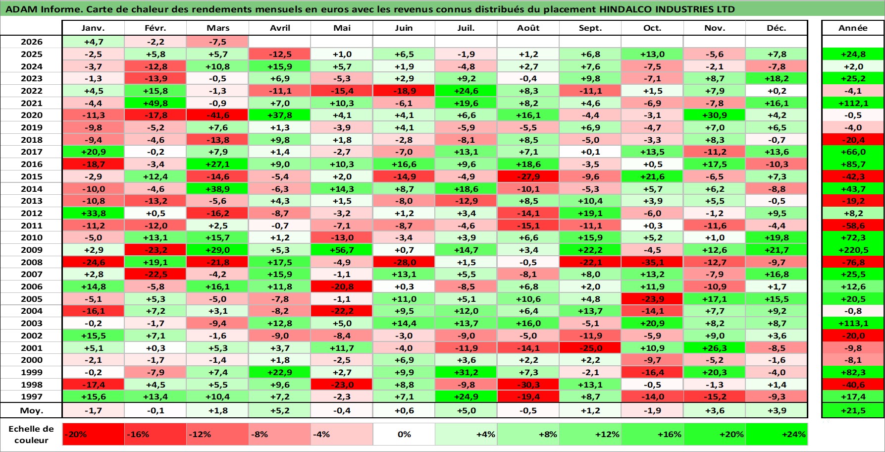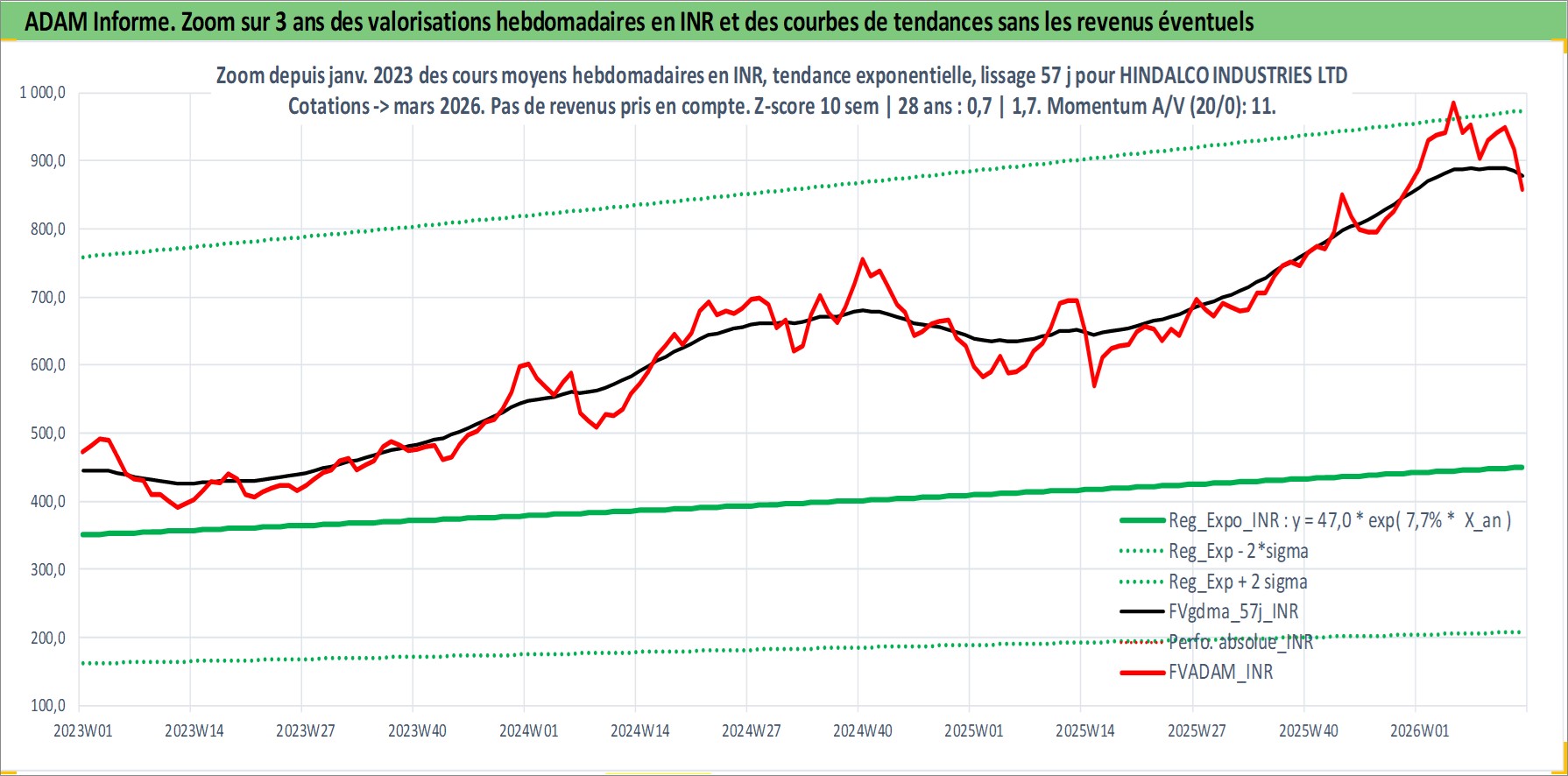 Site dédié aux investisseursPage dédiée sur site financeAnalyse des valorisations hebdomadaires de l'action HINDALCO INDUSTRIES LTD. Cet actif est cote en INR. Les valorisations sont en contrevaleur EURO et couvrent les semaines 1997W01 a 2026W13. Les revenus de cet actif financier sont pris en compte depuis la semaine 1997W24. La note globale ESG de cet actif est estimee a 4.0 (apres rebasage entre 0 et 20).