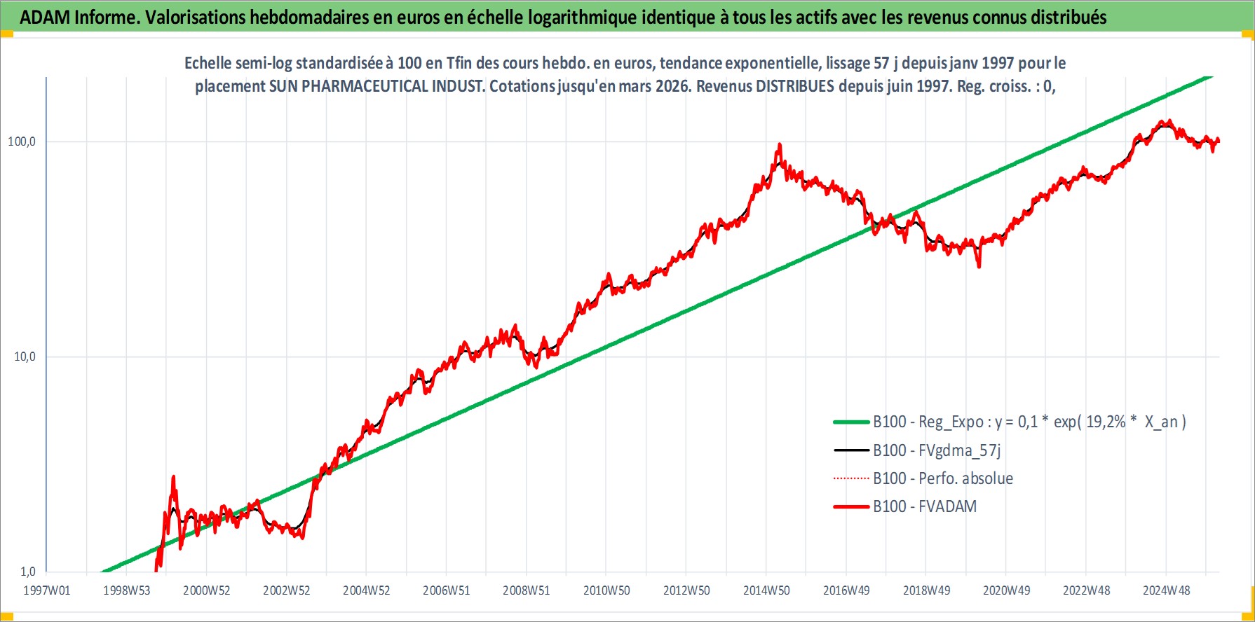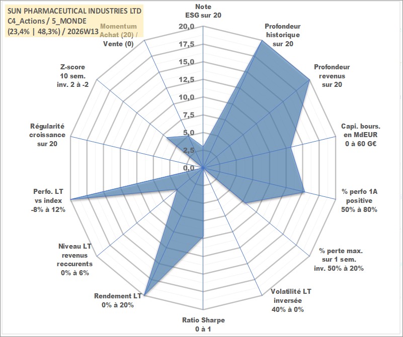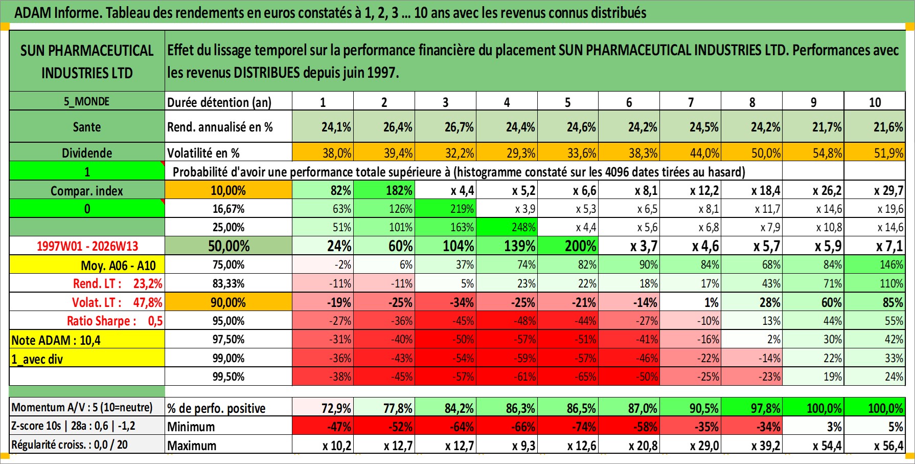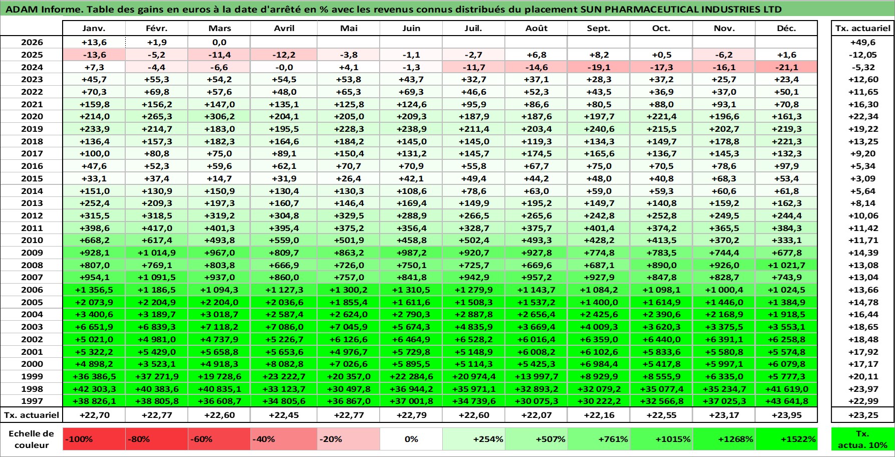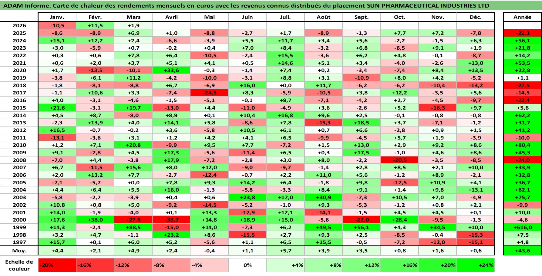 Site dédié aux investisseursPage dédiée sur site financeAnalyse des valorisations hebdomadaires de l'action SUN PHARMACEUTICAL INDUSTRIES LTD. Cet actif est cote en INR. Les valorisations sont en contrevaleur EURO et couvrent les semaines 1997W01 a 2026W13. Les revenus de cet actif financier sont pris en compte depuis la semaine 1997W24. La note globale ESG de cet actif est estimee a 3.0 (apres rebasage entre 0 et 20).