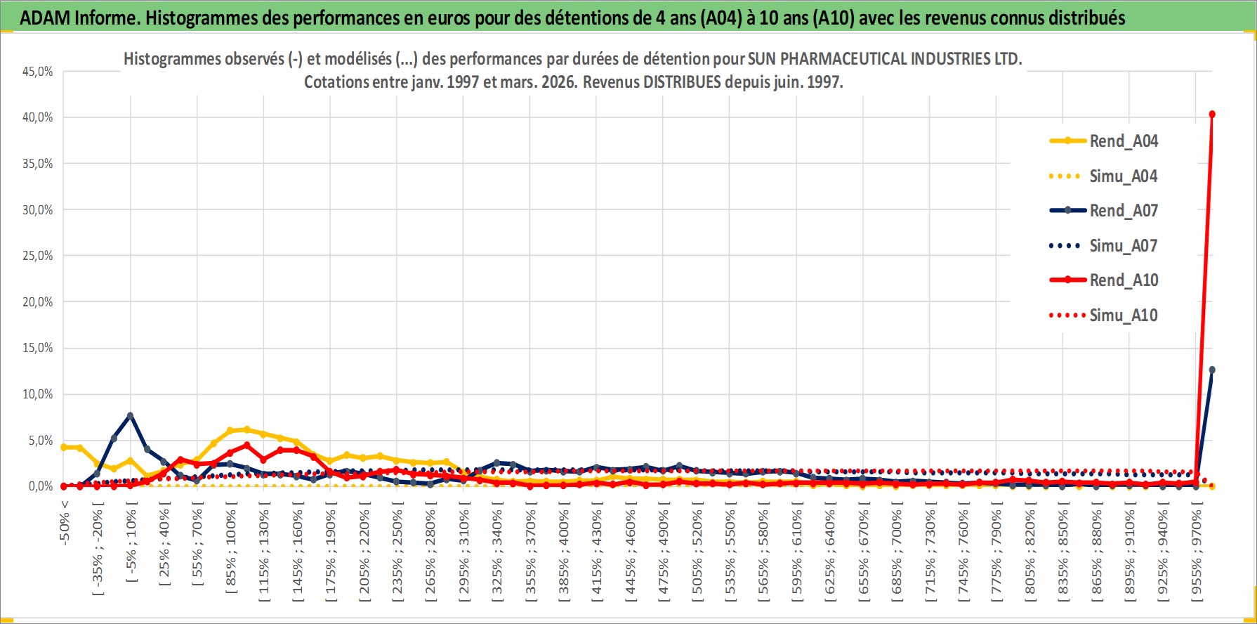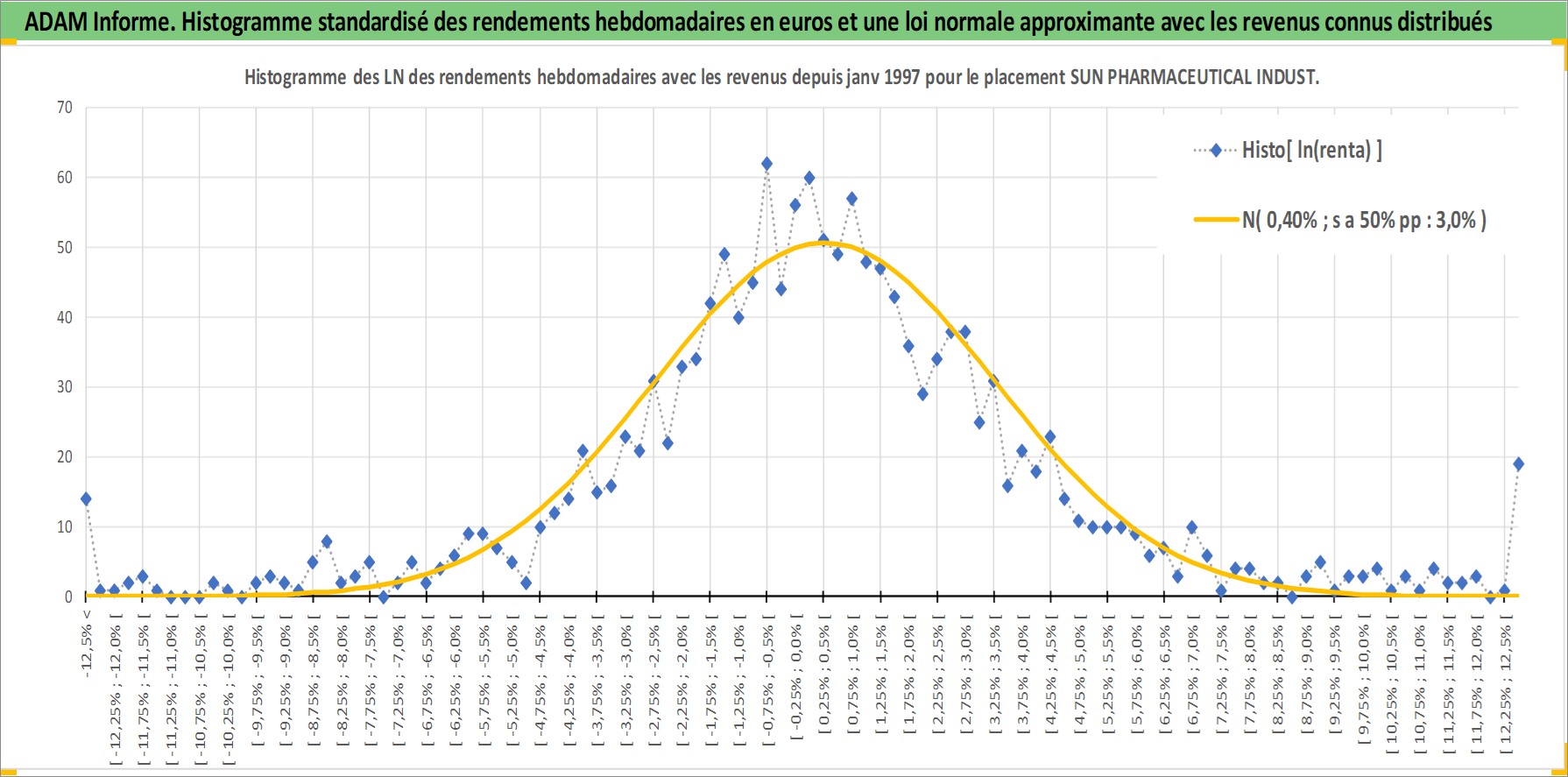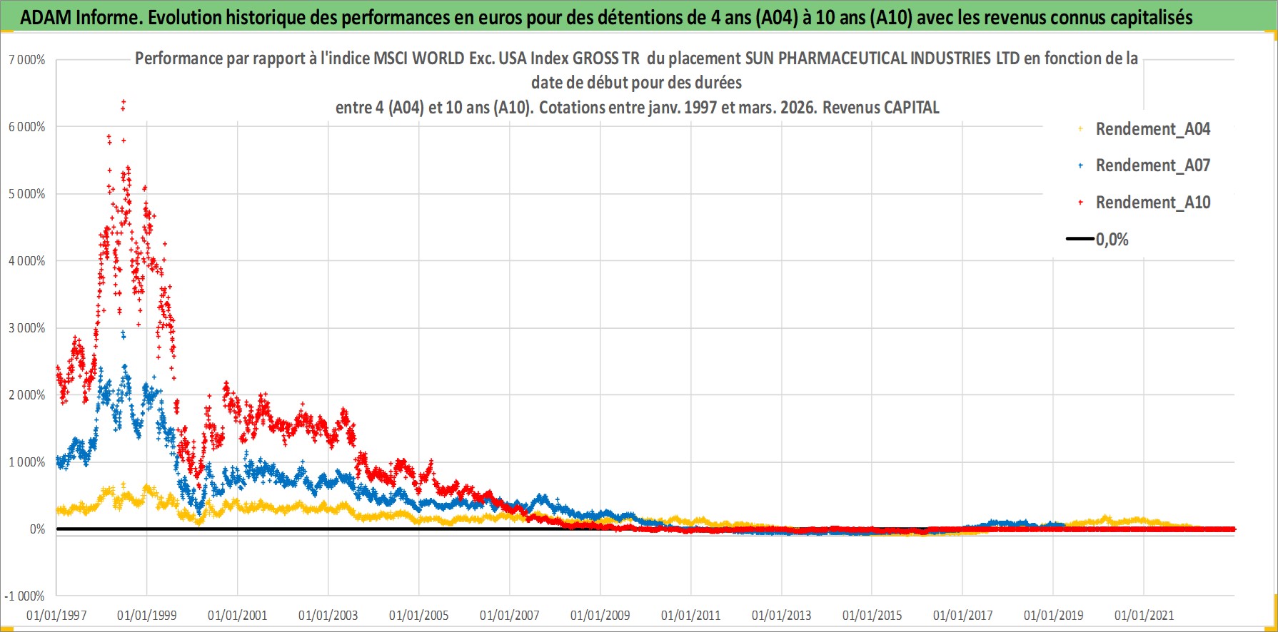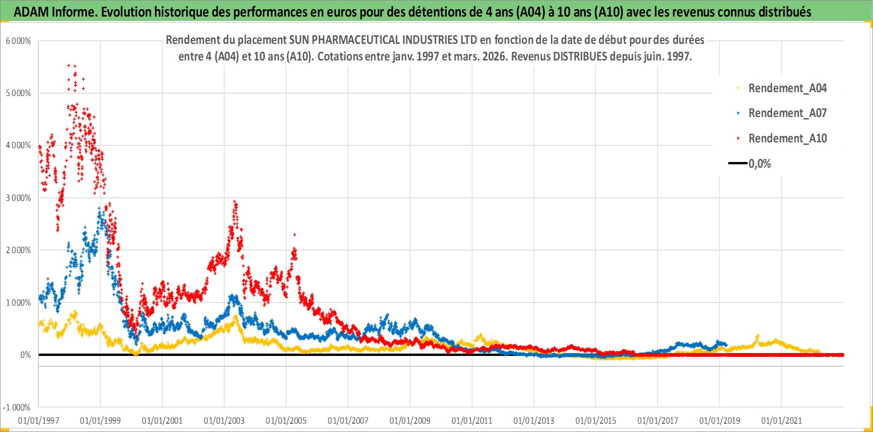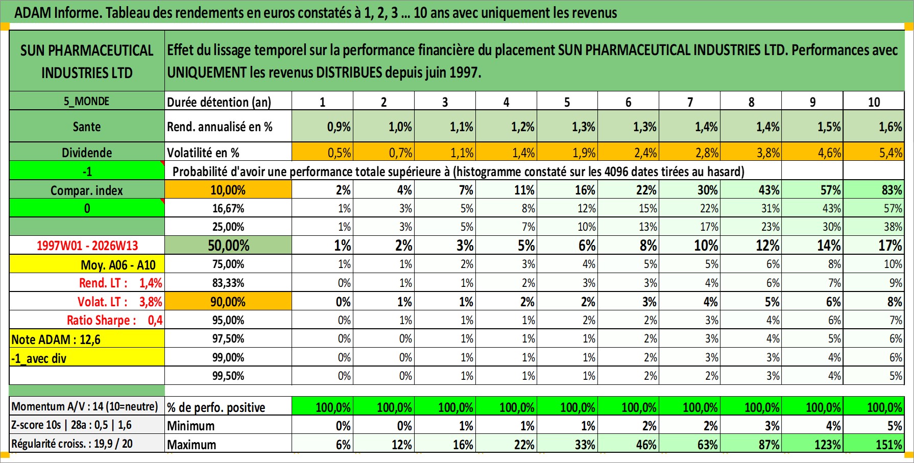 Site dédié aux investisseursPage dédiée sur site financeAnalyse des valorisations hebdomadaires de l'action SUN PHARMACEUTICAL INDUSTRIES LTD. Cet actif est cote en INR. Les valorisations sont en contrevaleur EURO et couvrent les semaines 1997W01 a 2026W13. Les revenus de cet actif financier sont pris en compte depuis la semaine 1997W24. La note globale ESG de cet actif est estimee a 3.0 (apres rebasage entre 0 et 20).