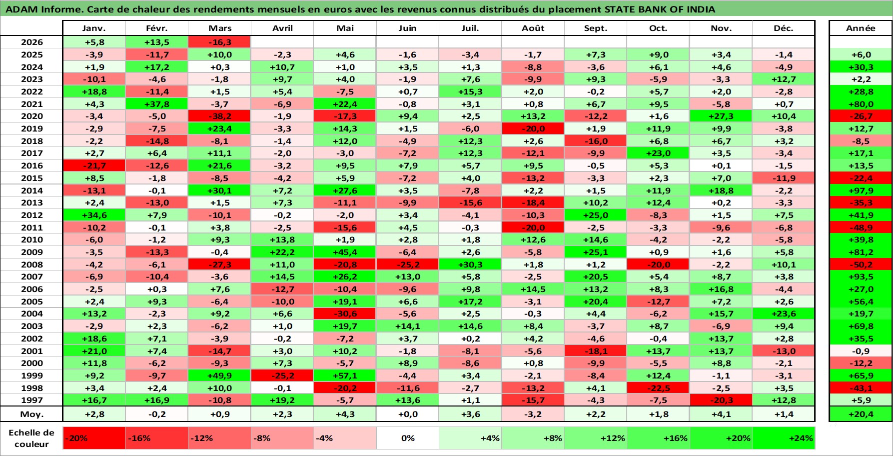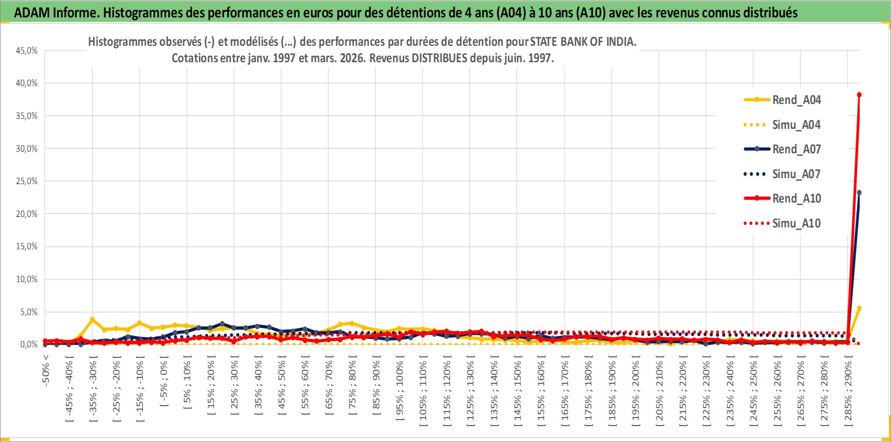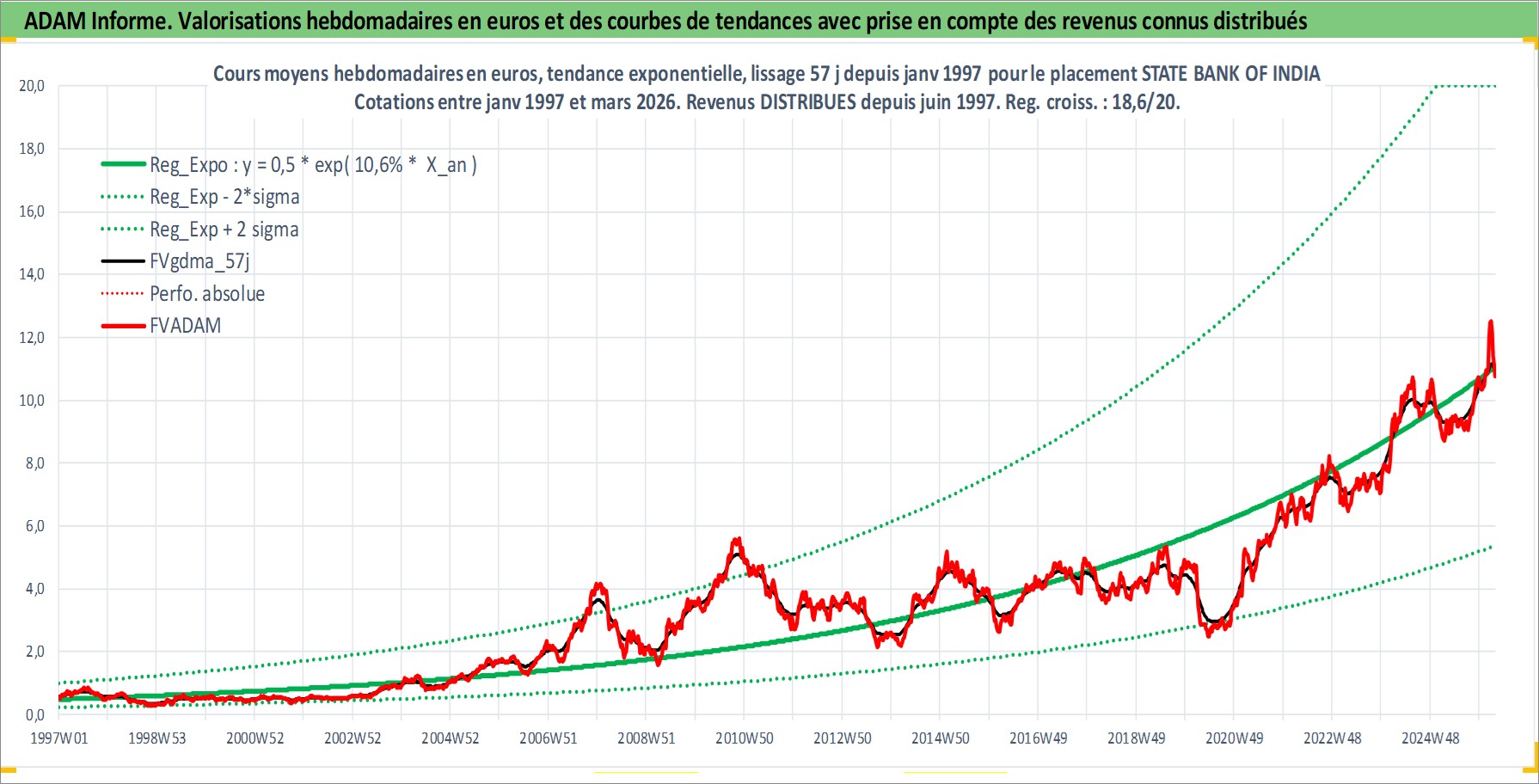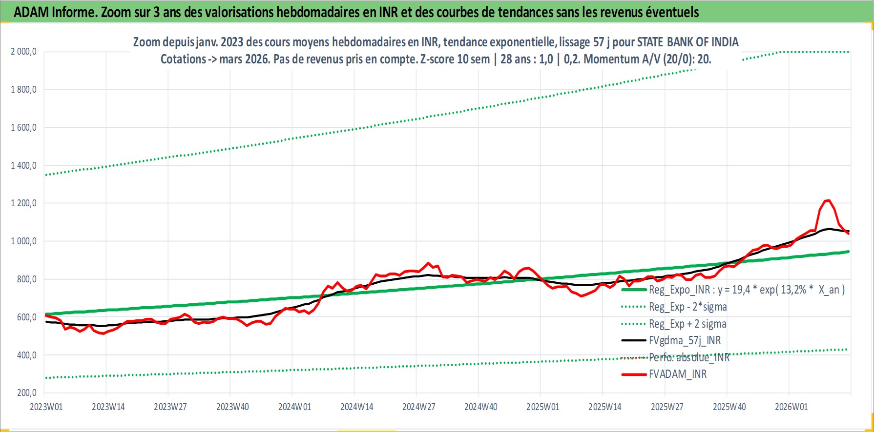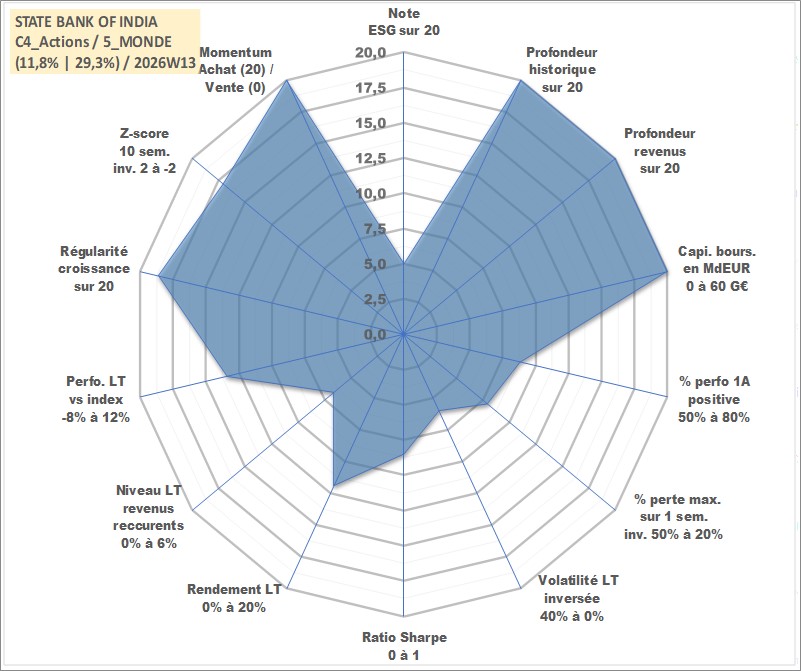 Site dédié aux investisseursPage dédiée sur site financeAnalyse des valorisations hebdomadaires de l'action STATE BANK OF INDIA. Cet actif est cote en INR. Les valorisations sont en contrevaleur EURO et couvrent les semaines 1997W01 a 2026W13. Les revenus de cet actif financier sont pris en compte depuis la semaine 1997W25. La note globale ESG de cet actif est estimee a 5.0 (apres rebasage entre 0 et 20).