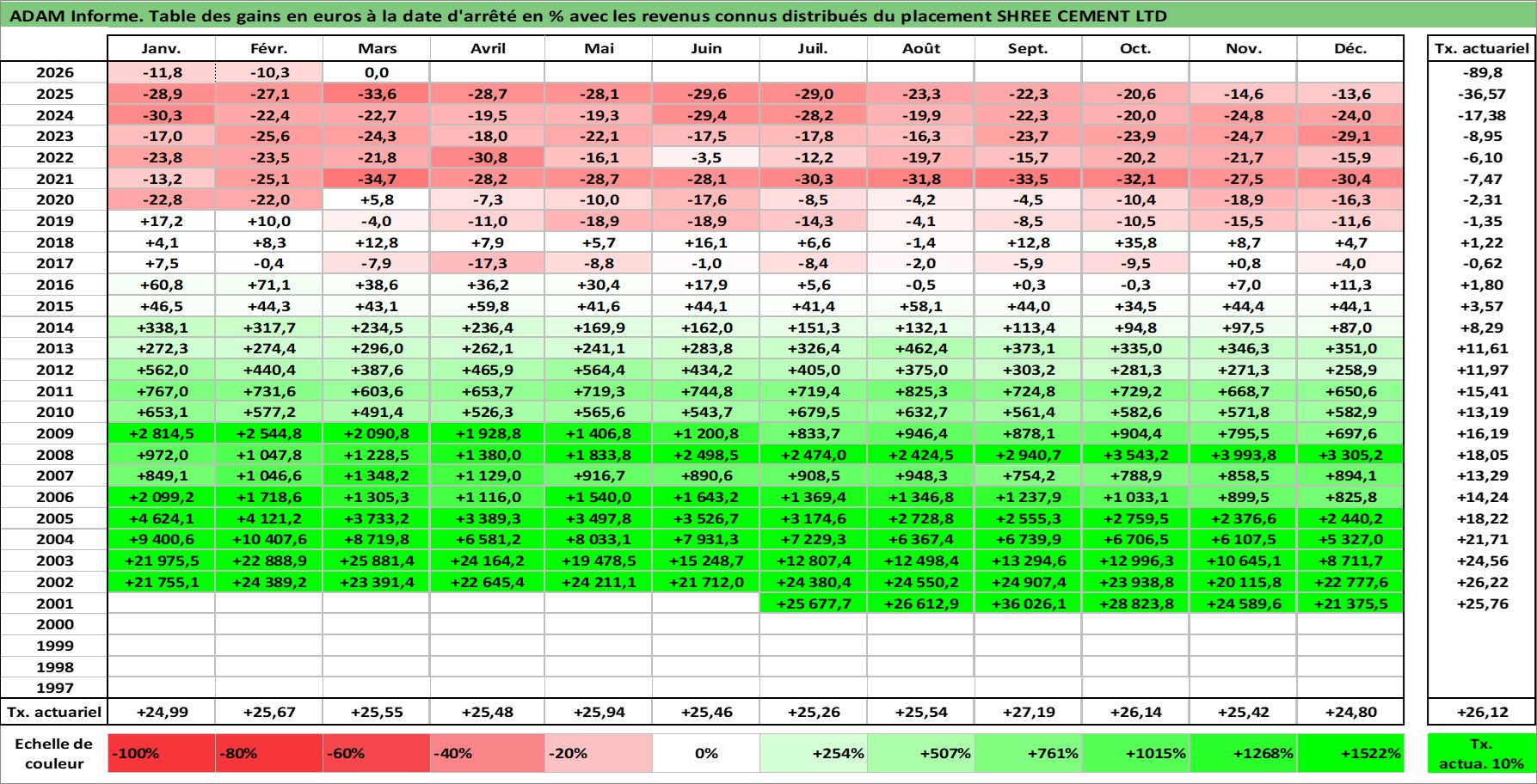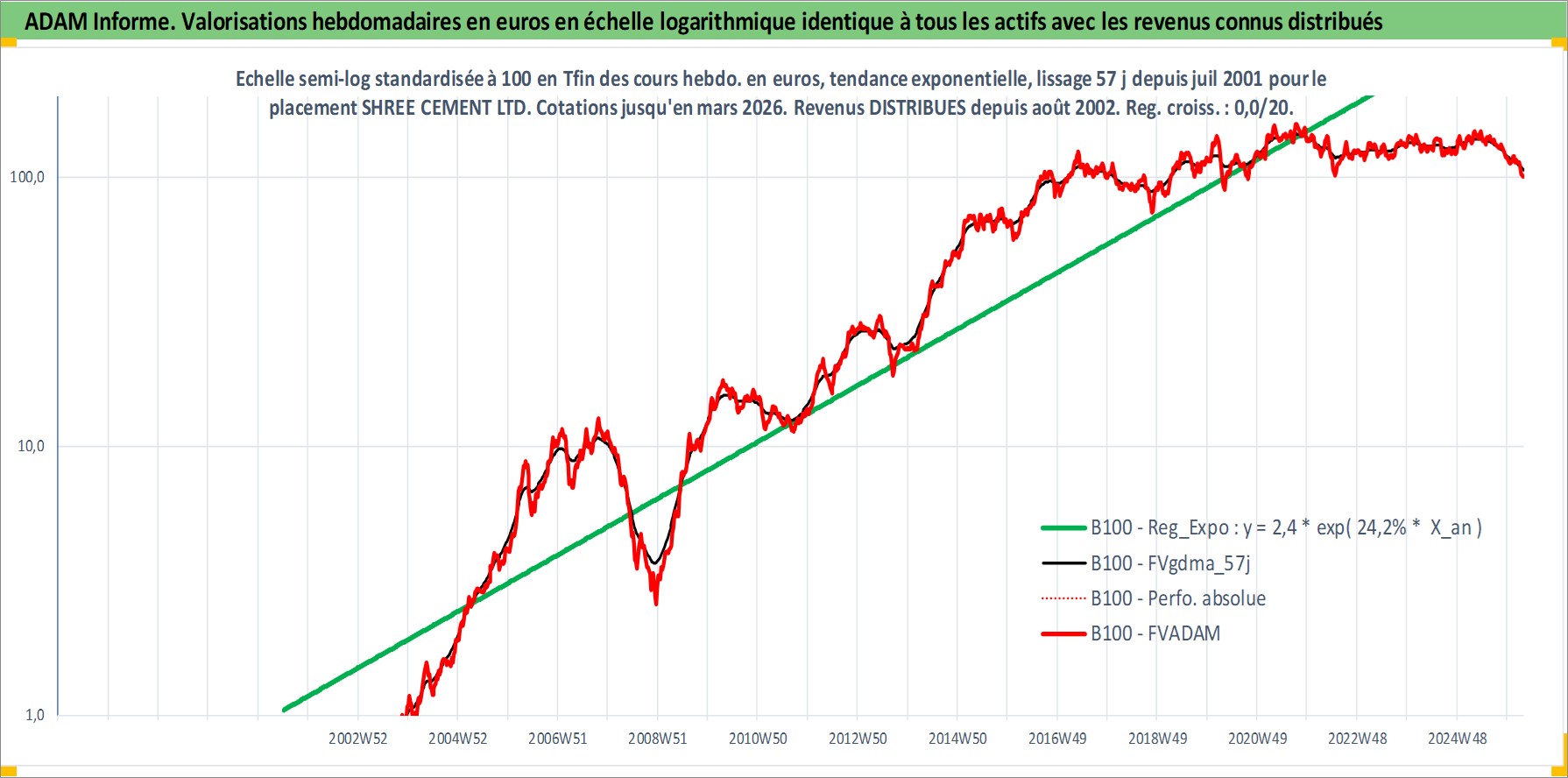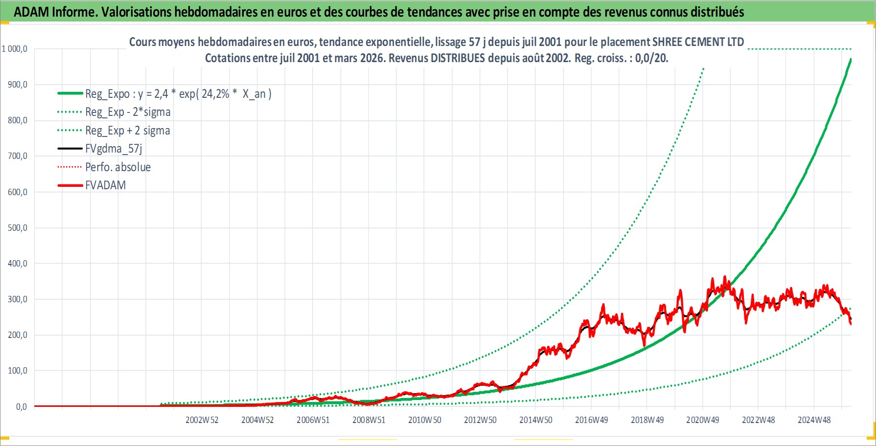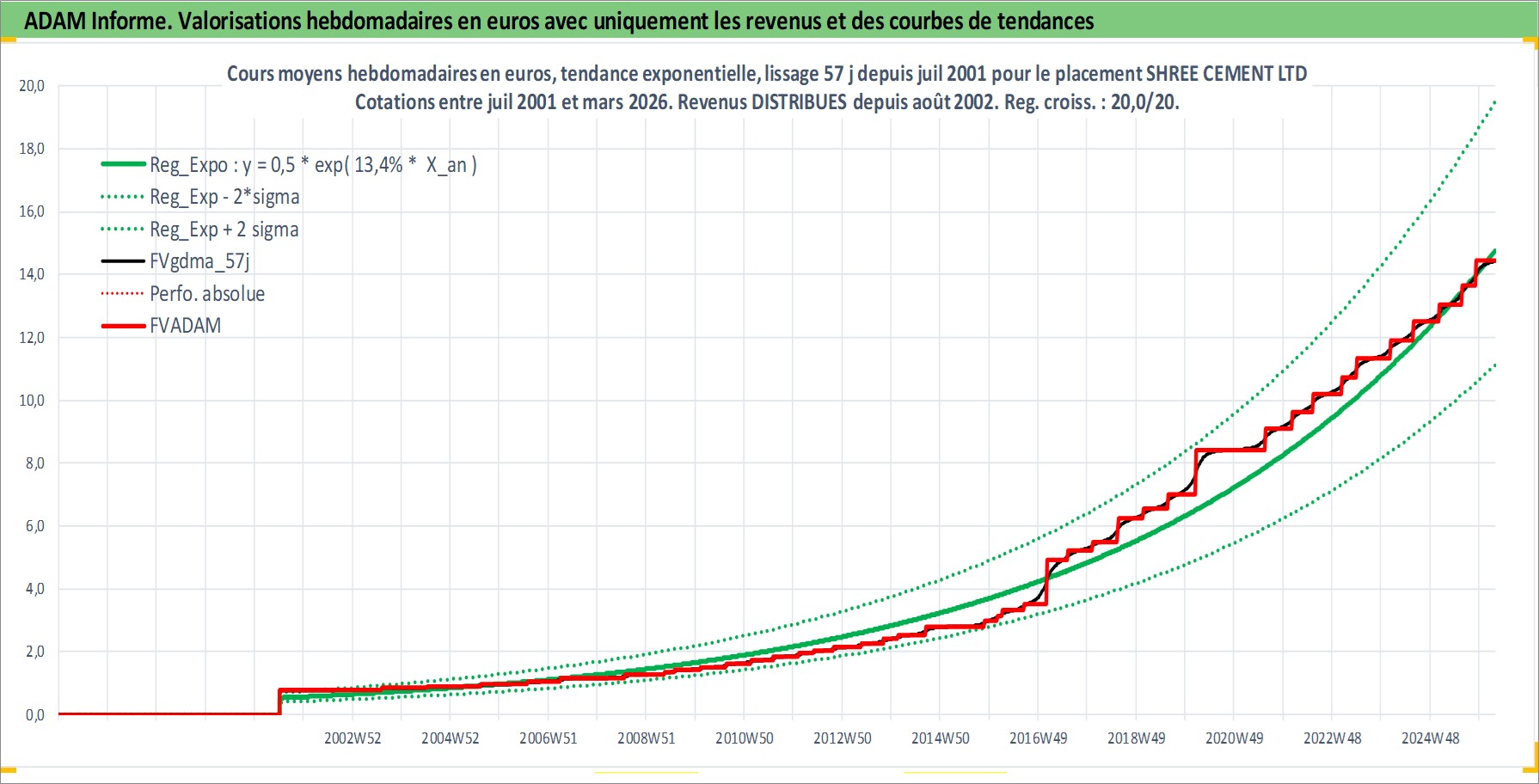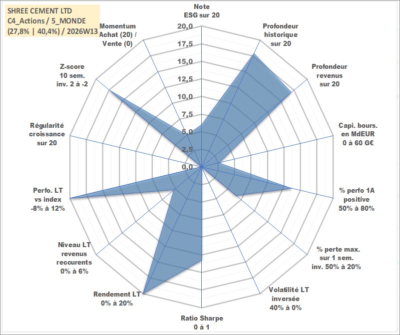 Site dédié aux investisseursPage dédiée sur site financeAnalyse des valorisations hebdomadaires de l'action SHREE CEMENT LTD. Cet actif est cote en INR. Les valorisations sont en contrevaleur EURO et couvrent les semaines 2001W27 a 2026W13. Les revenus de cet actif financier sont pris en compte depuis la semaine 2002W33. La note globale ESG de cet actif est estimee a 6.0 (apres rebasage entre 0 et 20).