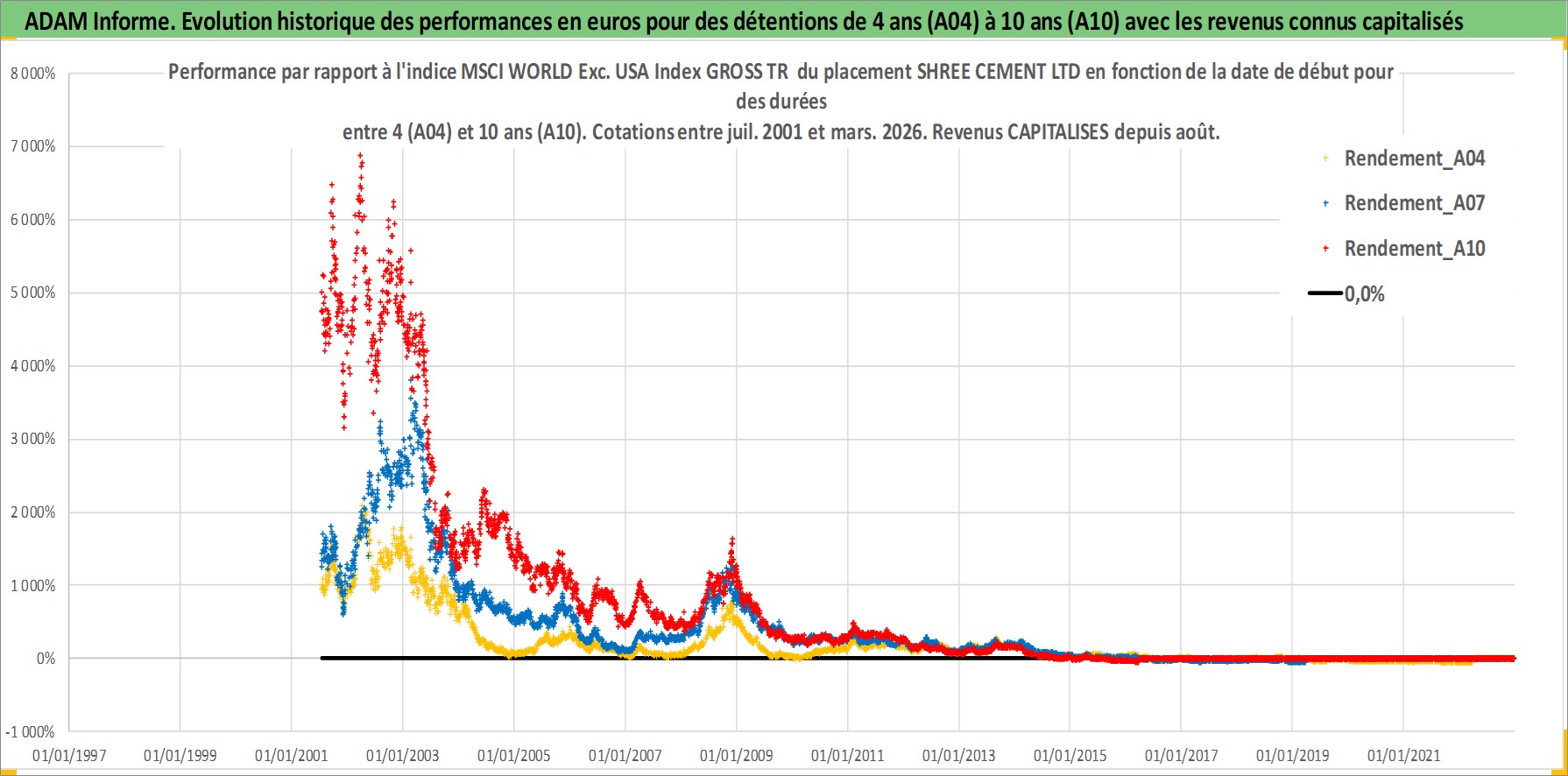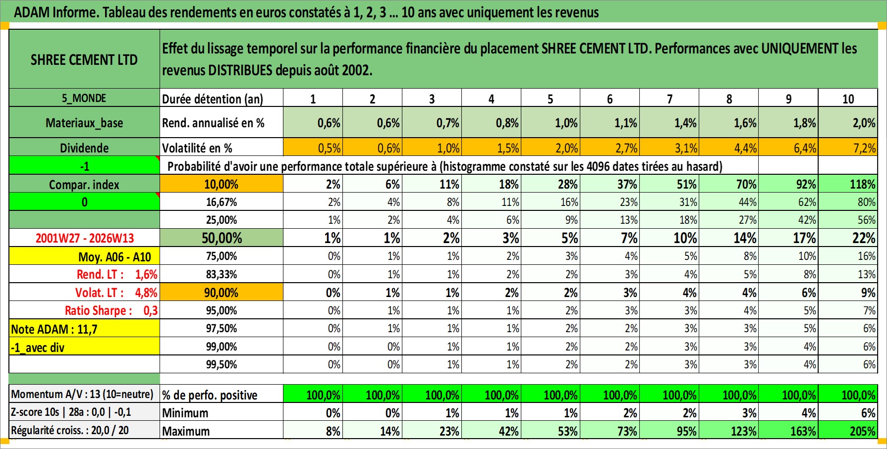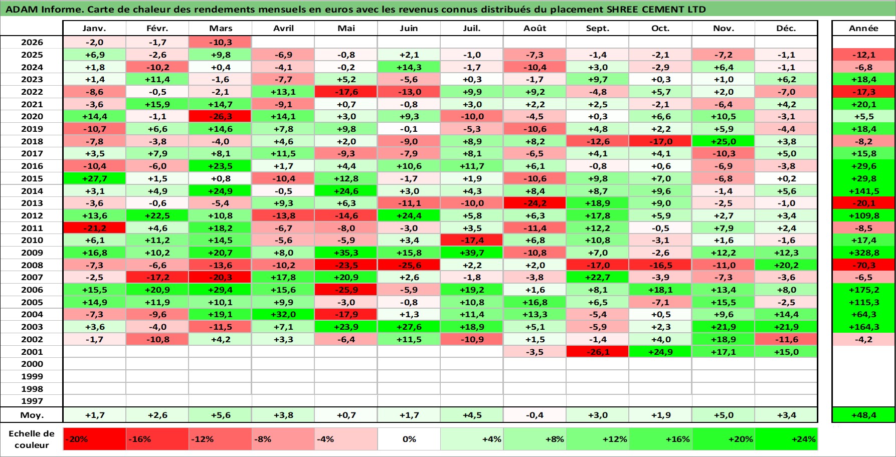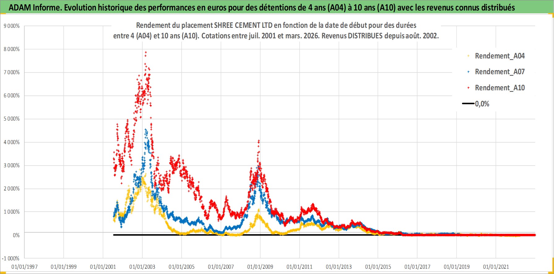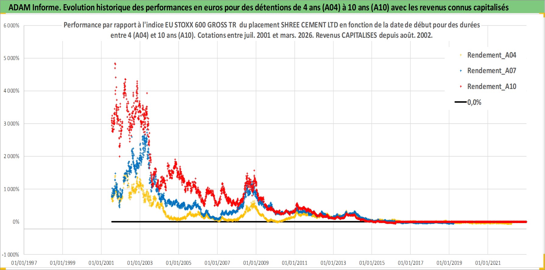 Site dédié aux investisseursPage dédiée sur site financeAnalyse des valorisations hebdomadaires de l'action SHREE CEMENT LTD. Cet actif est cote en INR. Les valorisations sont en contrevaleur EURO et couvrent les semaines 2001W27 a 2026W13. Les revenus de cet actif financier sont pris en compte depuis la semaine 2002W33. La note globale ESG de cet actif est estimee a 6.0 (apres rebasage entre 0 et 20).