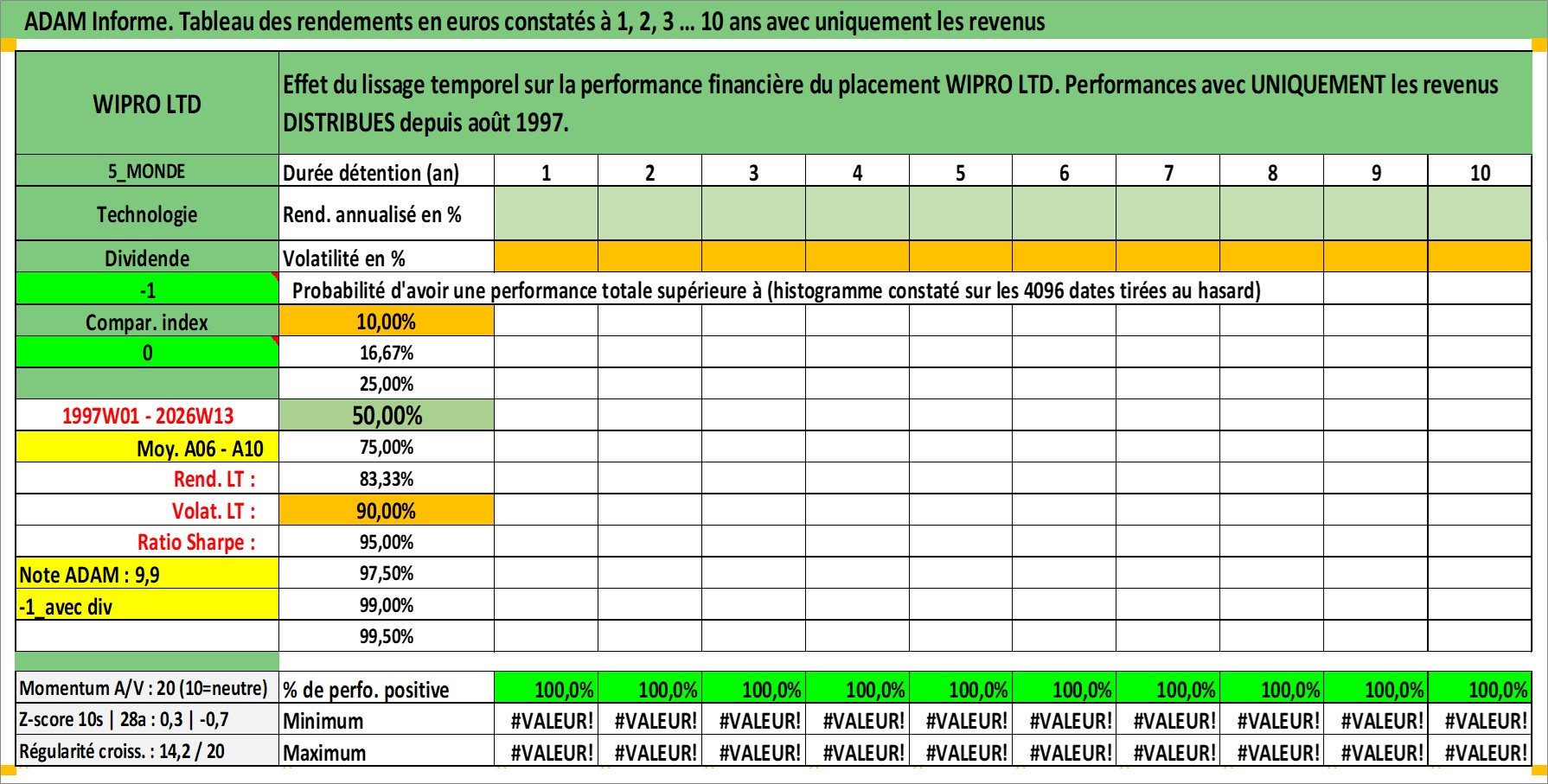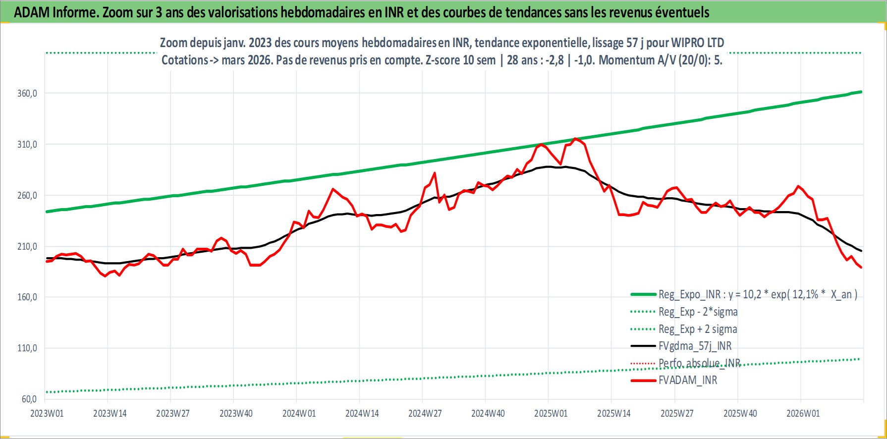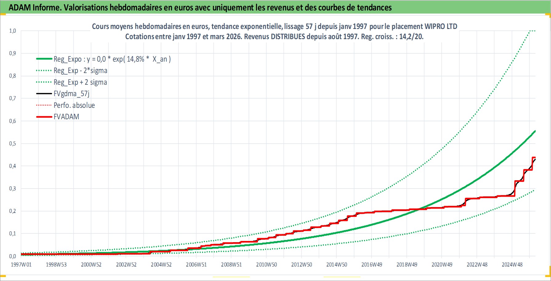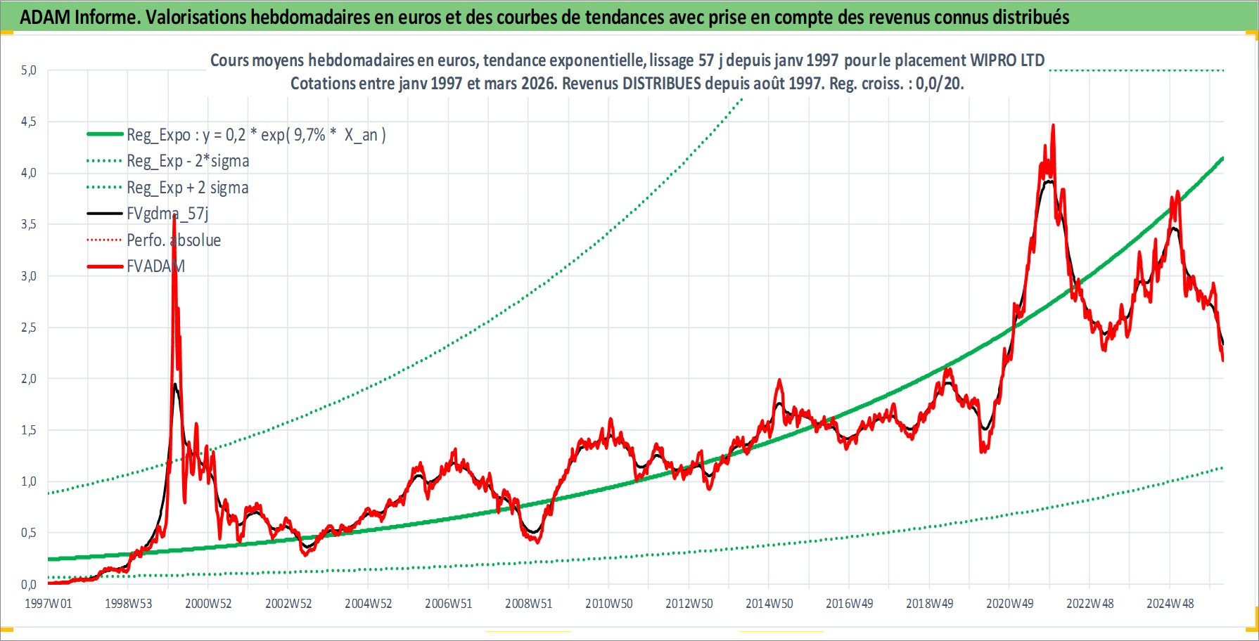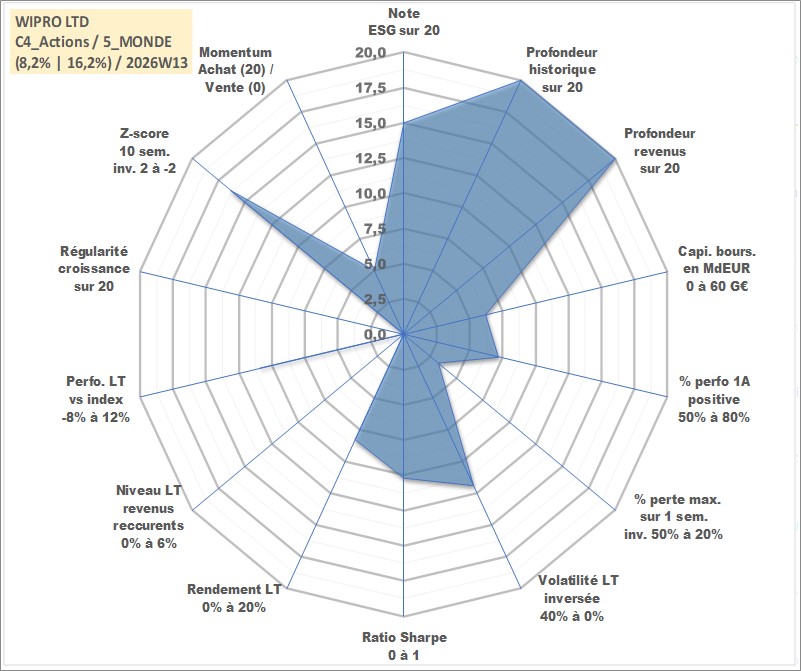 Site dédié aux investisseursPage dédiée sur site financeAnalyse des valorisations hebdomadaires de l'action WIPRO LTD. Cet actif est cote en INR. Les valorisations sont en contrevaleur EURO et couvrent les semaines 1997W01 a 2026W13. Les revenus de cet actif financier sont pris en compte depuis la semaine 1997W32. La note globale ESG de cet actif est estimee a 15.0 (apres rebasage entre 0 et 20).