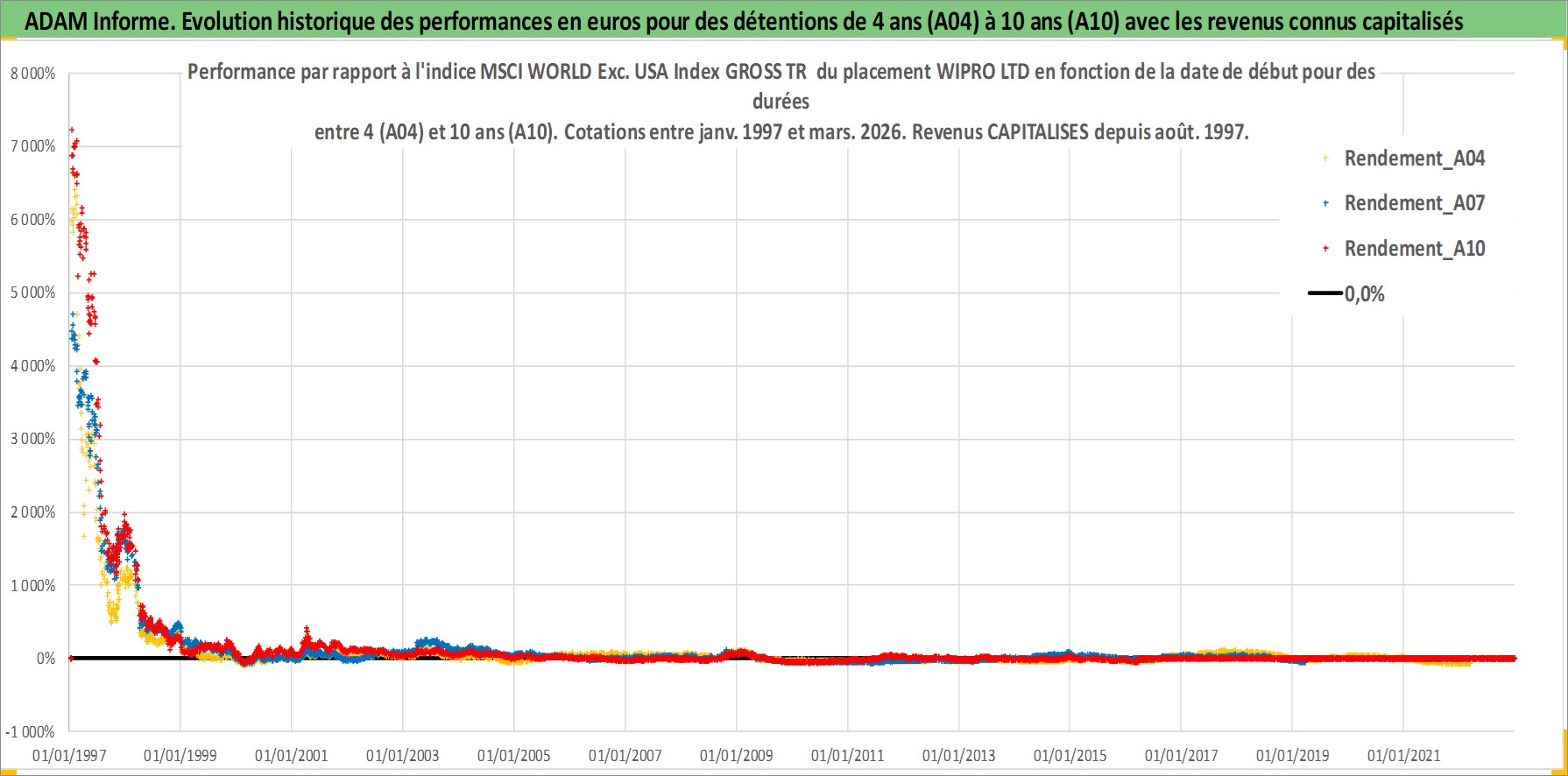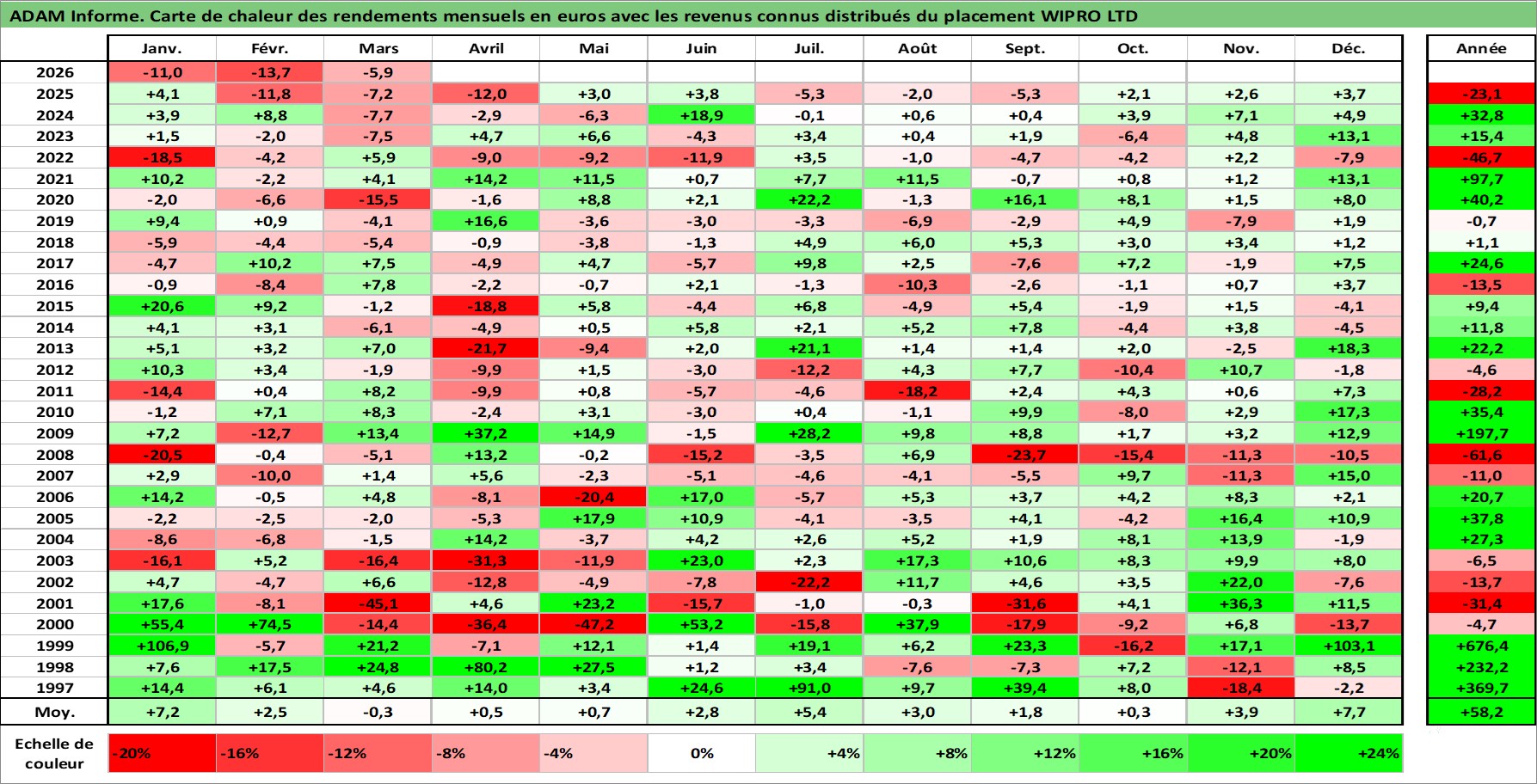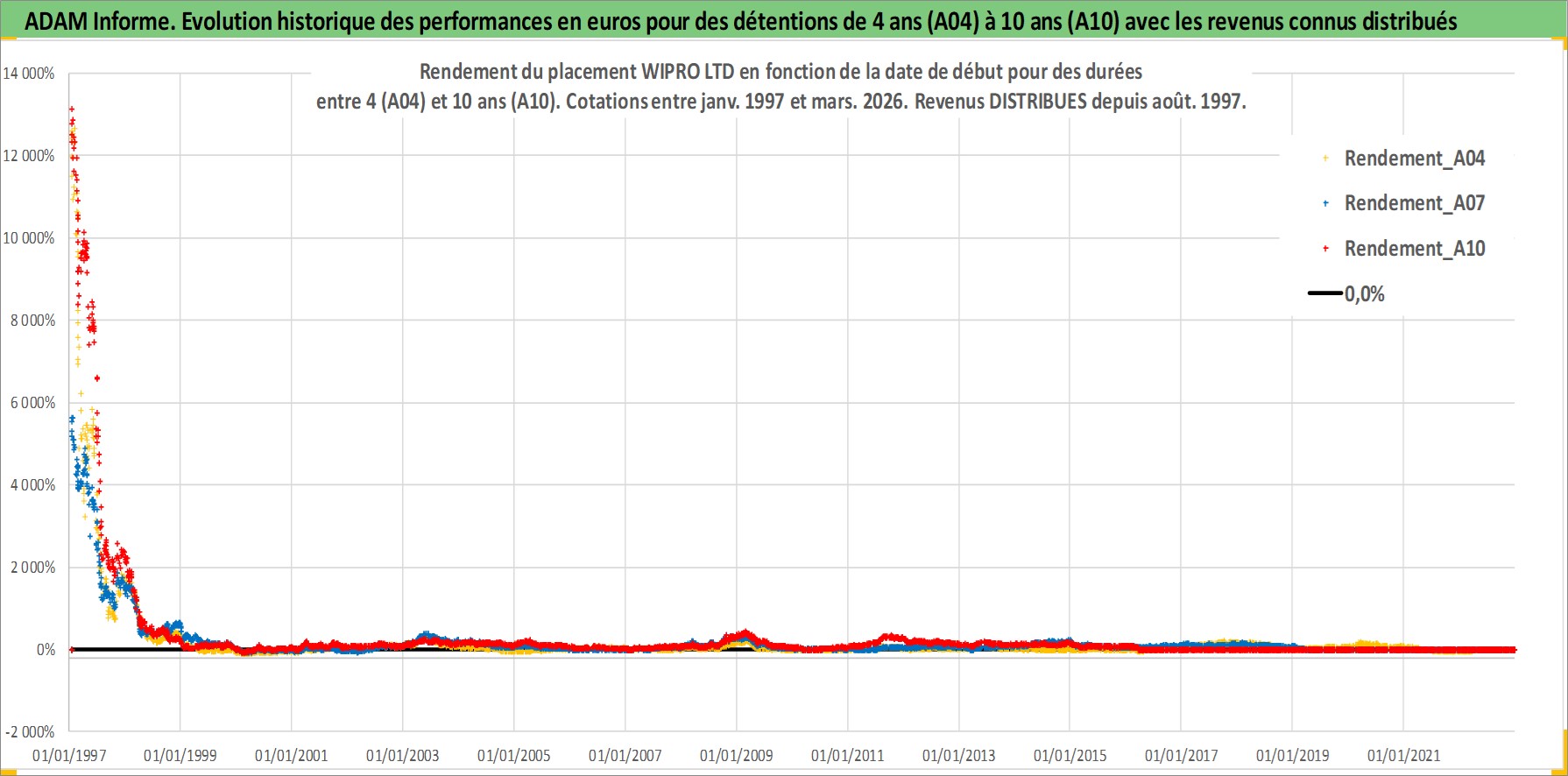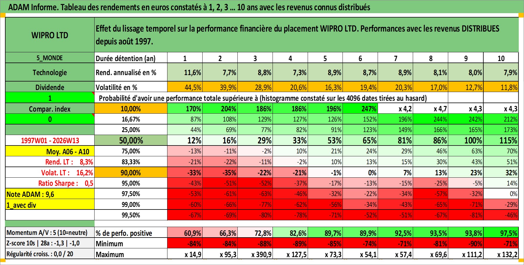 Site dédié aux investisseursPage dédiée sur site financeAnalyse des valorisations hebdomadaires de l'action WIPRO LTD. Cet actif est cote en INR. Les valorisations sont en contrevaleur EURO et couvrent les semaines 1997W01 a 2026W13. Les revenus de cet actif financier sont pris en compte depuis la semaine 1997W32. La note globale ESG de cet actif est estimee a 15.0 (apres rebasage entre 0 et 20).