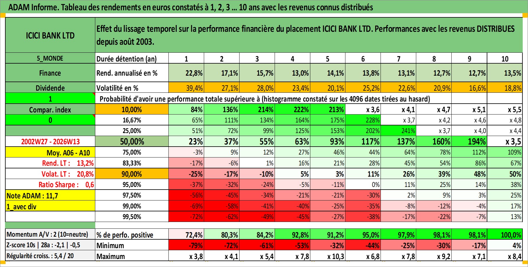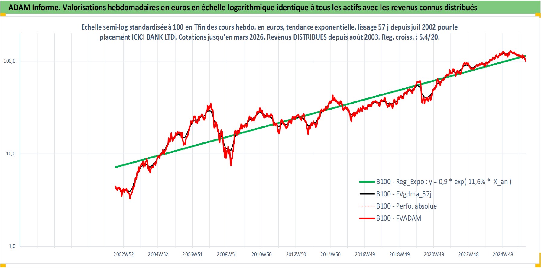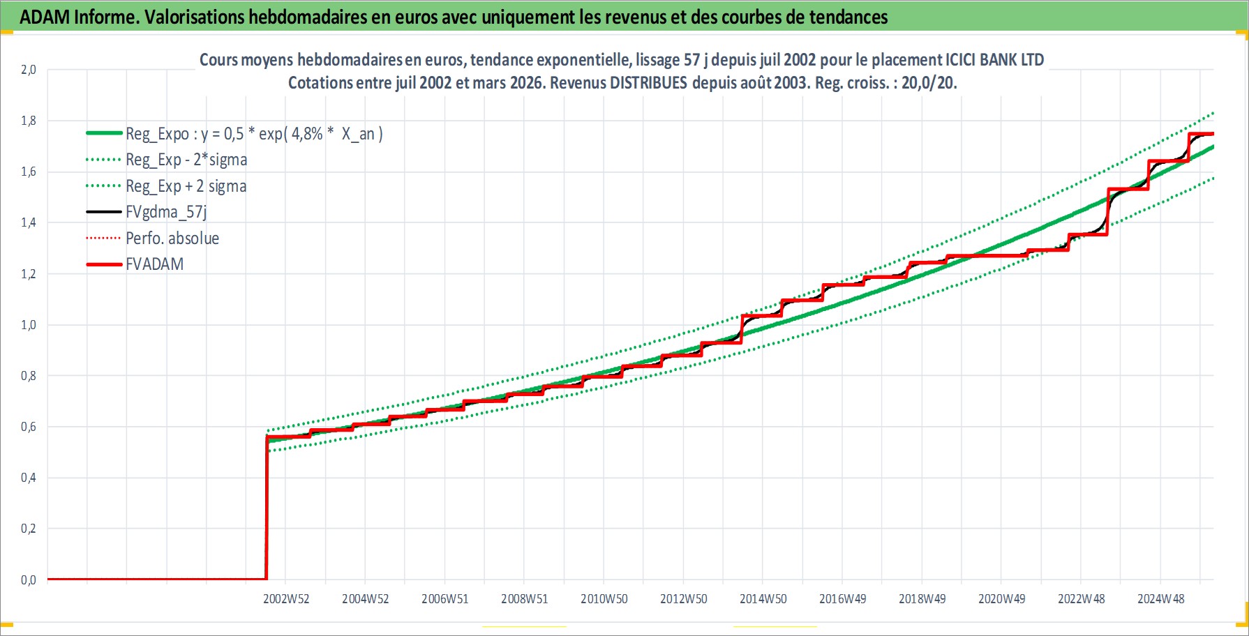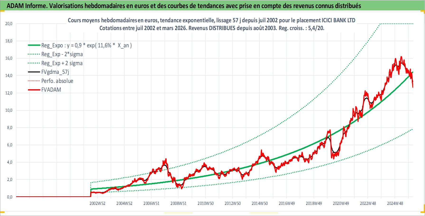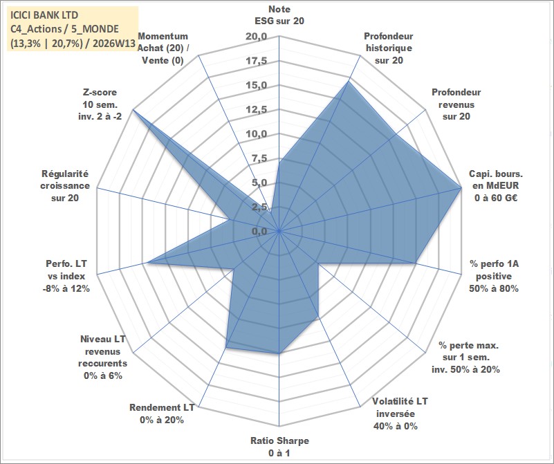 Site dédié aux investisseursPage dédiée sur site financeAnalyse des valorisations hebdomadaires de l'action ICICI BANK LTD. Cet actif est cote en INR. Les valorisations sont en contrevaleur EURO et couvrent les semaines 2002W27 a 2026W13. Les revenus de cet actif financier sont pris en compte depuis la semaine 2003W32. La note globale ESG de cet actif est estimee a 7.0 (apres rebasage entre 0 et 20).