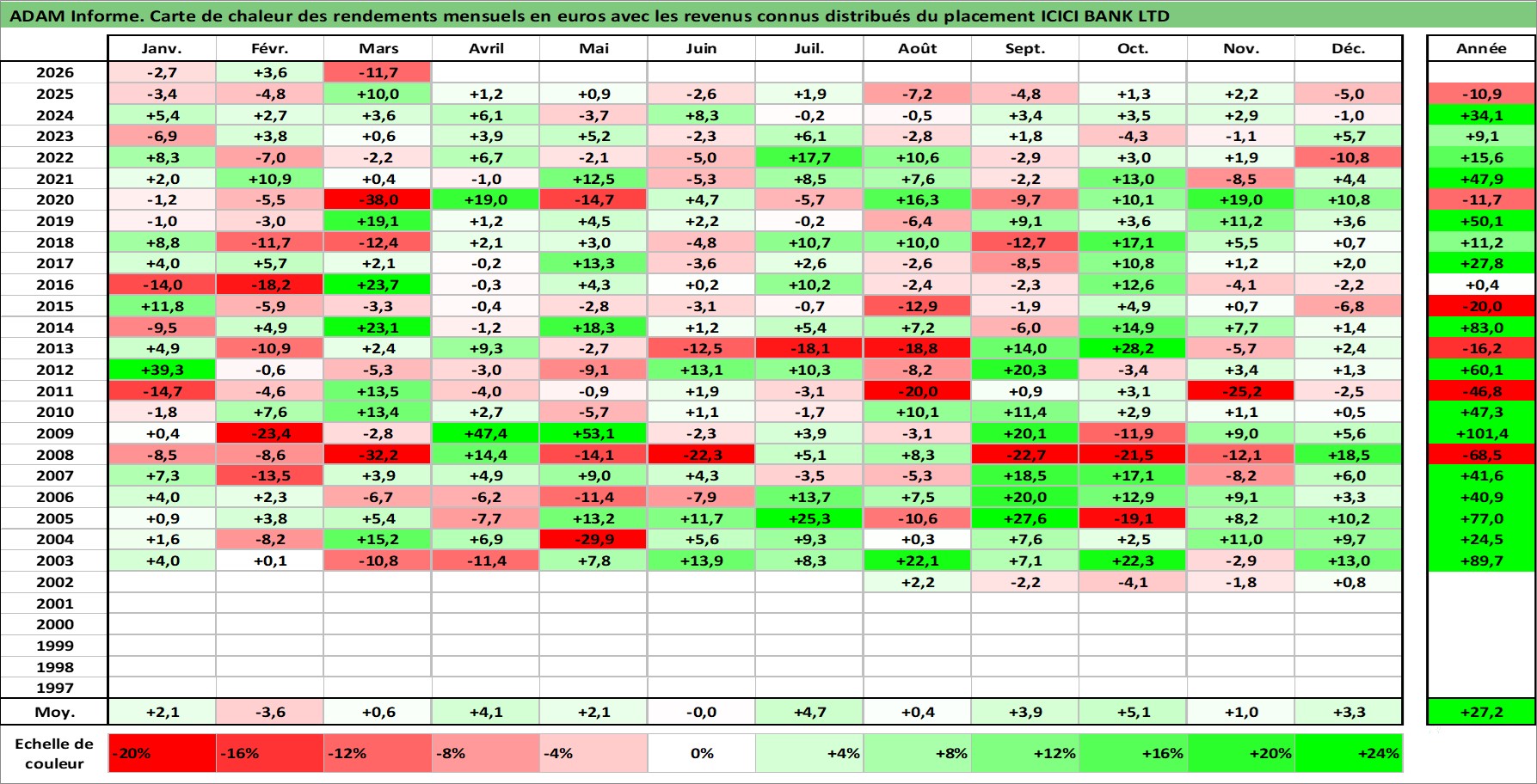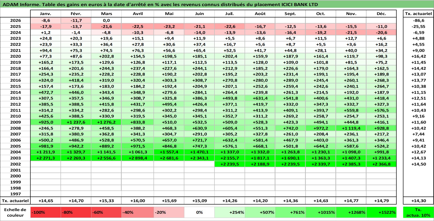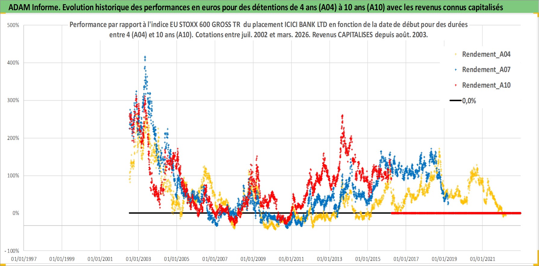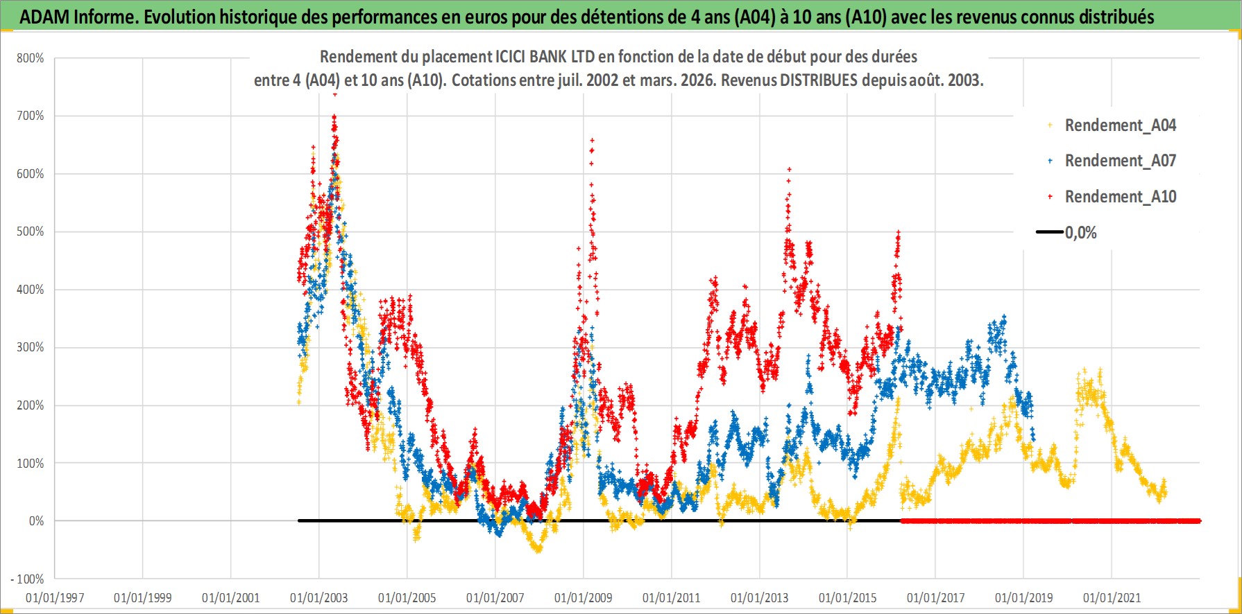 Site dédié aux investisseursPage dédiée sur site financeAnalyse des valorisations hebdomadaires de l'action ICICI BANK LTD. Cet actif est cote en INR. Les valorisations sont en contrevaleur EURO et couvrent les semaines 2002W27 a 2026W13. Les revenus de cet actif financier sont pris en compte depuis la semaine 2003W32. La note globale ESG de cet actif est estimee a 7.0 (apres rebasage entre 0 et 20).
