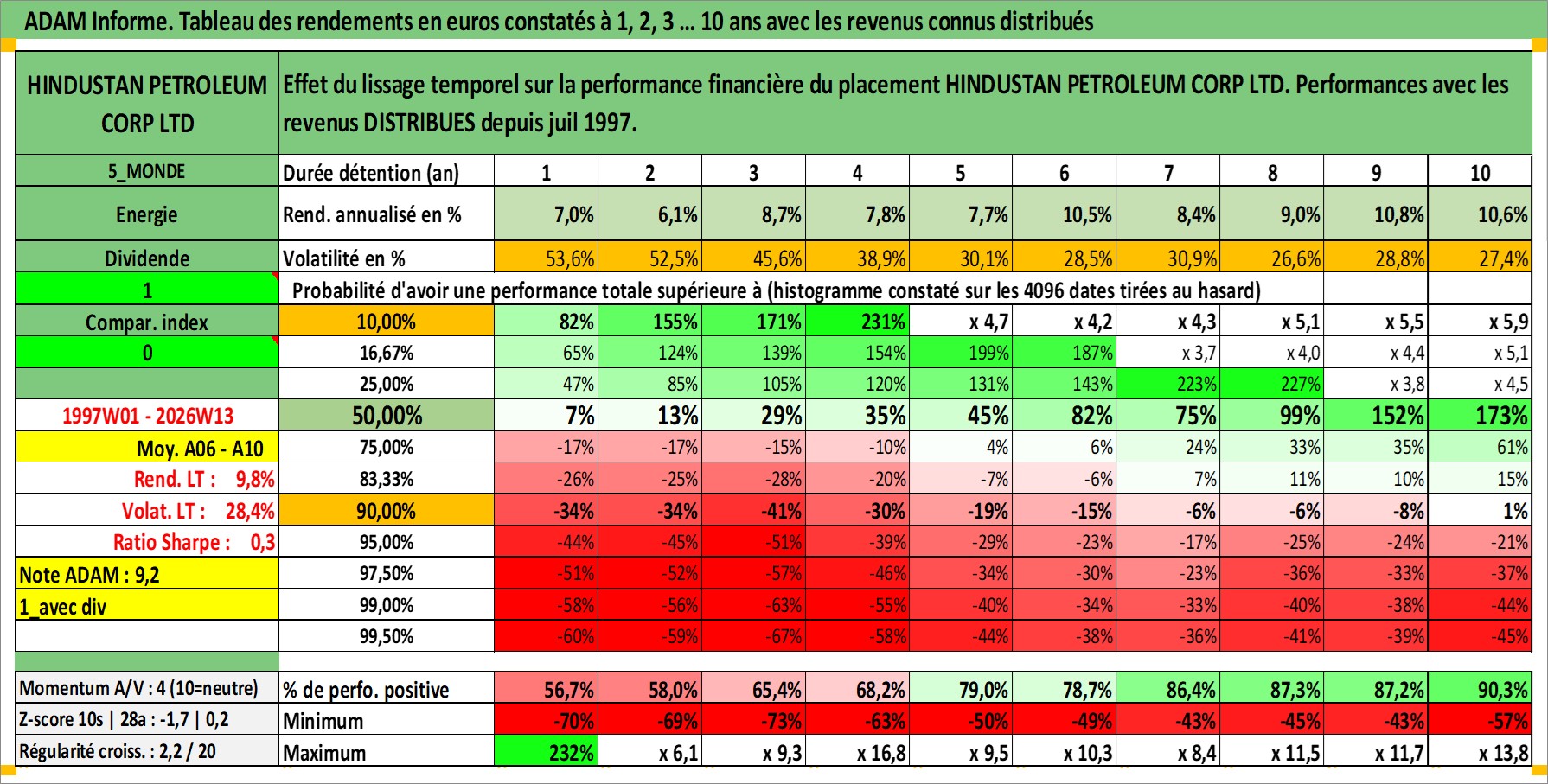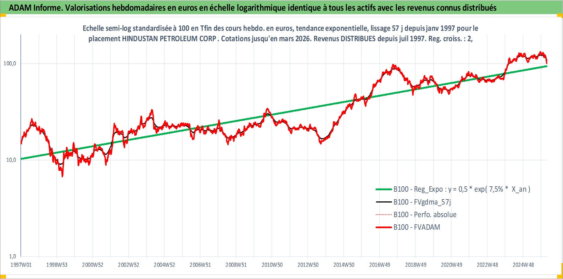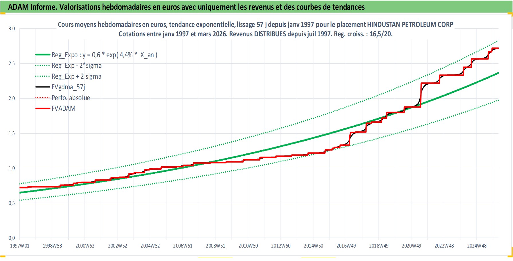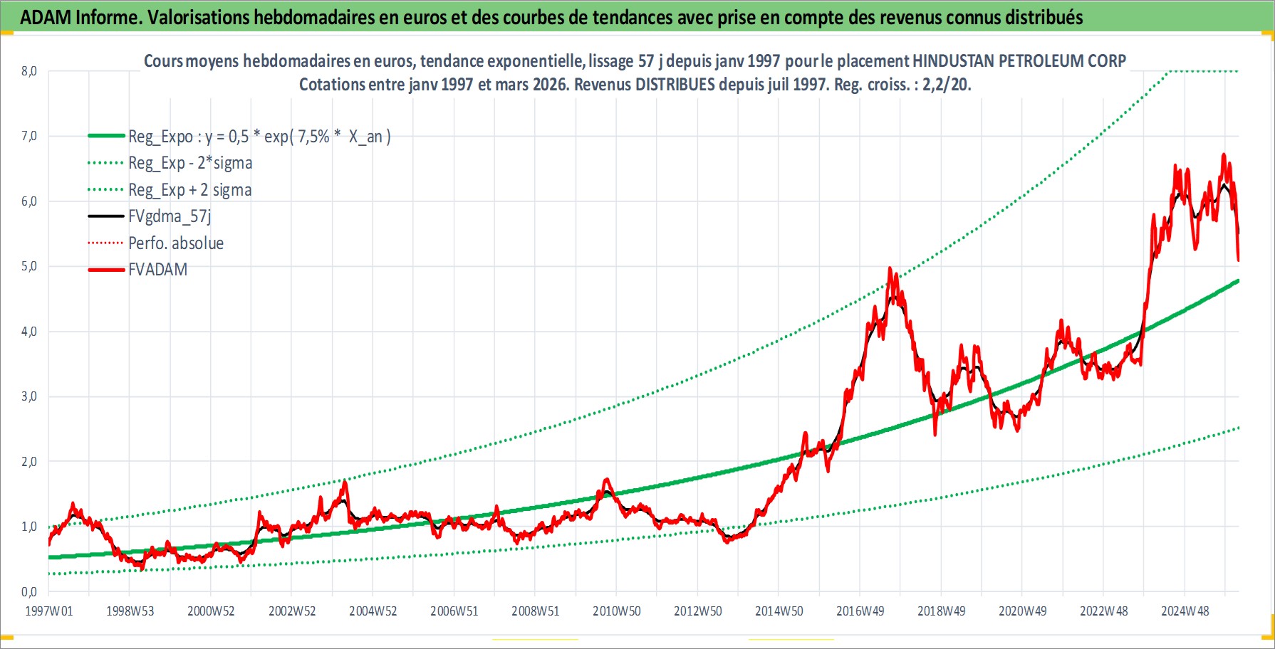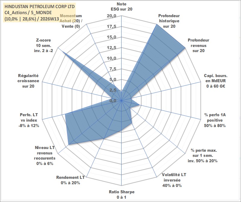 Site dédié aux investisseursPage dédiée sur site financeAnalyse des valorisations hebdomadaires de l'action HINDUSTAN PETROLEUM CORP LTD. Cet actif est cote en INR. Les valorisations sont en contrevaleur EURO et couvrent les semaines 1997W01 a 2026W13. Les revenus de cet actif financier sont pris en compte depuis la semaine 1997W29. La note globale ESG de cet actif est estimee a 2.0 (apres rebasage entre 0 et 20).