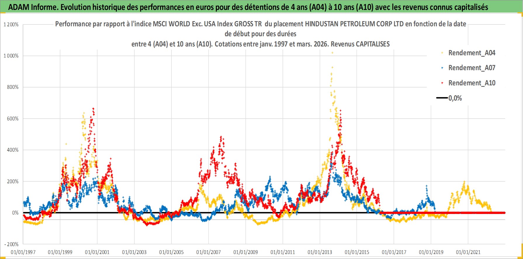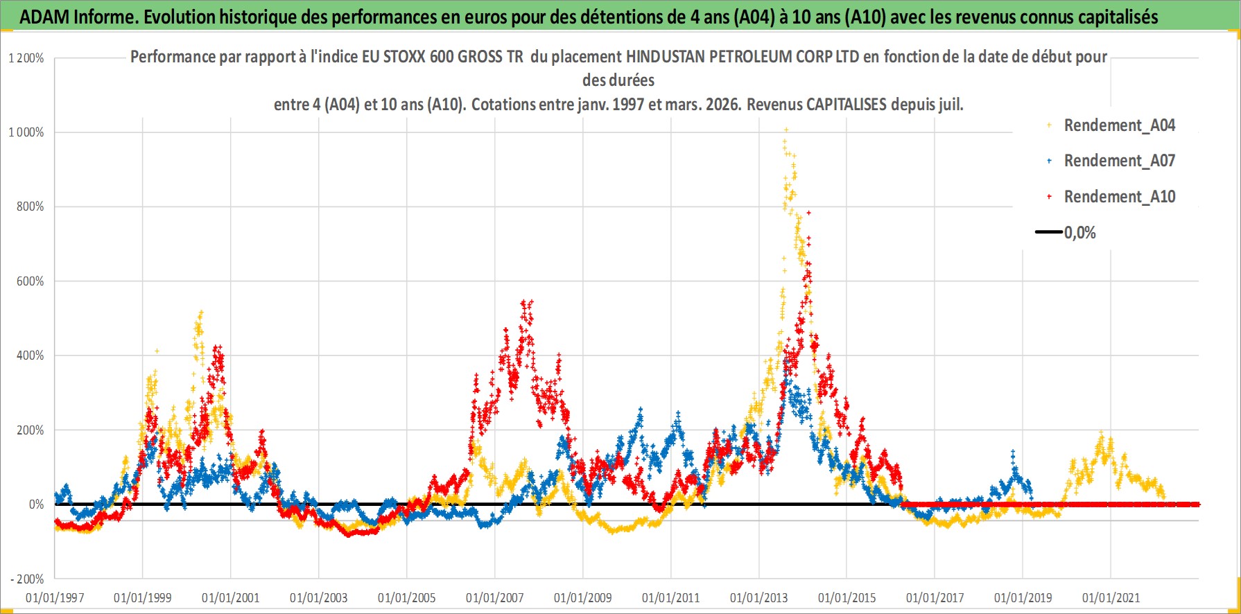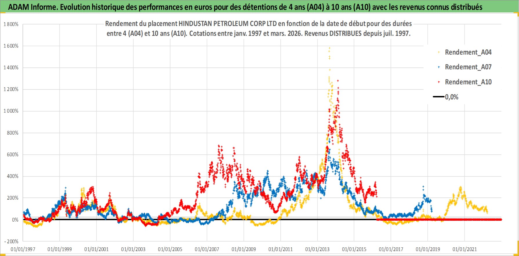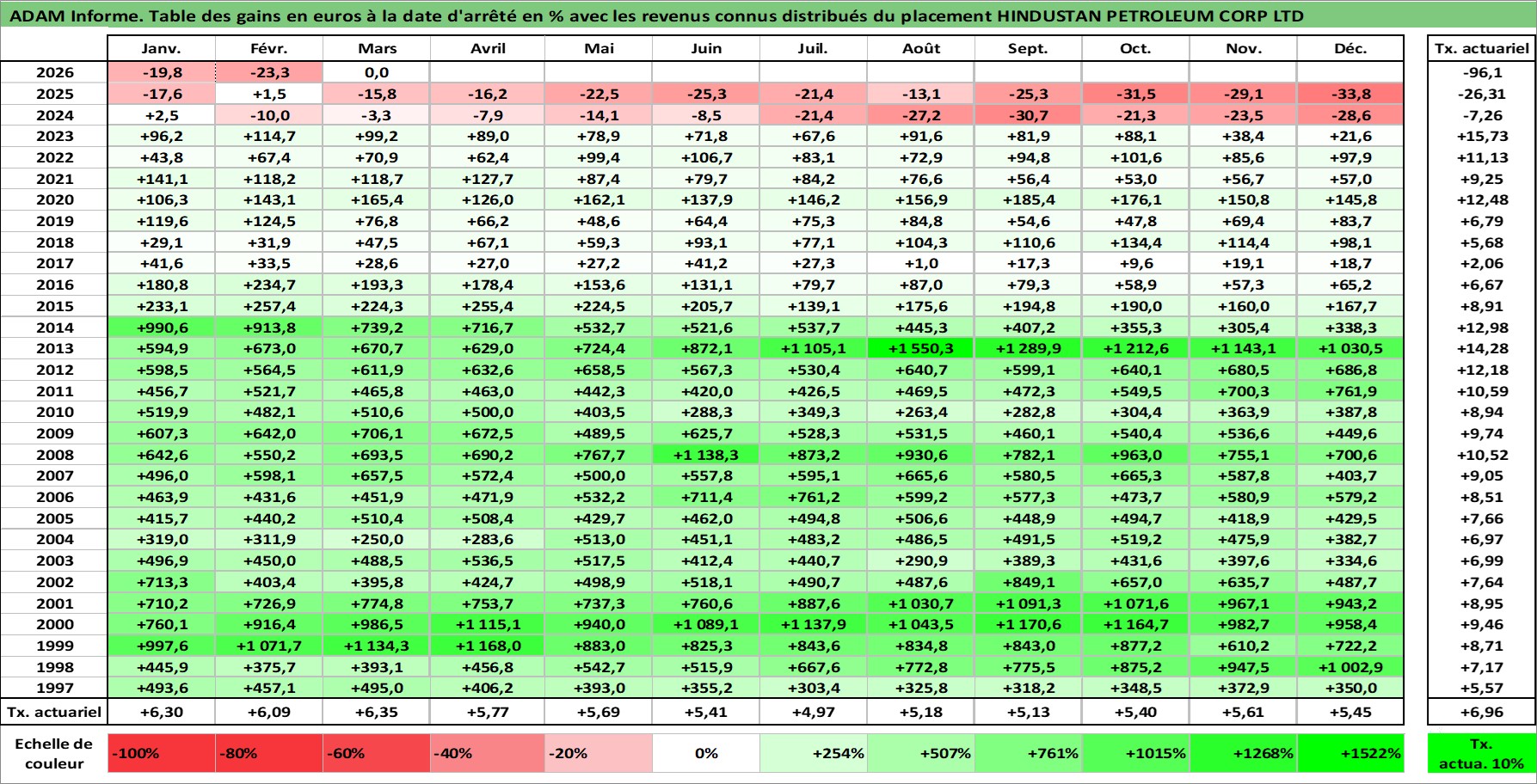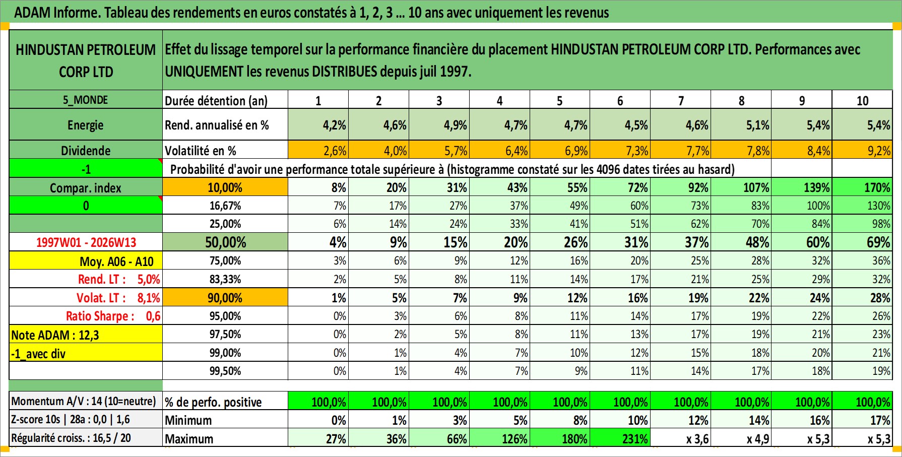 Site dédié aux investisseursPage dédiée sur site financeAnalyse des valorisations hebdomadaires de l'action HINDUSTAN PETROLEUM CORP LTD. Cet actif est cote en INR. Les valorisations sont en contrevaleur EURO et couvrent les semaines 1997W01 a 2026W13. Les revenus de cet actif financier sont pris en compte depuis la semaine 1997W29. La note globale ESG de cet actif est estimee a 2.0 (apres rebasage entre 0 et 20).