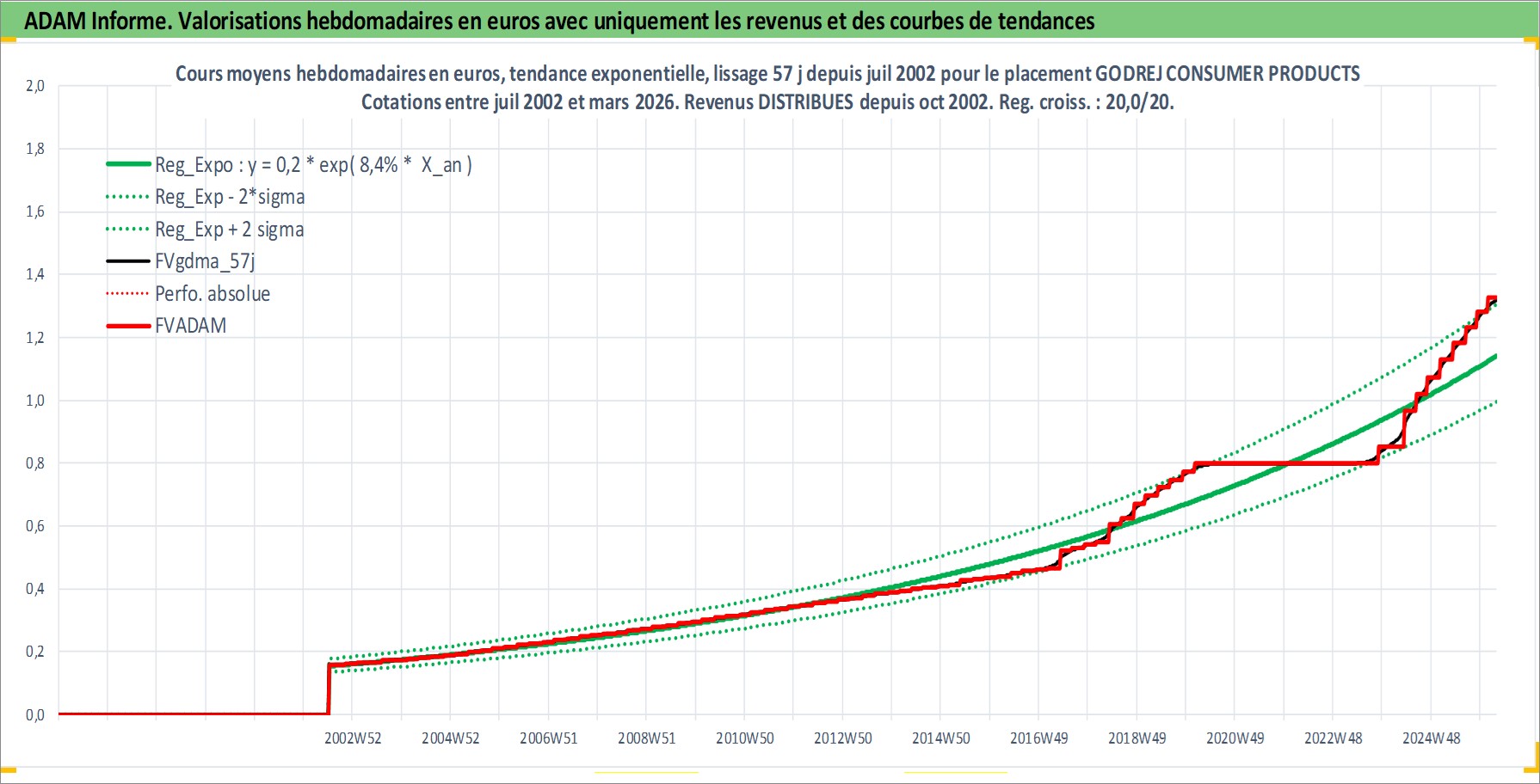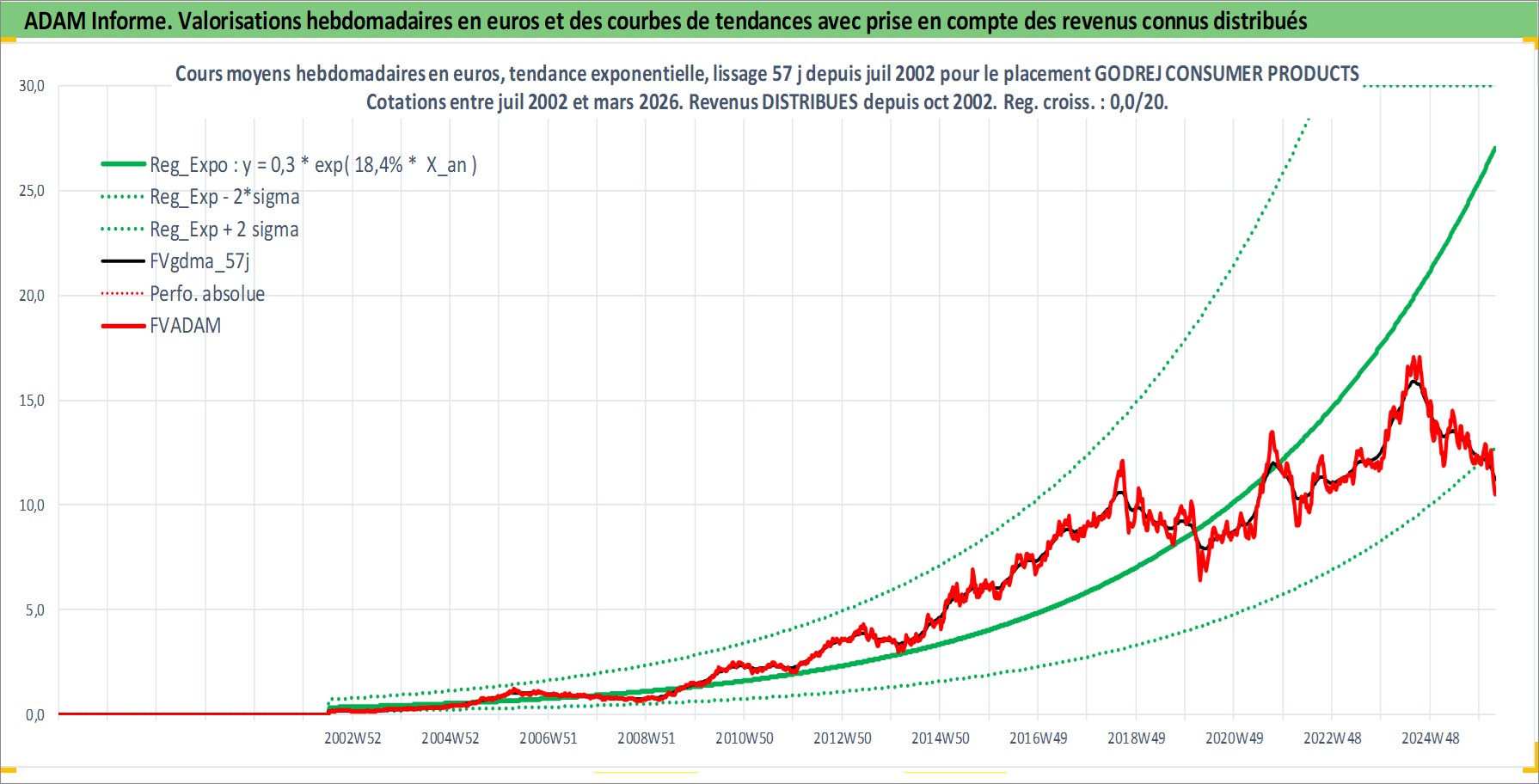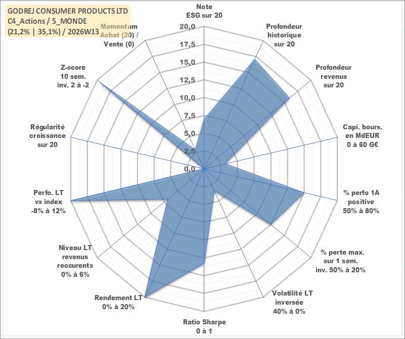 Site dédié aux investisseursPage dédiée sur site financeAnalyse des valorisations hebdomadaires de l'action GODREJ CONSUMER PRODUCTS LTD. Cet actif est cote en INR. Les valorisations sont en contrevaleur EURO et couvrent les semaines 2002W27 a 2026W13. Les revenus de cet actif financier sont pris en compte depuis la semaine 2002W44. La note globale ESG de cet actif est estimee a 7.0 (apres rebasage entre 0 et 20).
