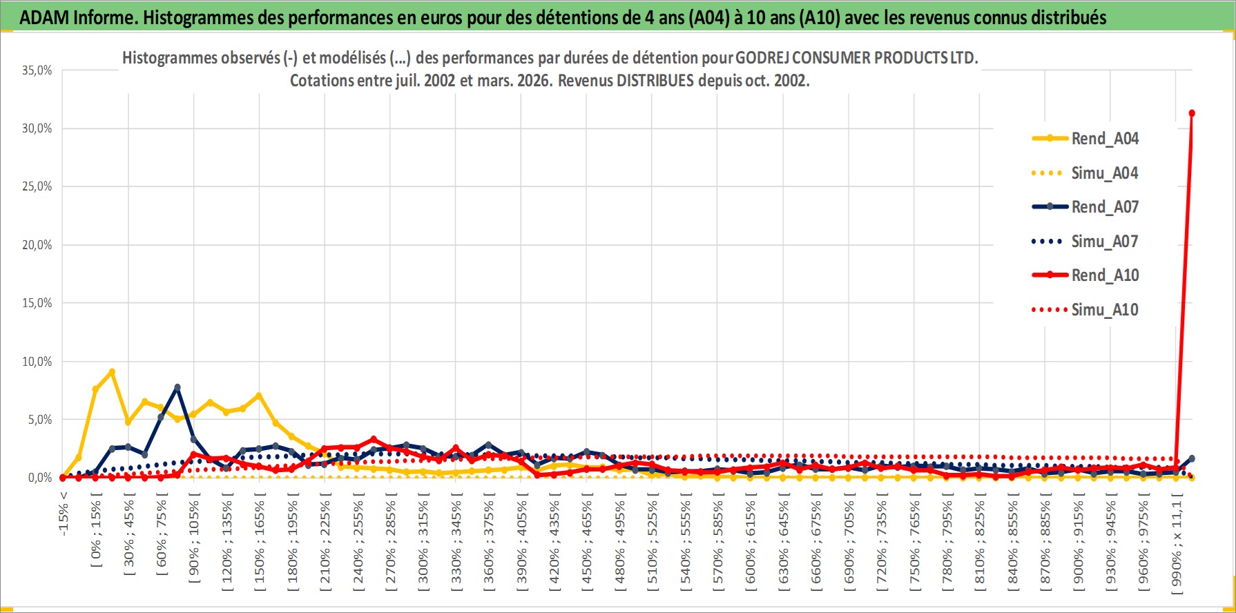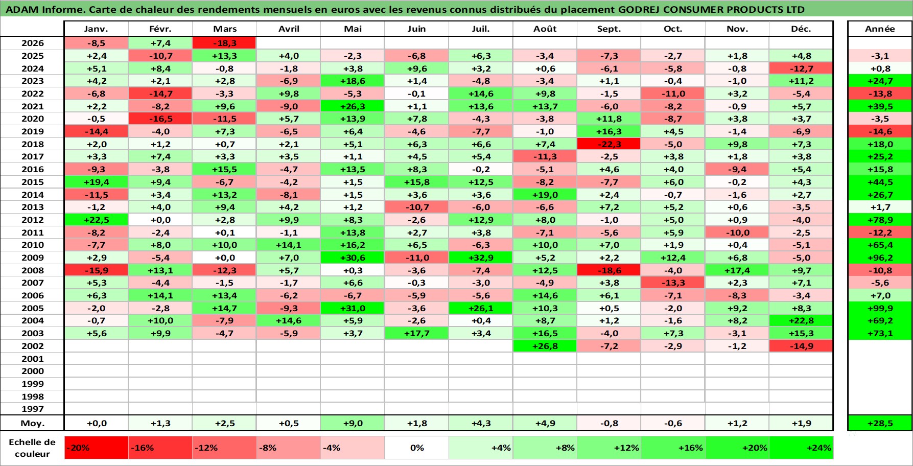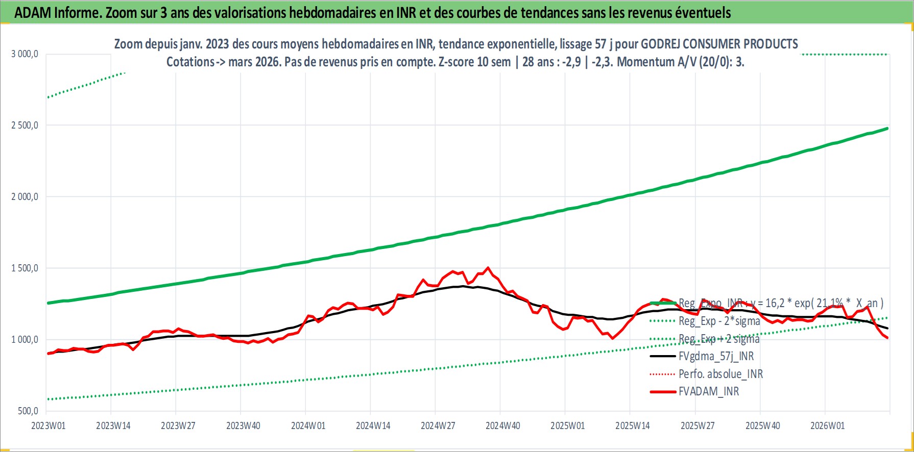 Site dédié aux investisseursPage dédiée sur site financeAnalyse des valorisations hebdomadaires de l'action GODREJ CONSUMER PRODUCTS LTD. Cet actif est cote en INR. Les valorisations sont en contrevaleur EURO et couvrent les semaines 2002W27 a 2026W13. Les revenus de cet actif financier sont pris en compte depuis la semaine 2002W44. La note globale ESG de cet actif est estimee a 7.0 (apres rebasage entre 0 et 20).