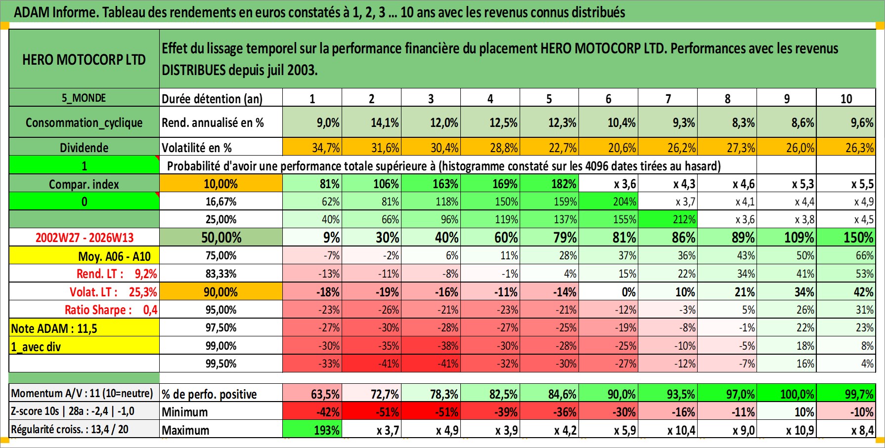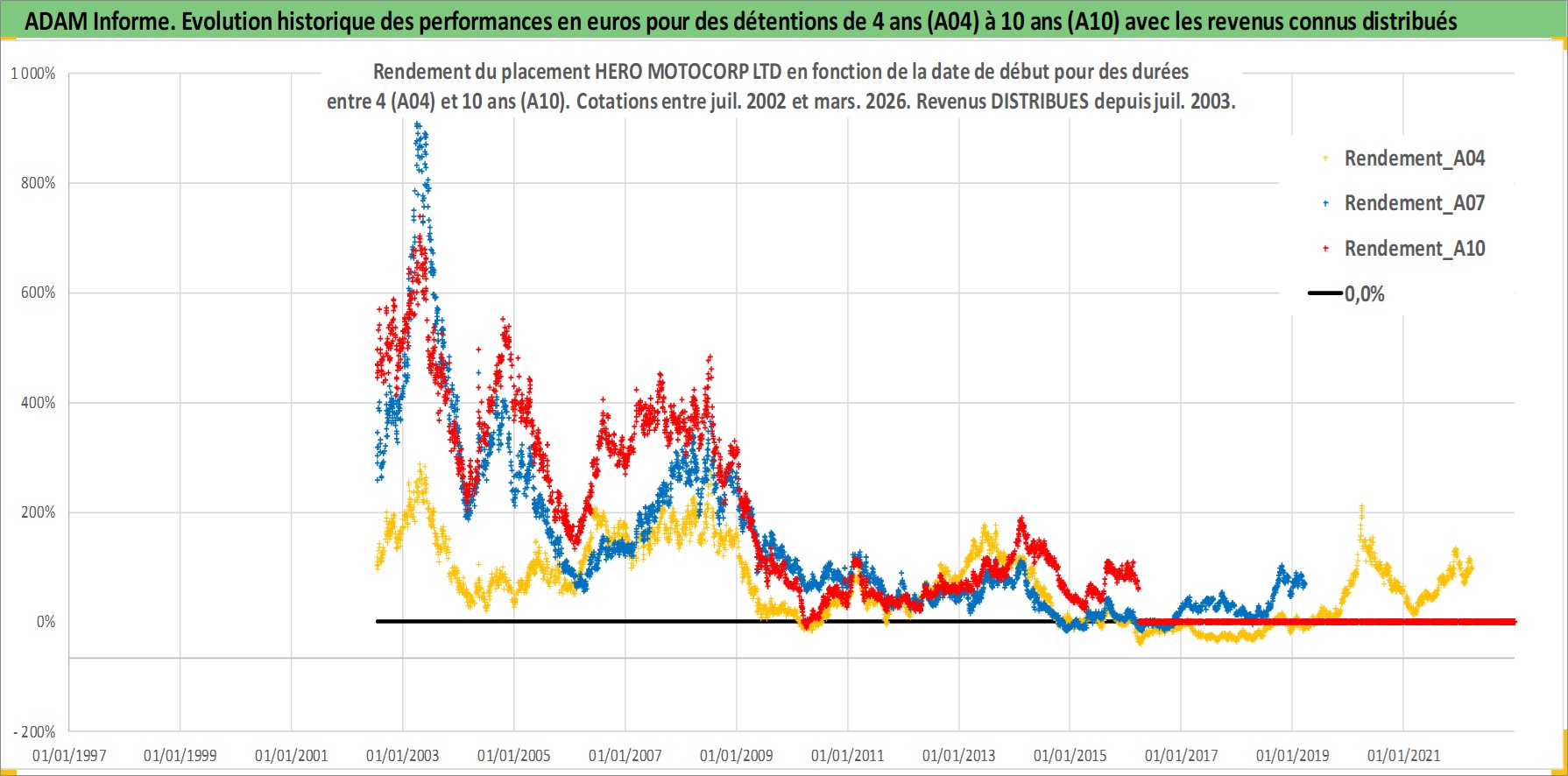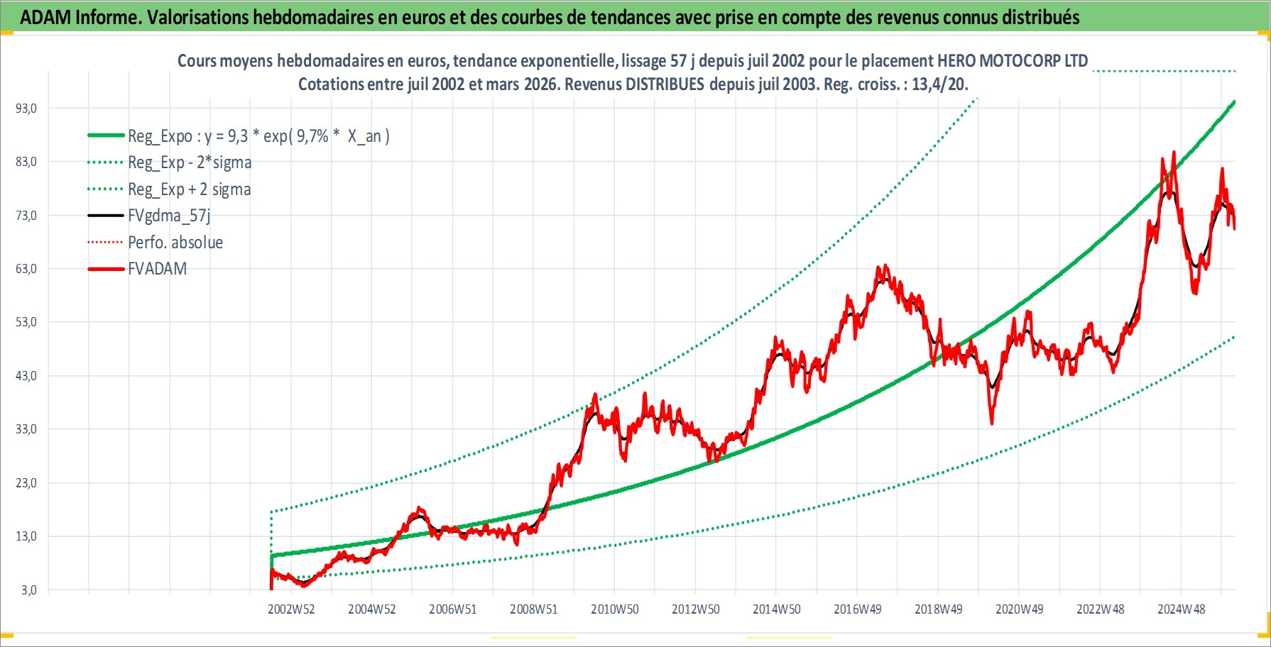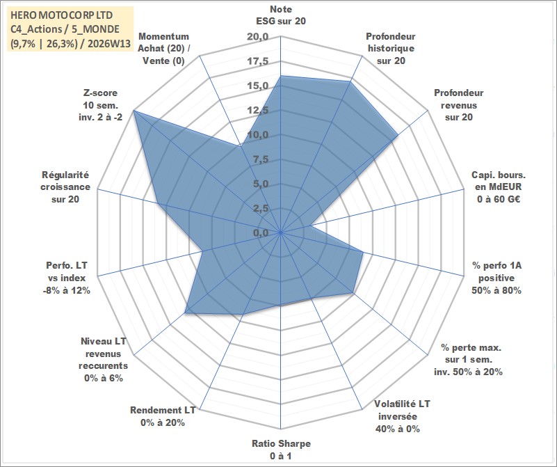 Site dédié aux investisseursPage dédiée sur site financeAnalyse des valorisations hebdomadaires de l'action HERO MOTOCORP LTD. Cet actif est cote en INR. Les valorisations sont en contrevaleur EURO et couvrent les semaines 2002W27 a 2026W13. Les revenus de cet actif financier sont pris en compte depuis la semaine 2003W29. La note globale ESG de cet actif est estimee a 16.0 (apres rebasage entre 0 et 20).