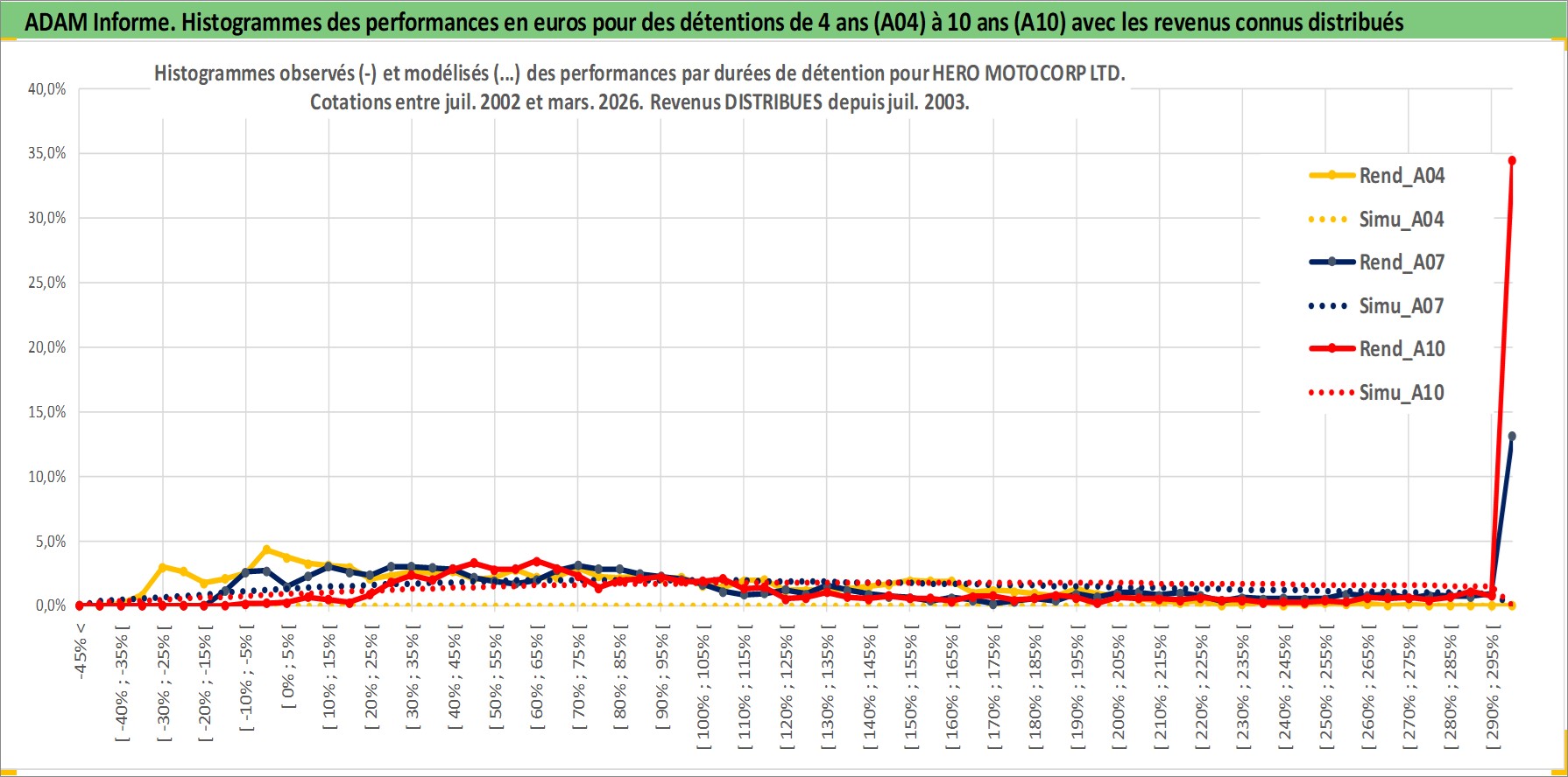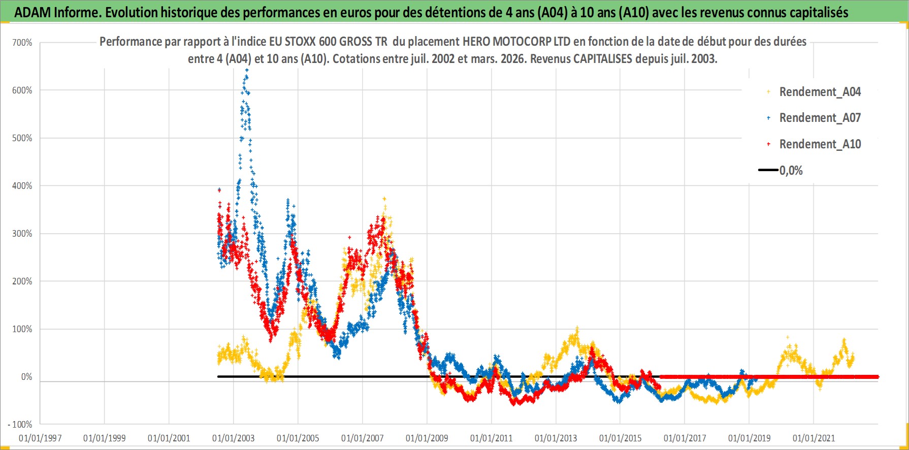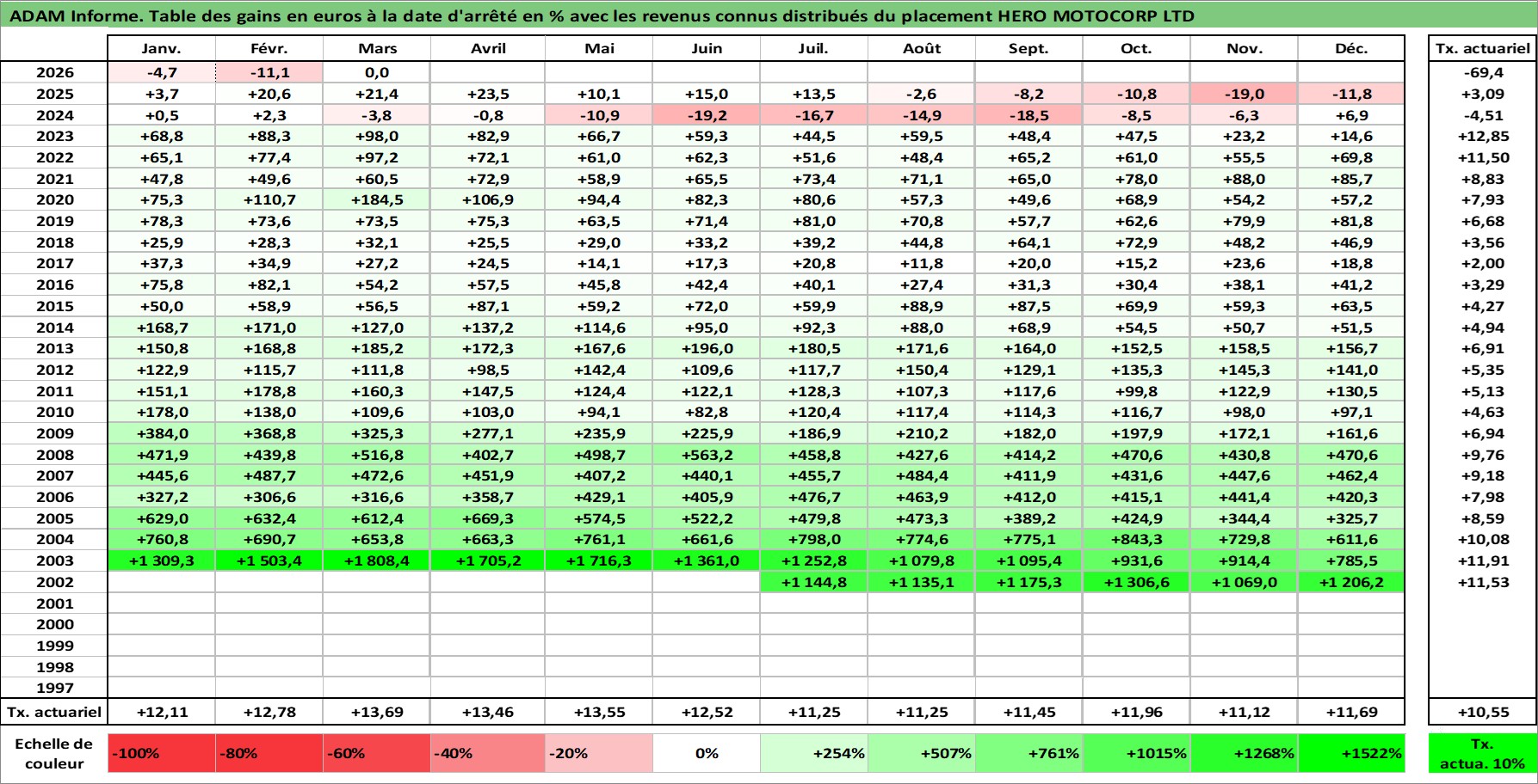 Site dédié aux investisseursPage dédiée sur site financeAnalyse des valorisations hebdomadaires de l'action HERO MOTOCORP LTD. Cet actif est cote en INR. Les valorisations sont en contrevaleur EURO et couvrent les semaines 2002W27 a 2026W13. Les revenus de cet actif financier sont pris en compte depuis la semaine 2003W29. La note globale ESG de cet actif est estimee a 16.0 (apres rebasage entre 0 et 20).