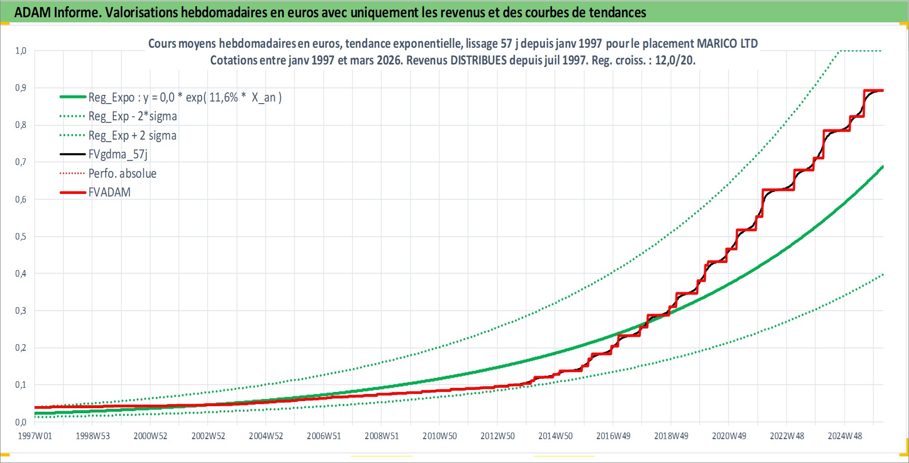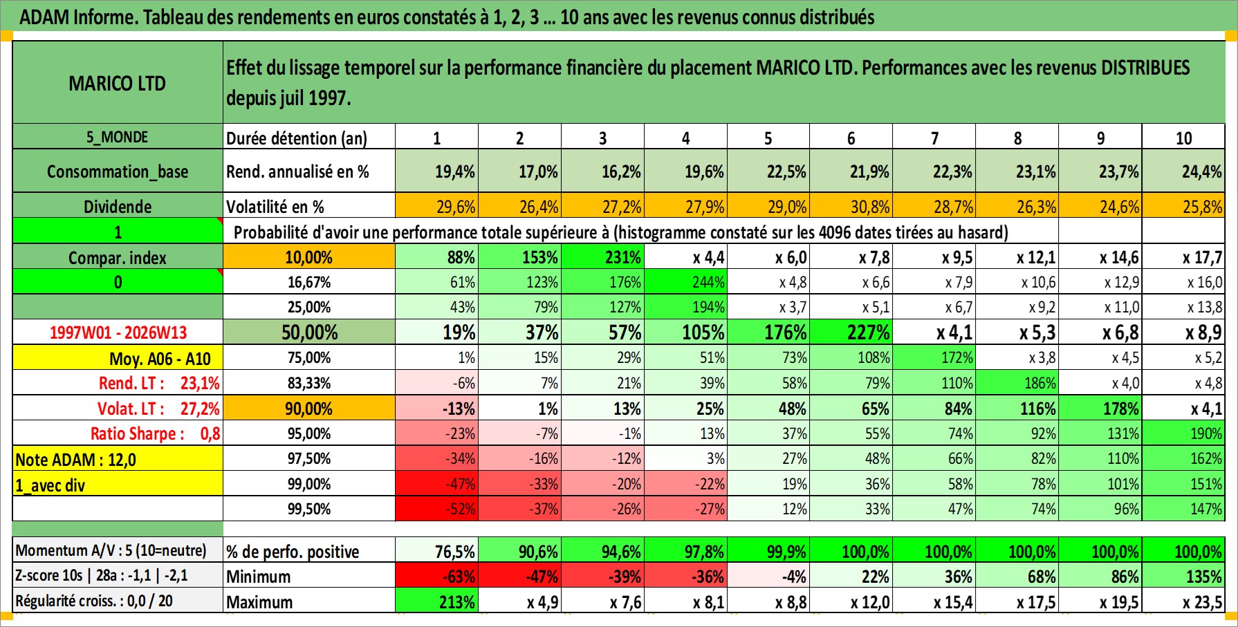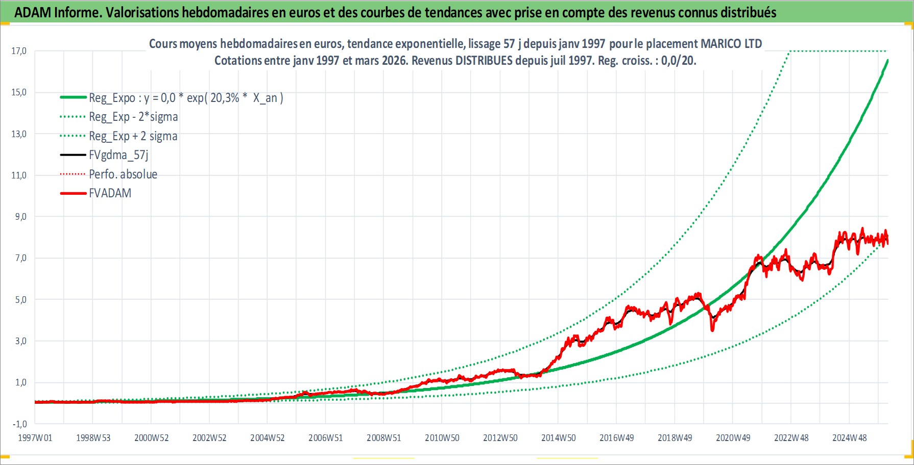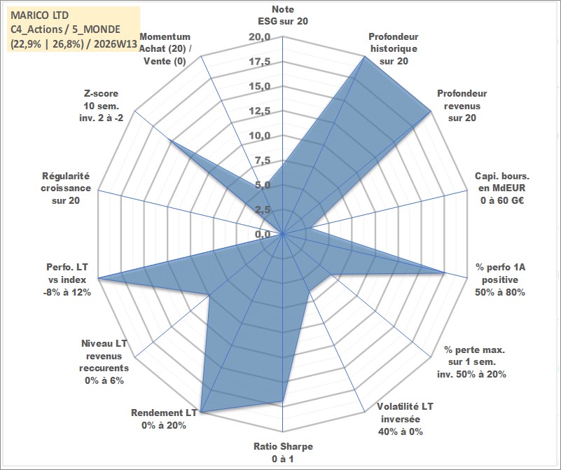 Site dédié aux investisseursPage dédiée sur site financeAnalyse des valorisations hebdomadaires de l'action MARICO LTD. Cet actif est cote en INR. Les valorisations sont en contrevaleur EURO et couvrent les semaines 1997W01 a 2026W13. Les revenus de cet actif financier sont pris en compte depuis la semaine 1997W31. La note globale ESG de cet actif est estimee a 7.0 (apres rebasage entre 0 et 20).