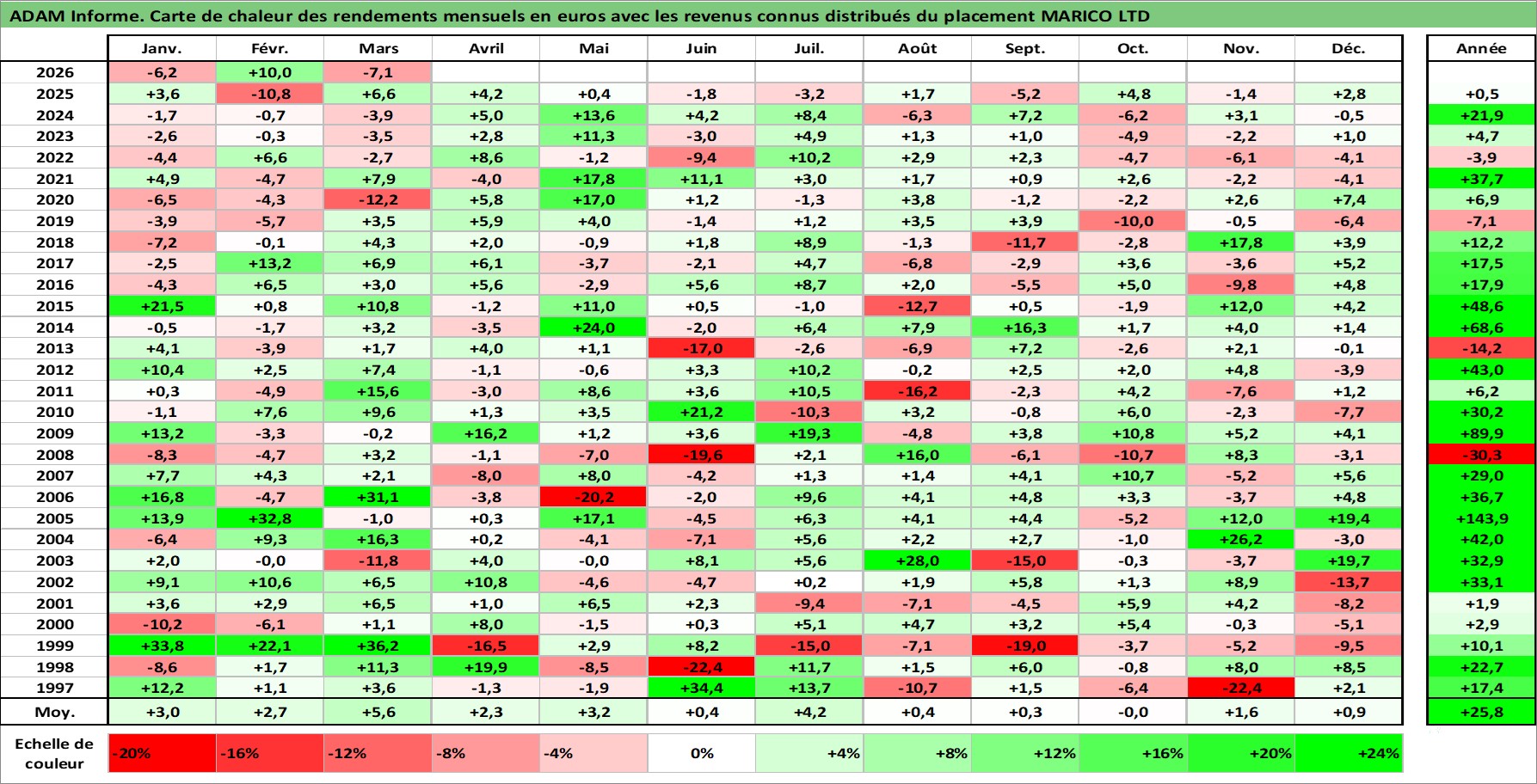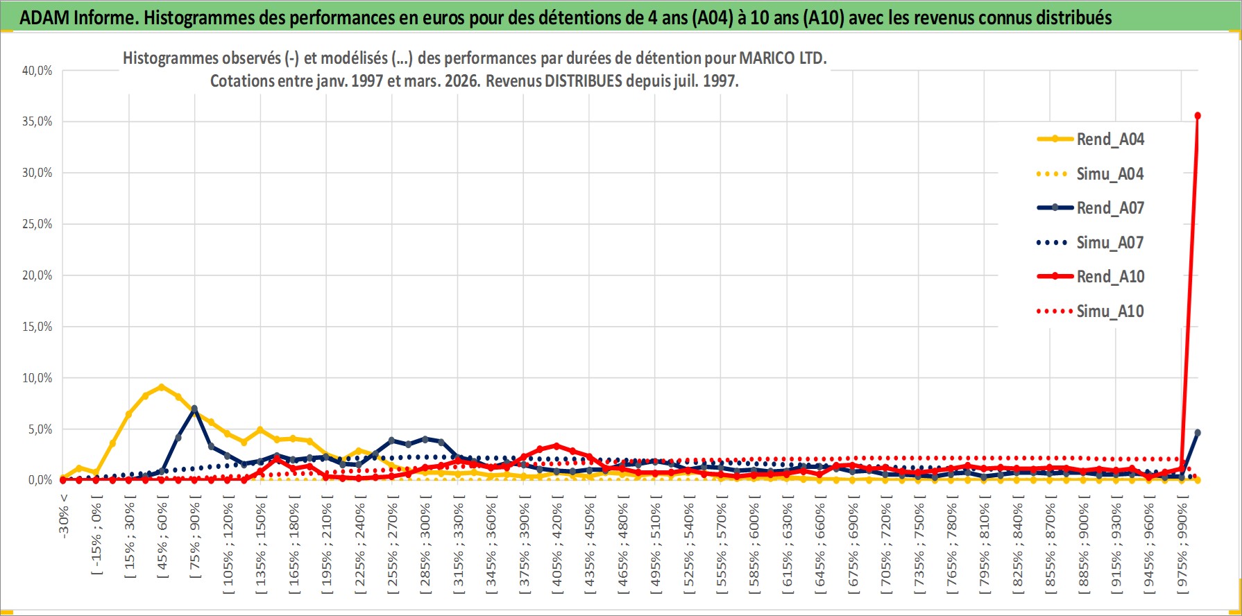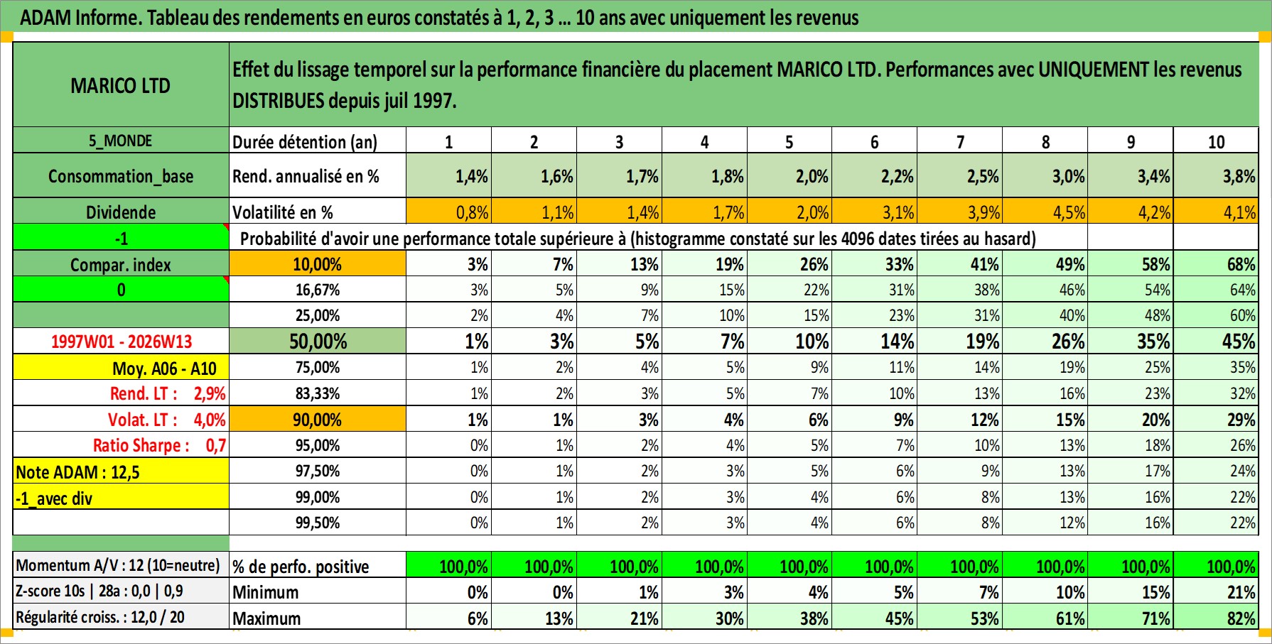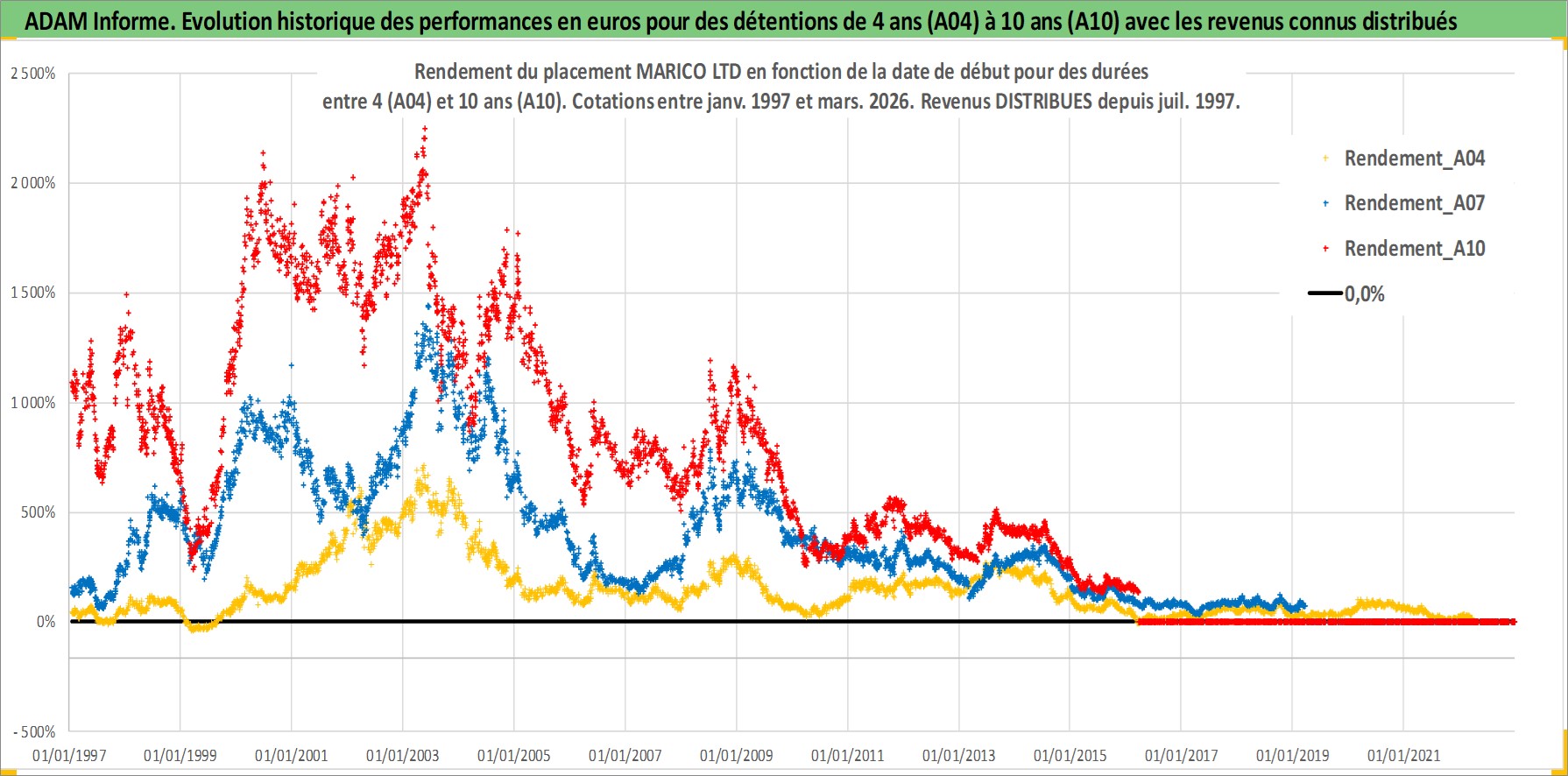 Site dédié aux investisseursPage dédiée sur site financeAnalyse des valorisations hebdomadaires de l'action MARICO LTD. Cet actif est cote en INR. Les valorisations sont en contrevaleur EURO et couvrent les semaines 1997W01 a 2026W13. Les revenus de cet actif financier sont pris en compte depuis la semaine 1997W31. La note globale ESG de cet actif est estimee a 7.0 (apres rebasage entre 0 et 20).