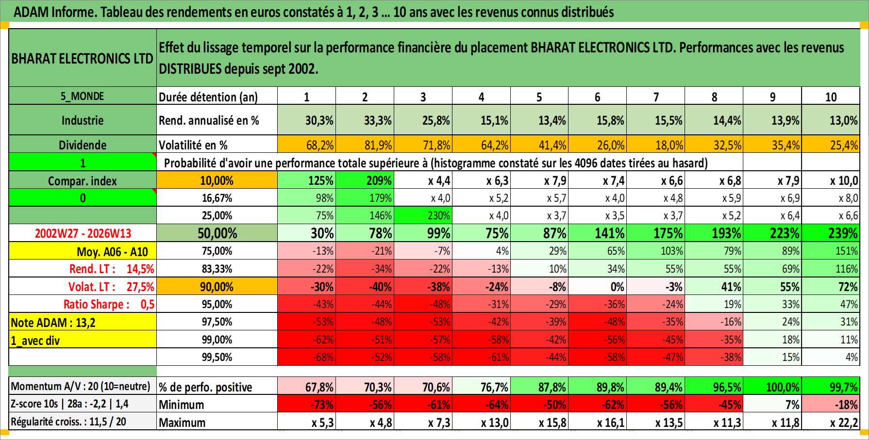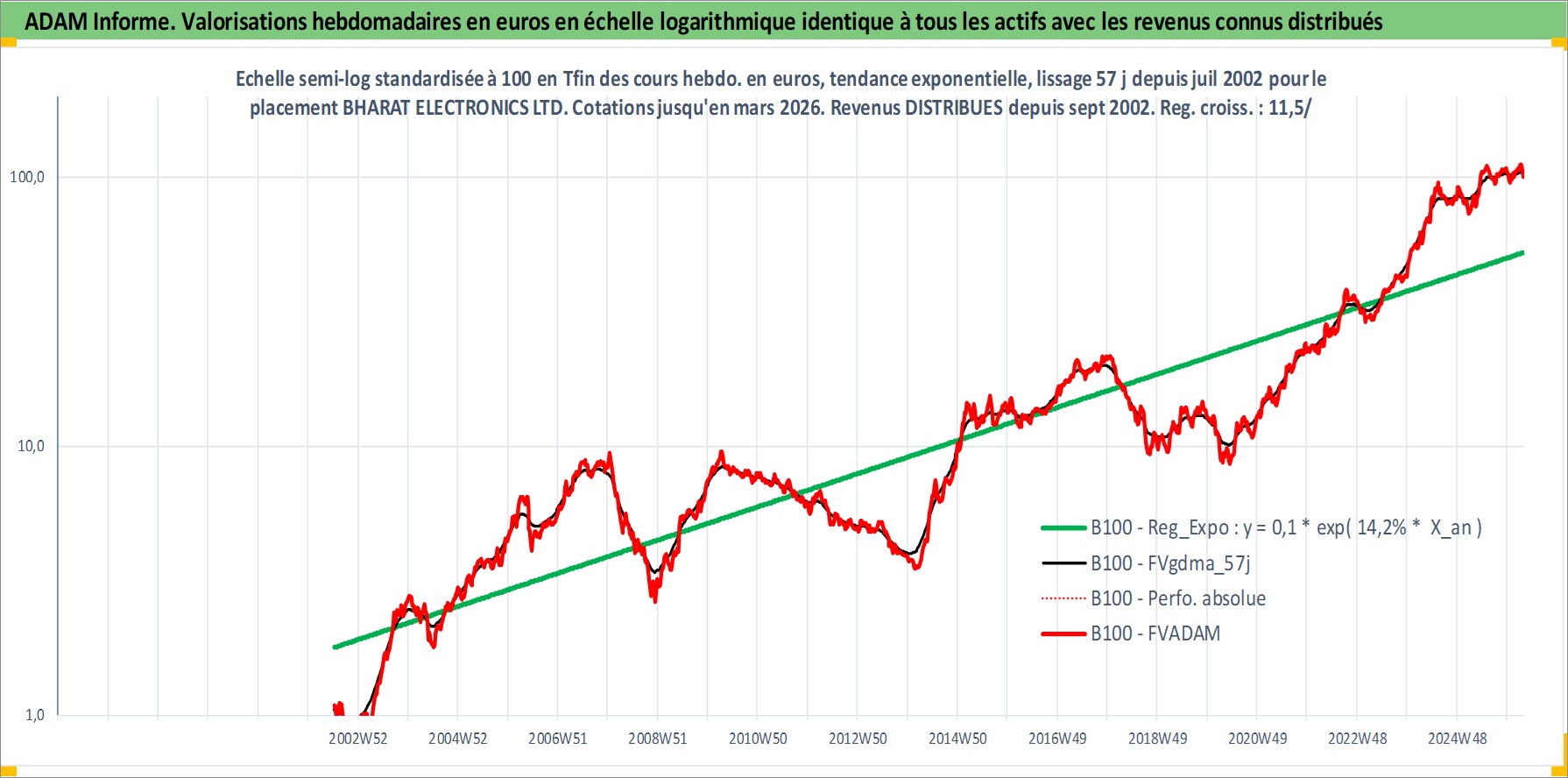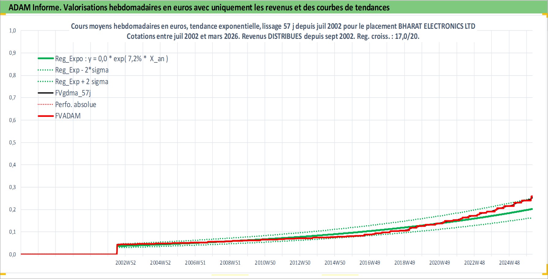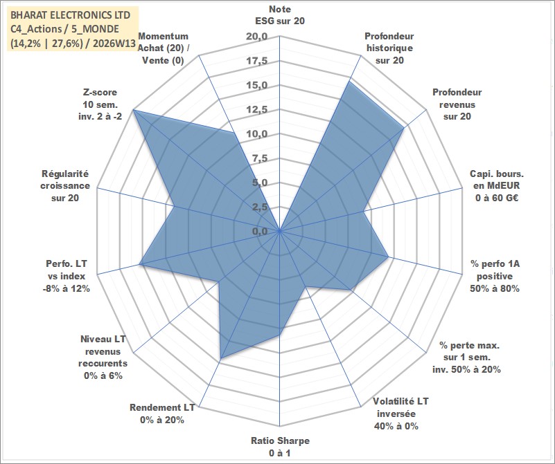 Site dédié aux investisseursPage dédiée sur site financeAnalyse des valorisations hebdomadaires de l'action BHARAT ELECTRONICS LTD. Cet actif est cote en INR. Les valorisations sont en contrevaleur EURO et couvrent les semaines 2002W27 a 2026W13. Les revenus de cet actif financier sont pris en compte depuis la semaine 2002W37. La note ESG de cet actif n'est pas connue.